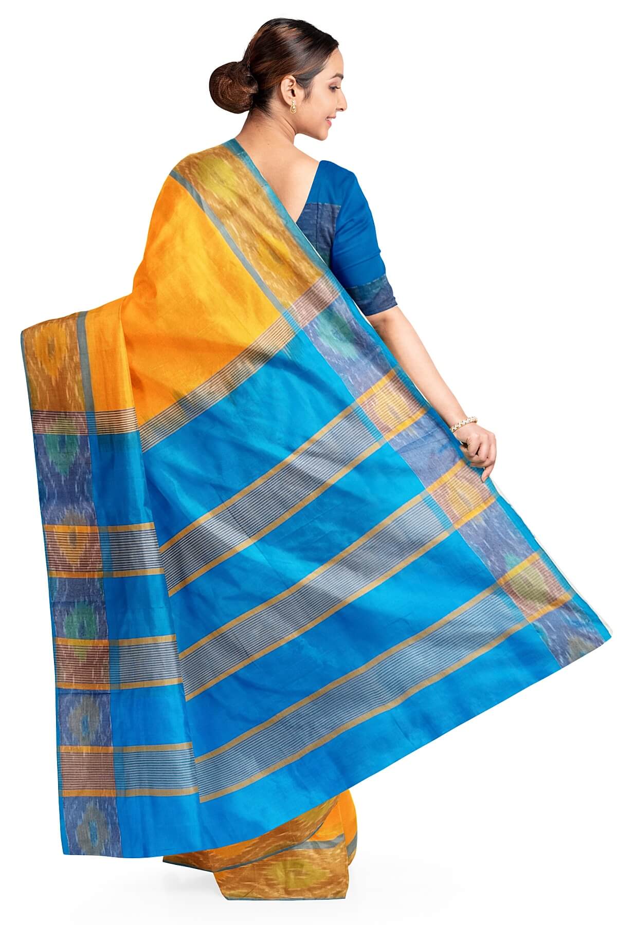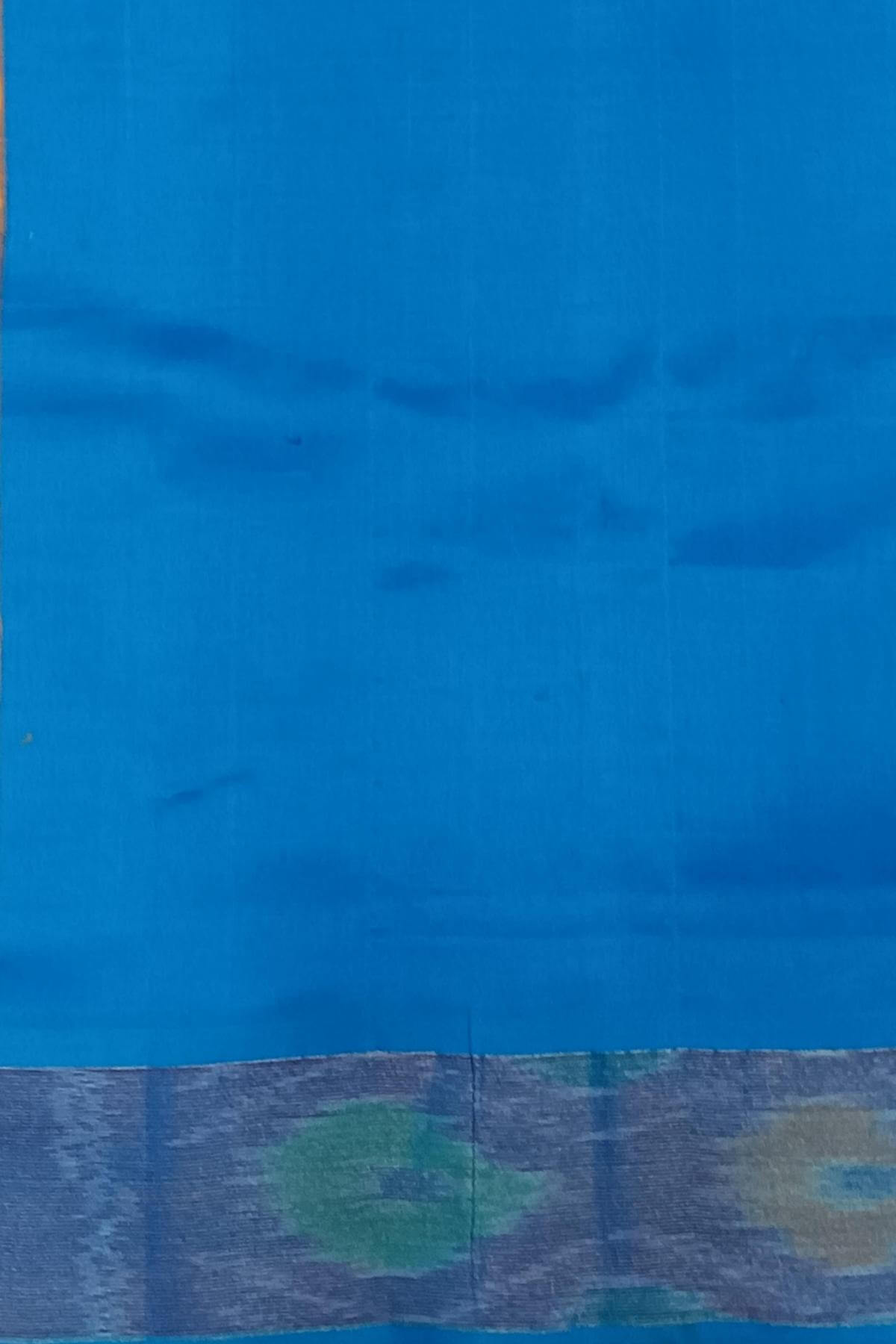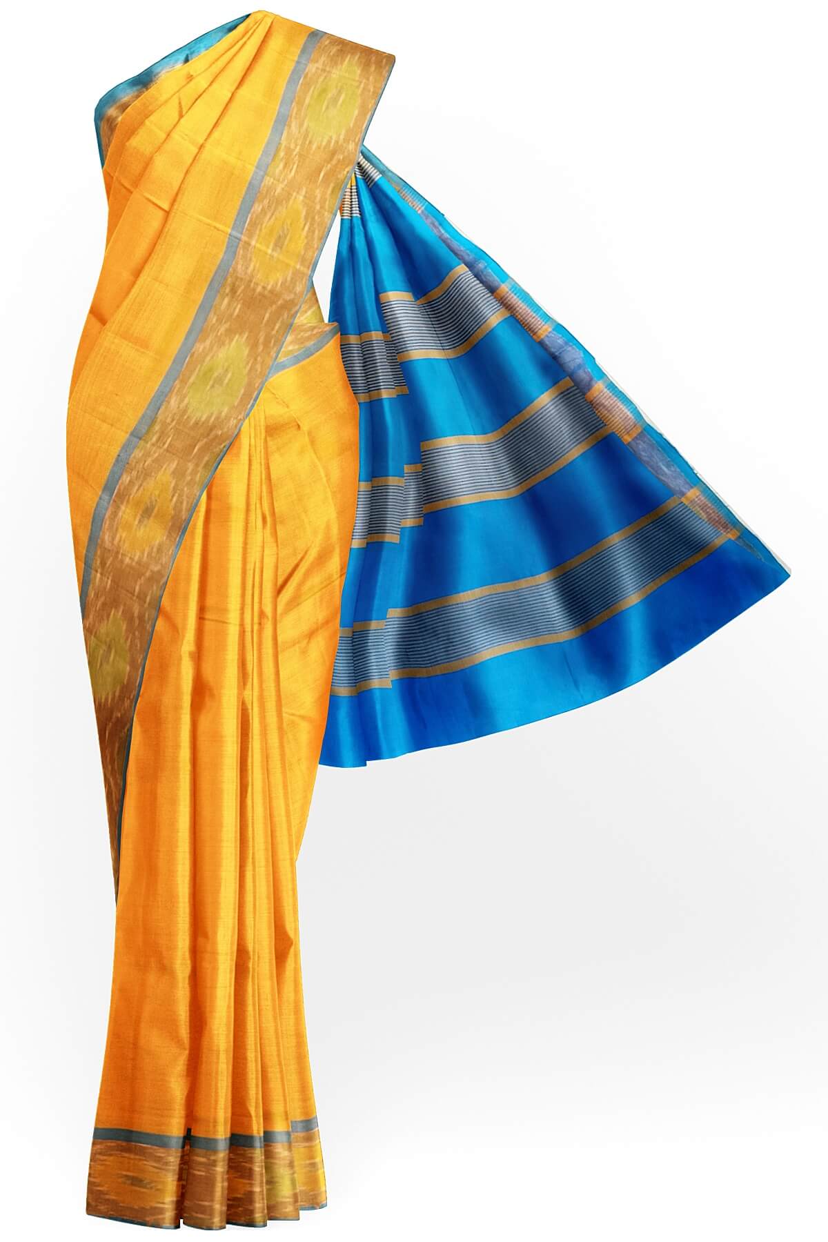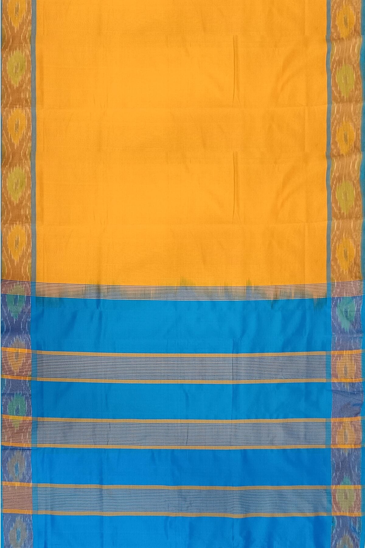 Description: Handloom Uppada silk cotton saree in mango yellow & blue with pochampalli pattern border