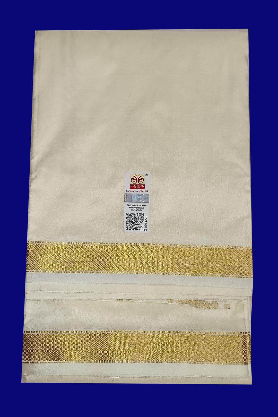 Pure silk Dhoti /Panche and Angavastram/Shalye in off white with 1 inch gold border