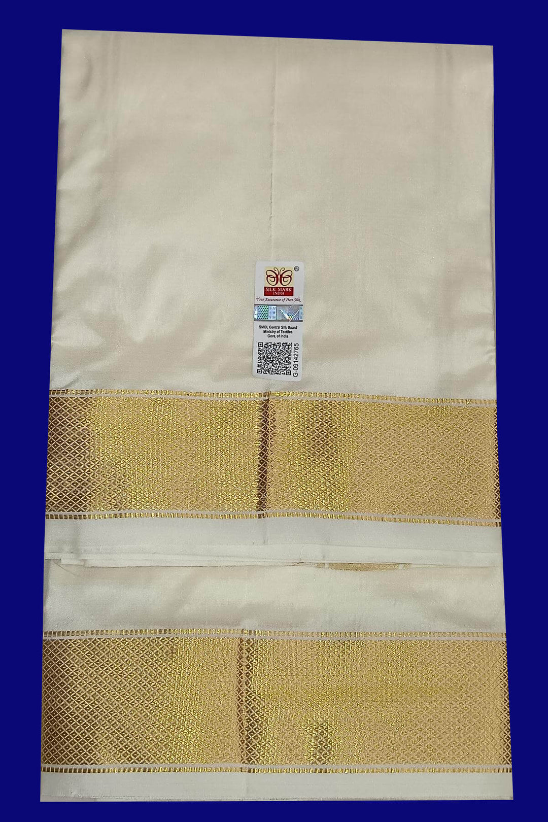 Pure silk Dhoti /Panche and Angavastram/Shalye in off white with 2 inch gold border