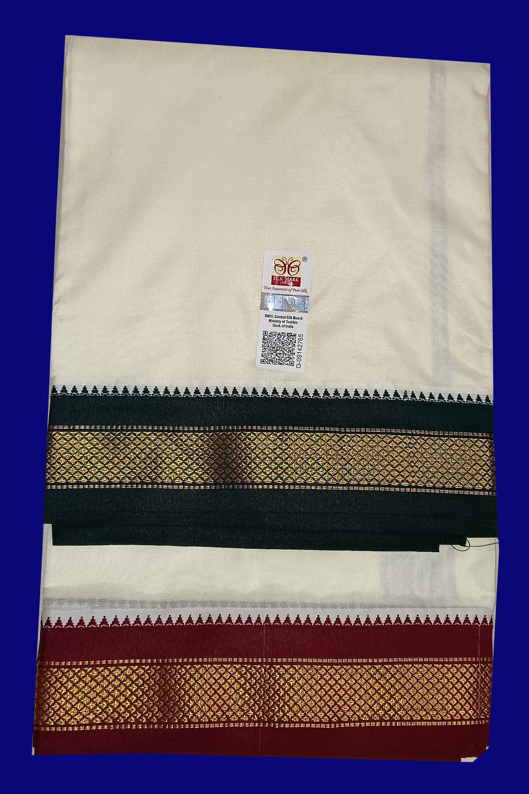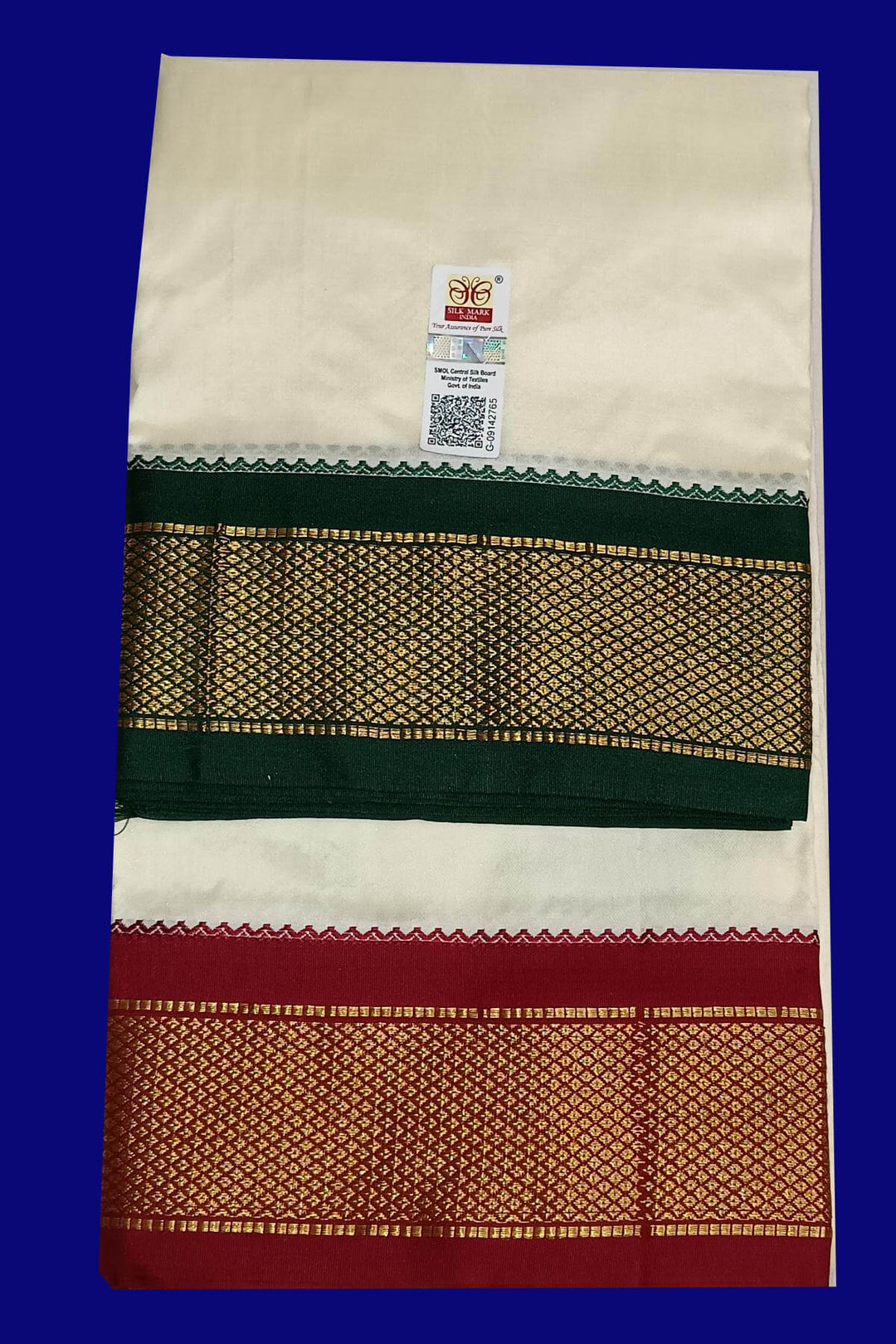 Pure silk Dhoti /Panche and Angavastram/Shelya in off white with 2 inch Ganga Jamuna border