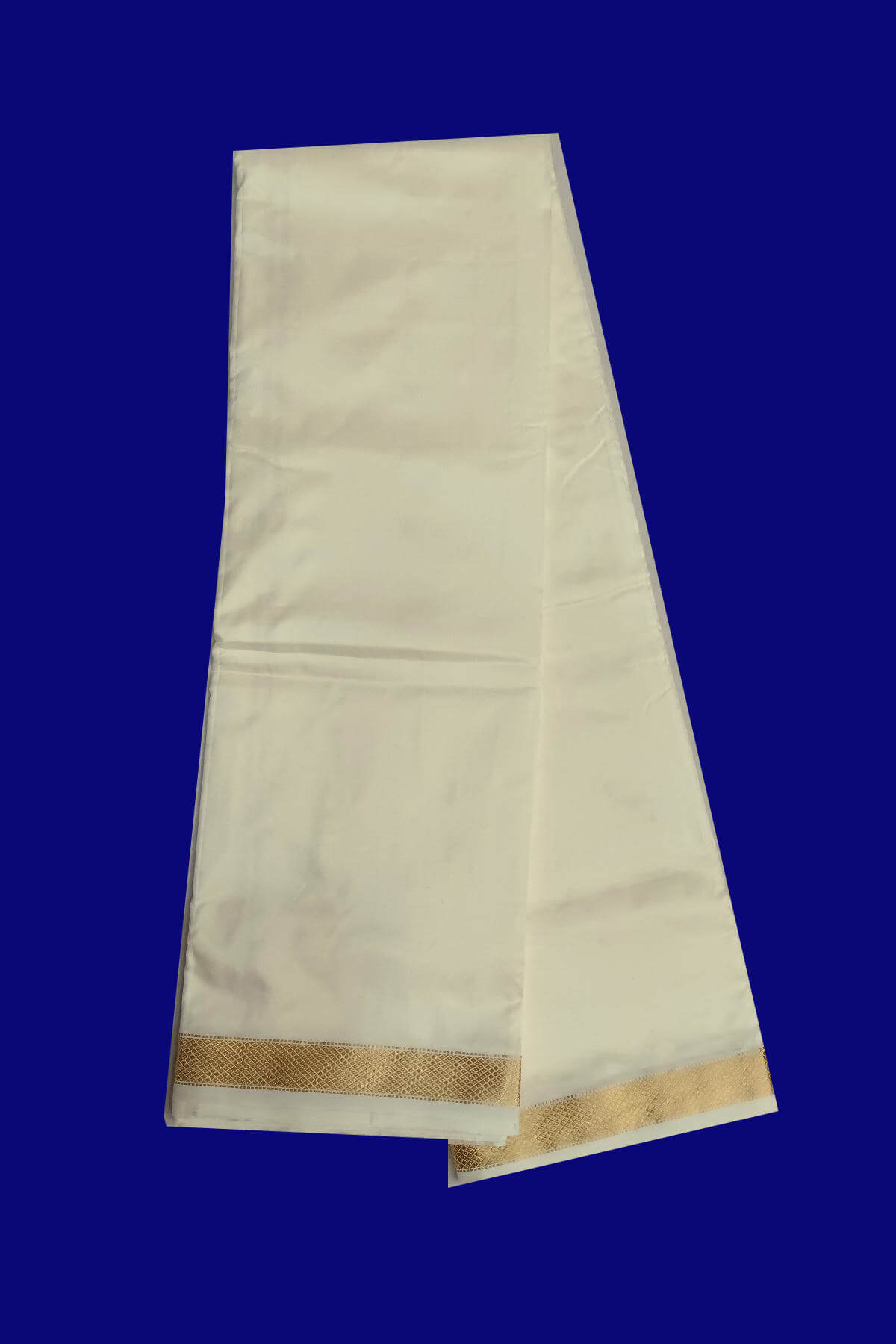 Description : Pure silk Dhoti /Panche and Angavastram/Shalye in off white with 1 inch gold border