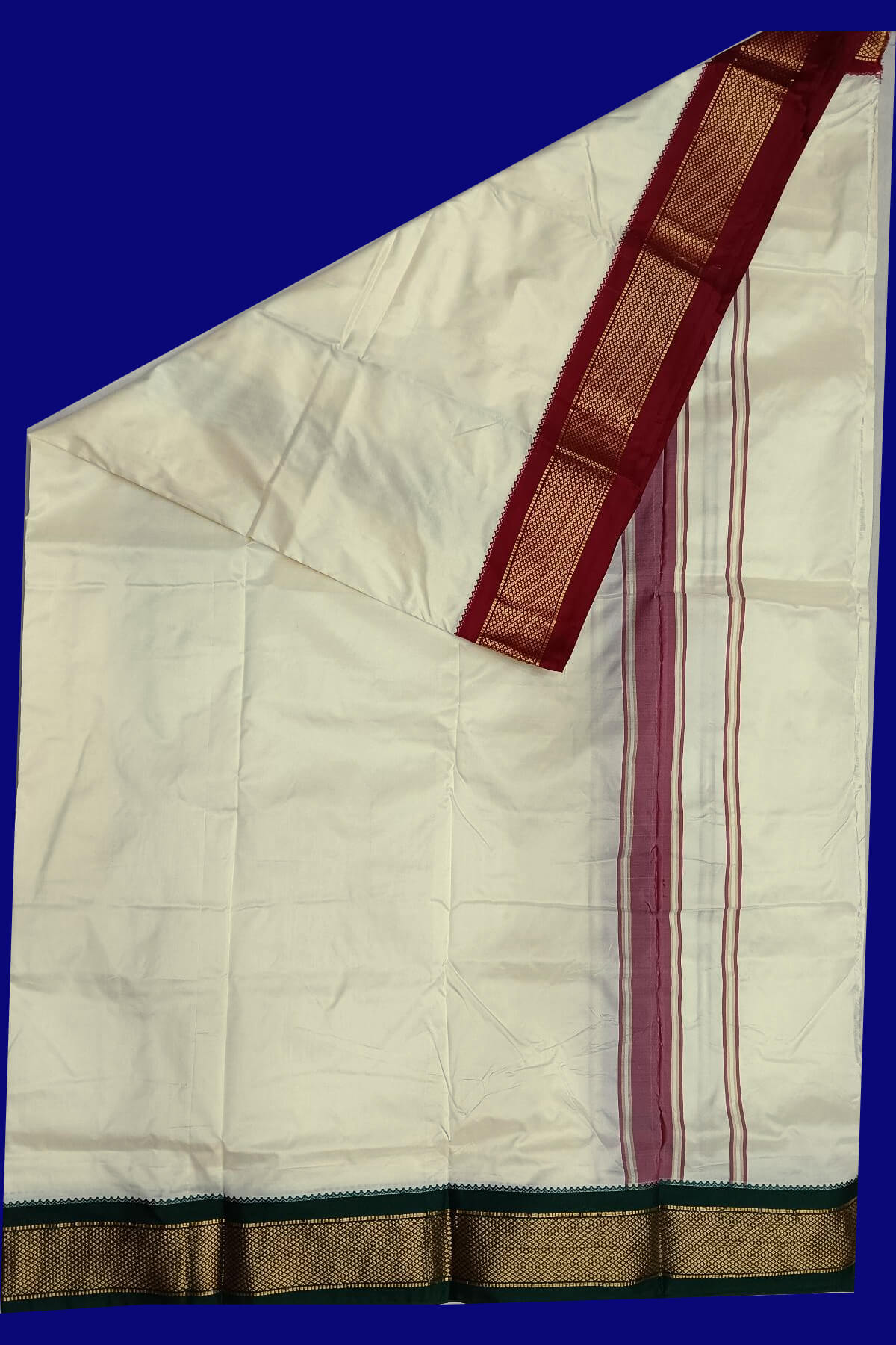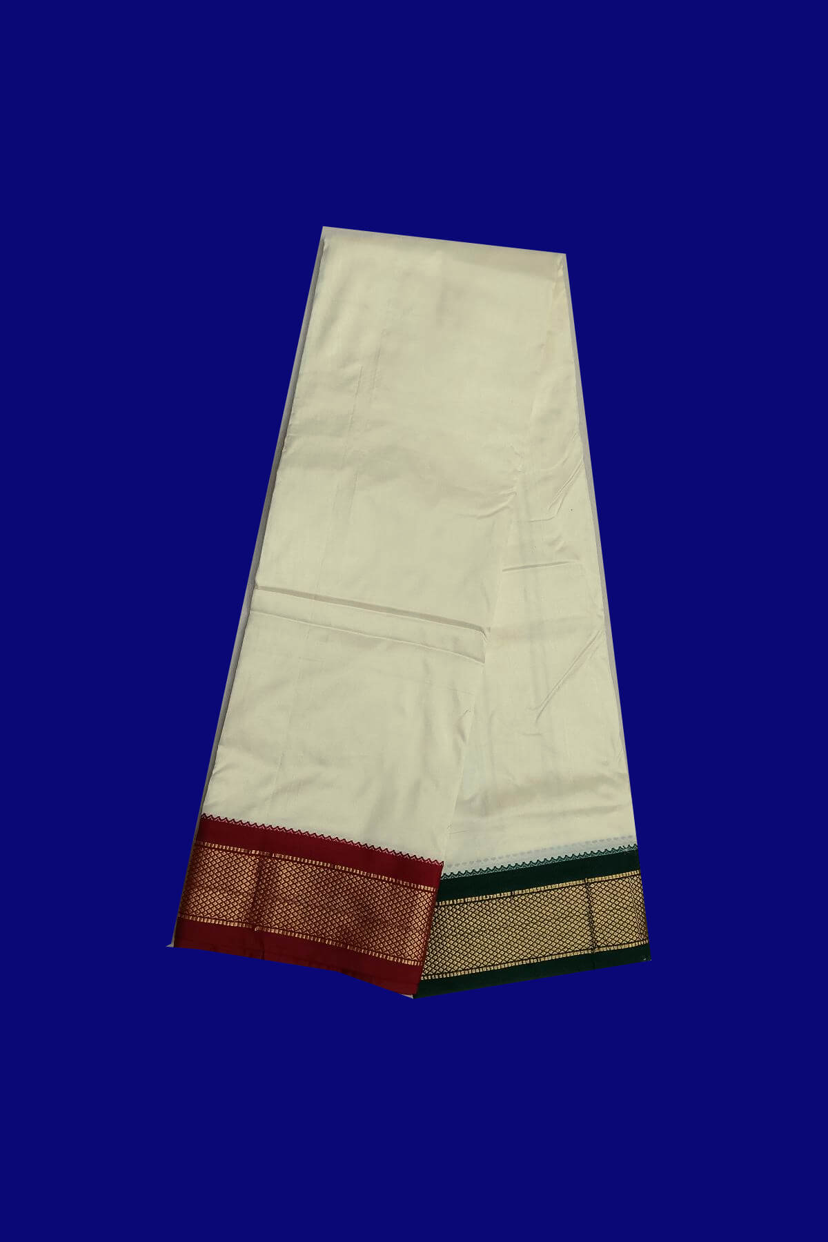 Description : Pure silk Dhoti /Panche of 4 m and Angavastram/Shelya of 2m in off white with 3.5 inch Ganga Jamuna border.