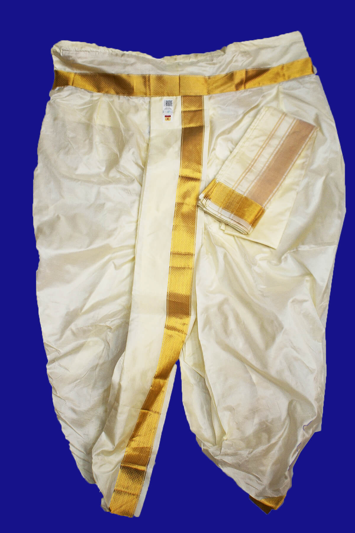 Description : Ready to wear pure silk Dhoti / Panche with Angavastram / Shelya of 2m in off white with 2 inch gold border. This has a small pocket and a zip. Easy to wear like a pyjama