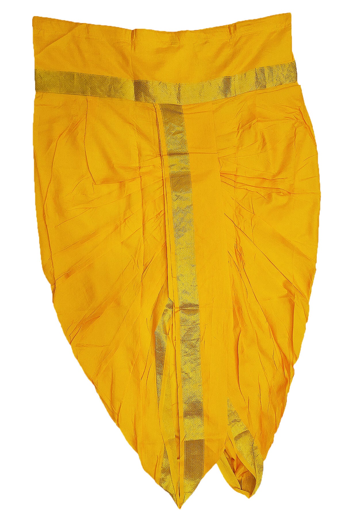 Description : Ready to wear pure silk Dhoti/Panche with Angavastram/Shelya of 2m in yellow with 2 inch gold border