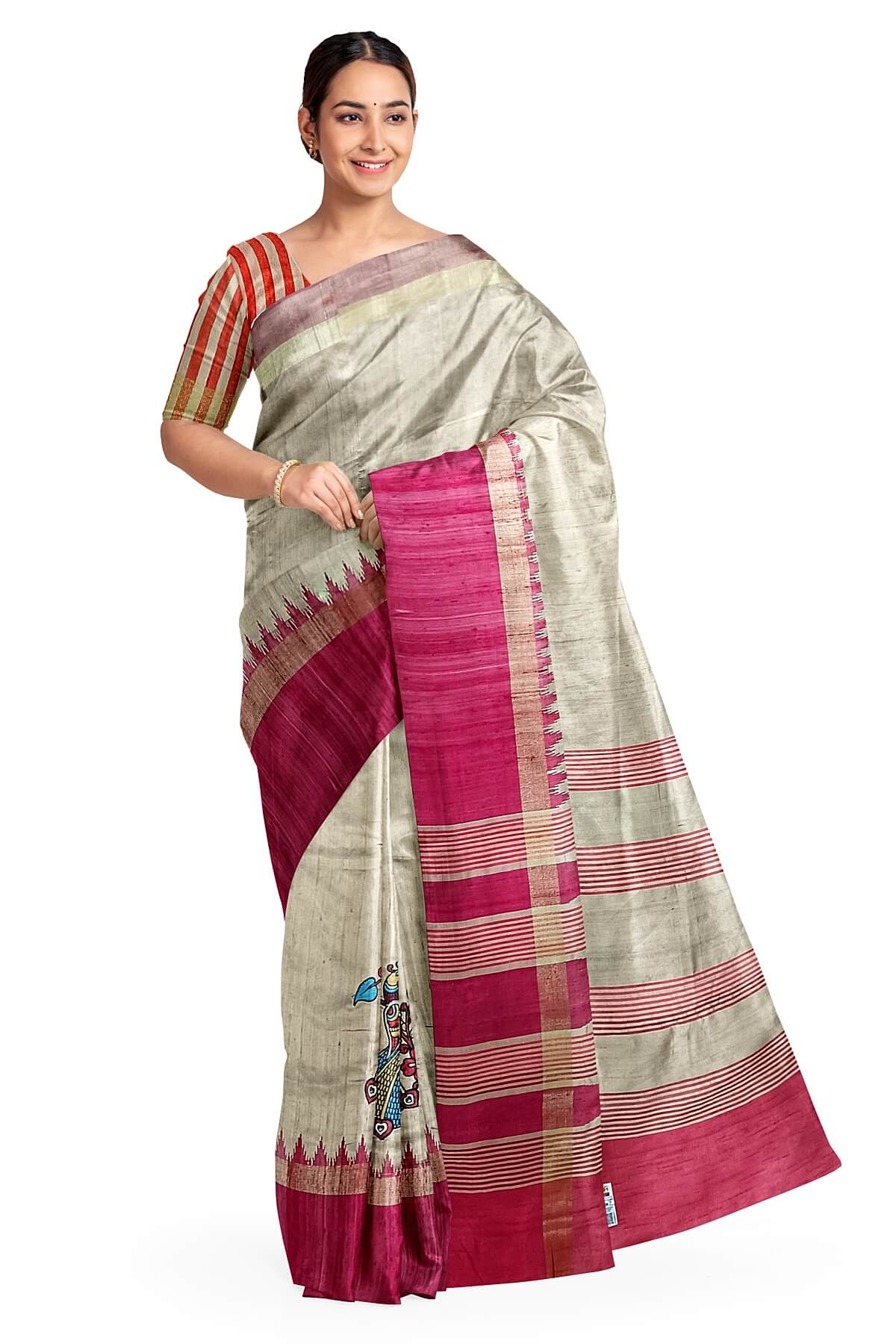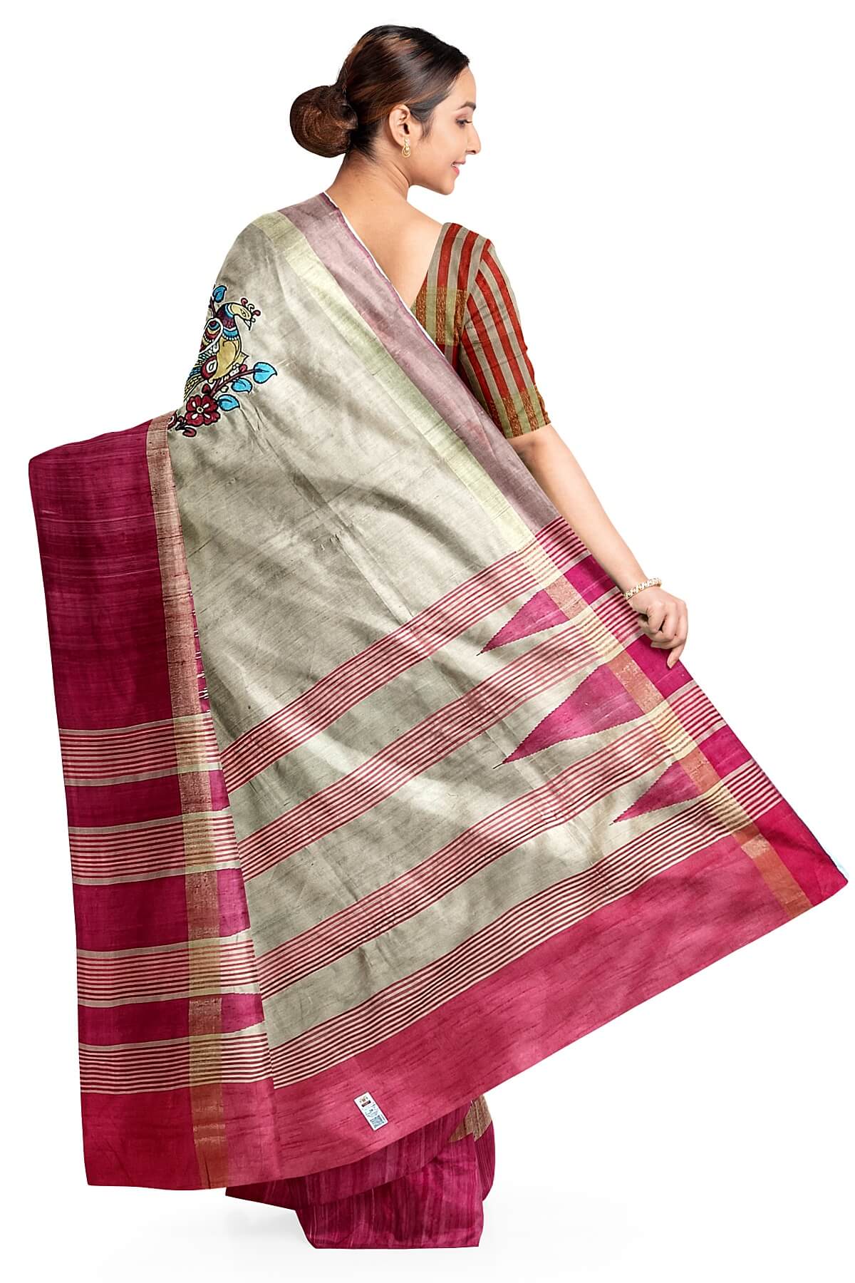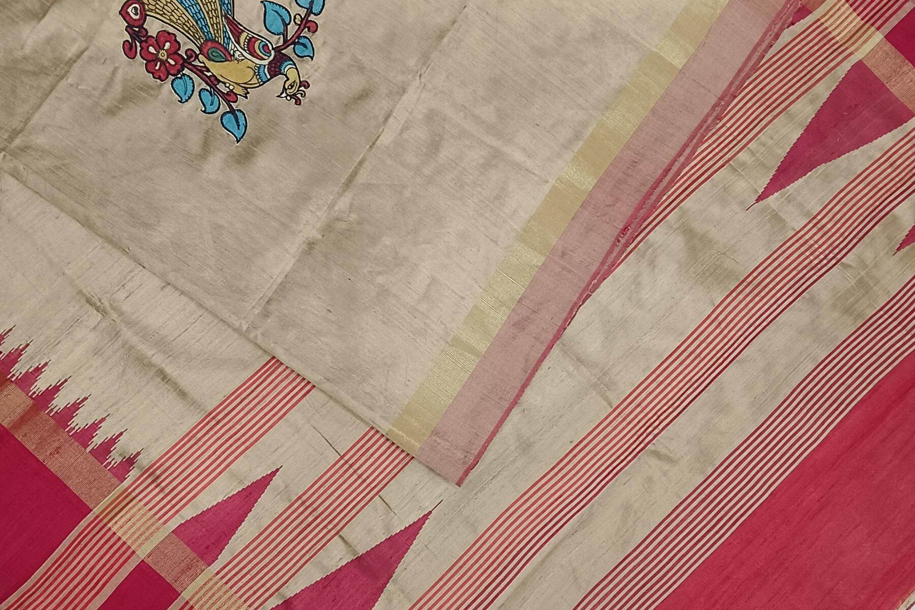 Description : Hand painted pen kalamkari applique work on tussar pure silk saree in beige . This is enhanced with temple border & striped pallu