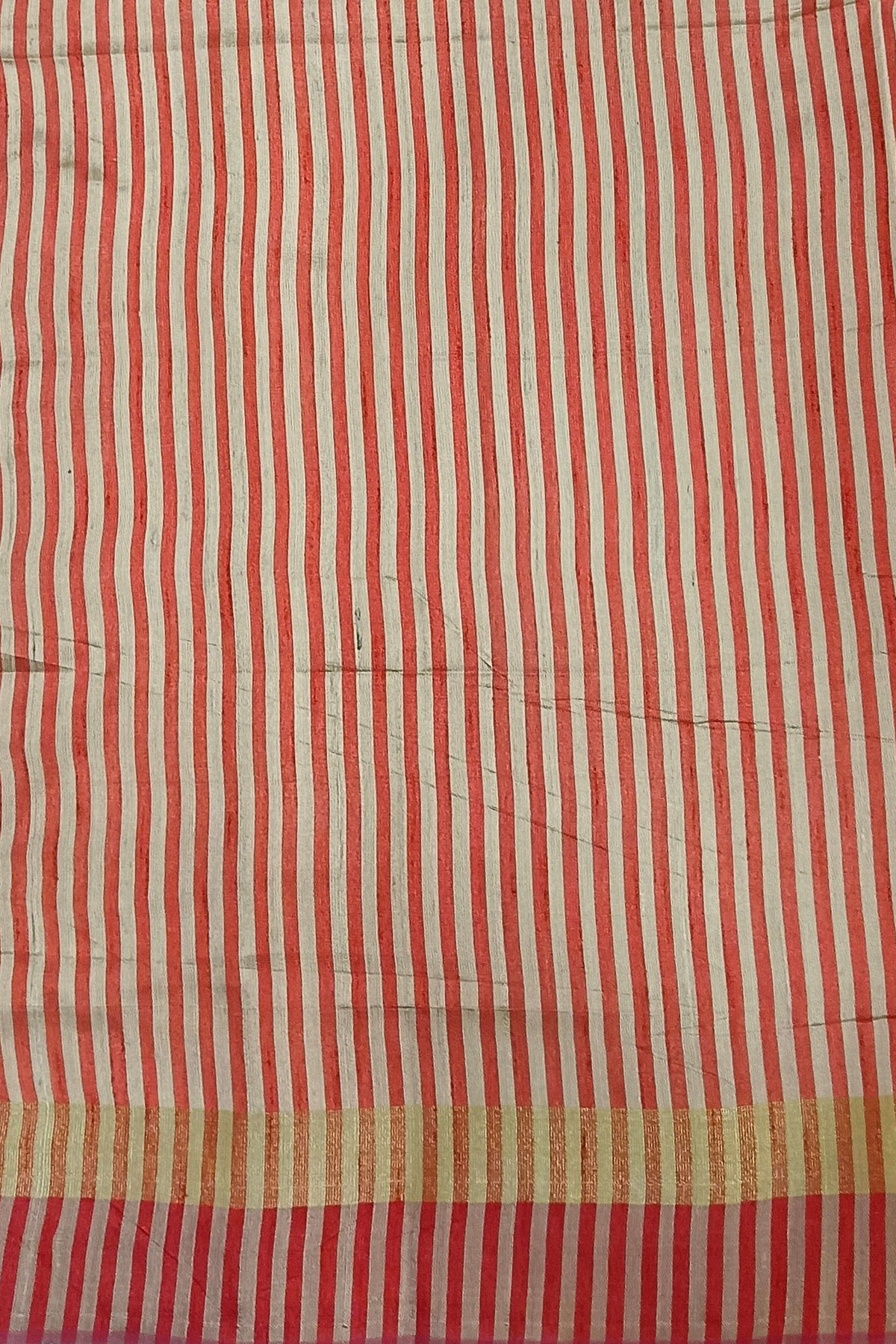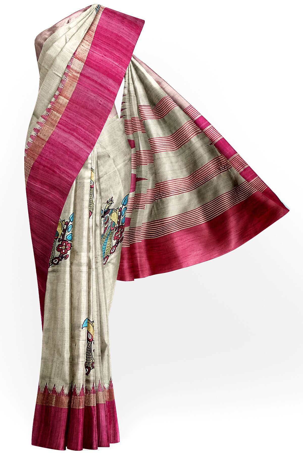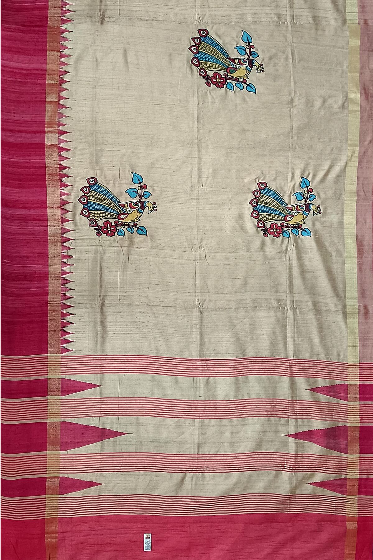 Description : Hand painted pen kalamkari applique work on tussar pure silk saree in beige . This is enhanced with temple border & striped pallu