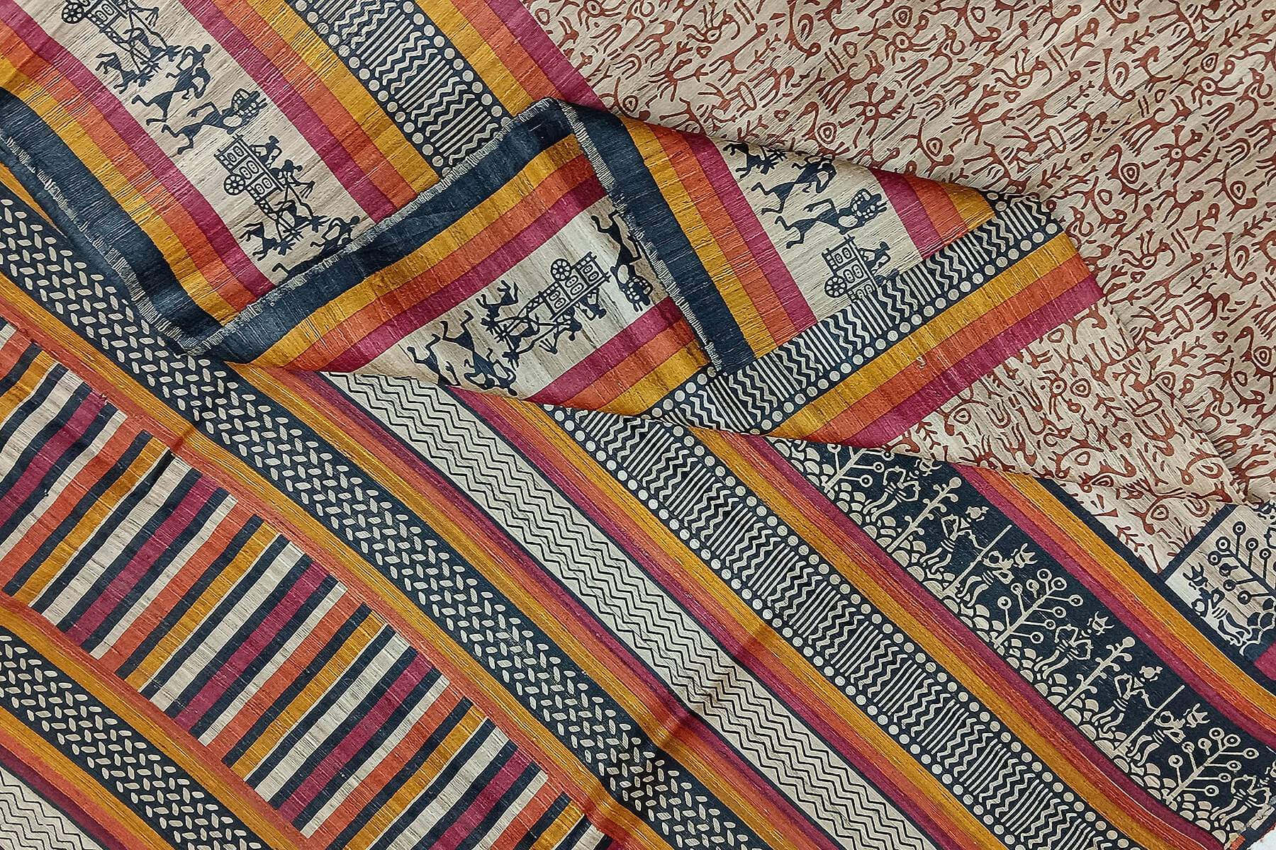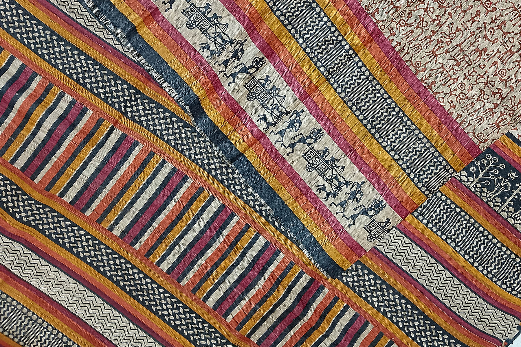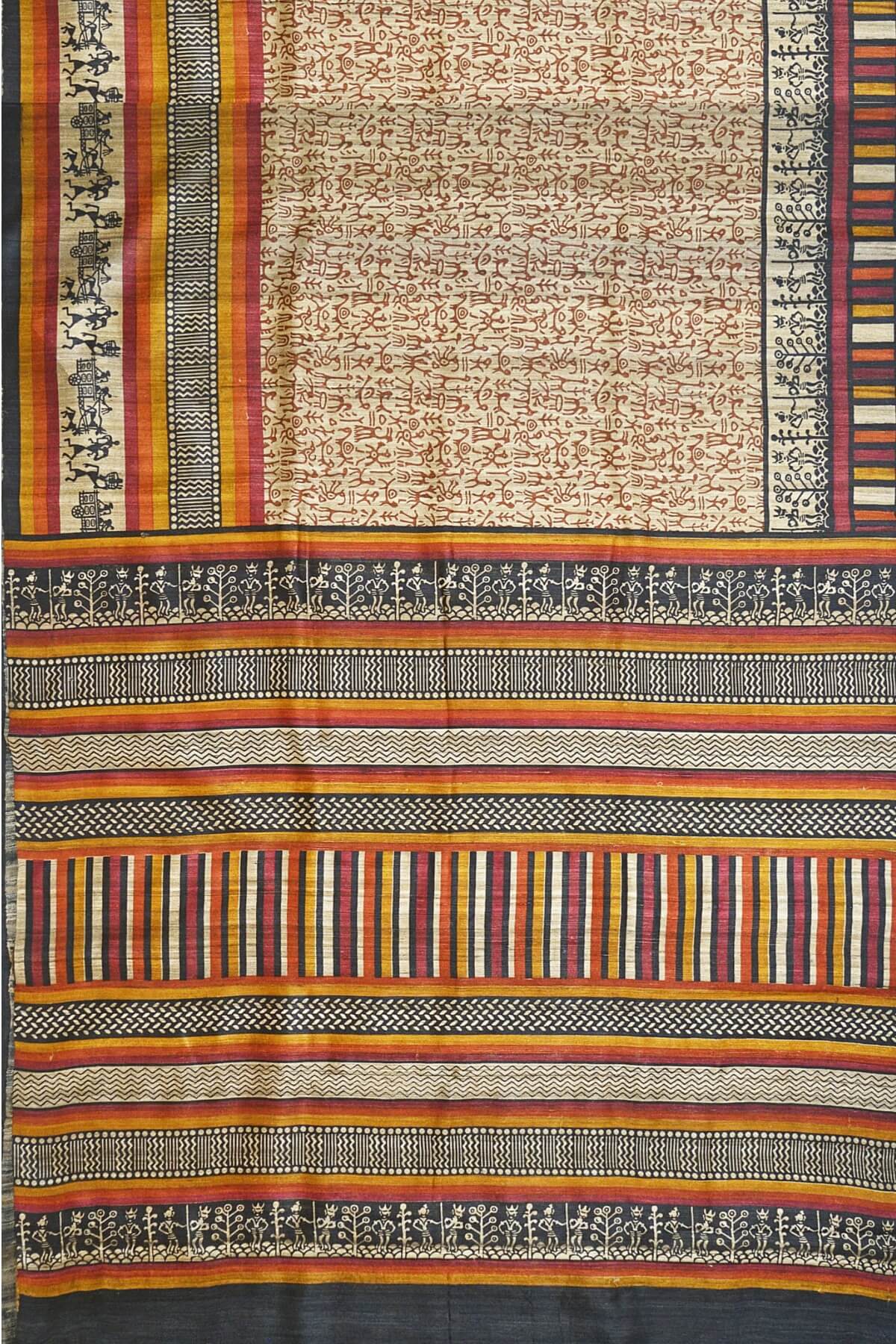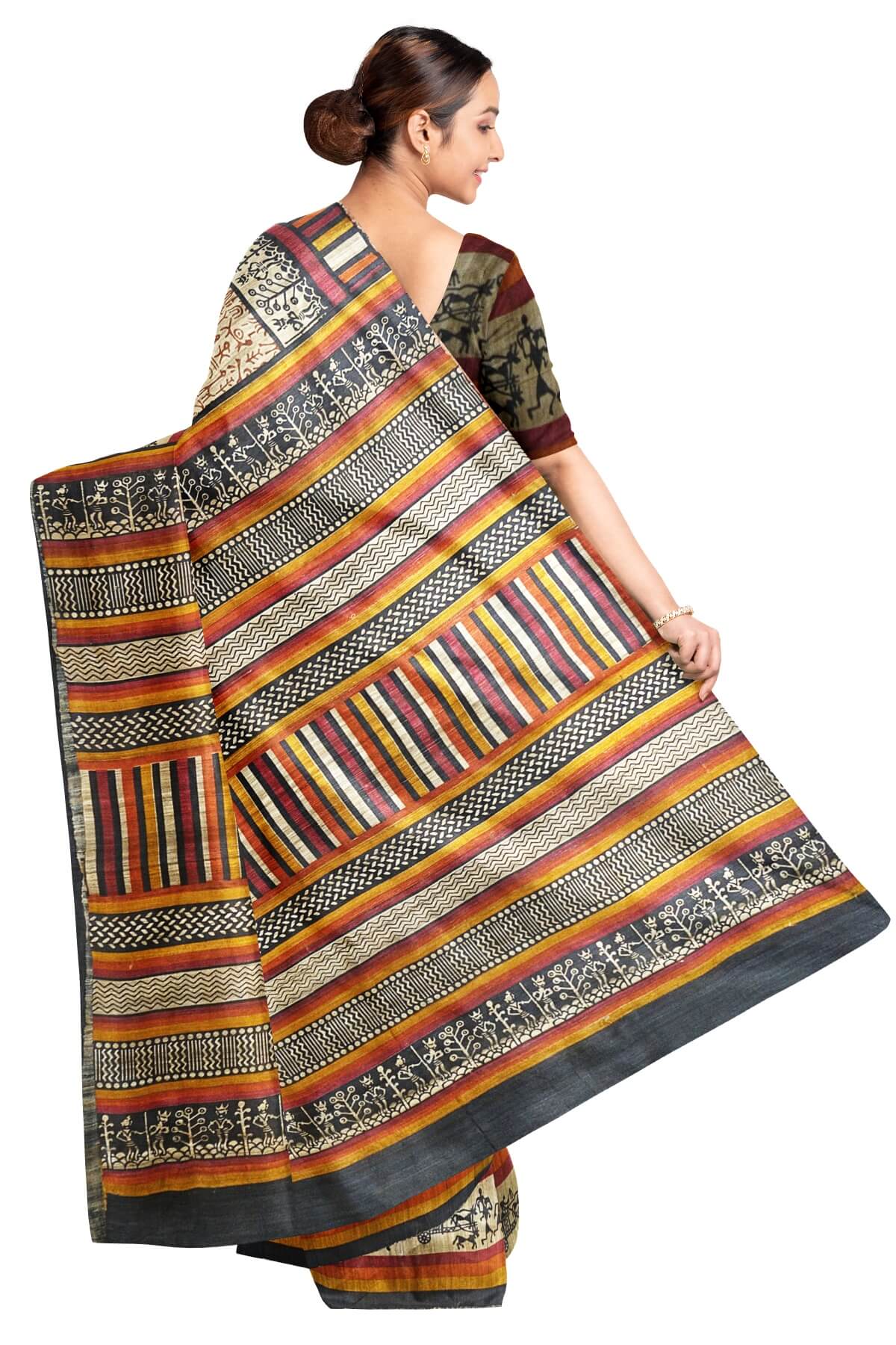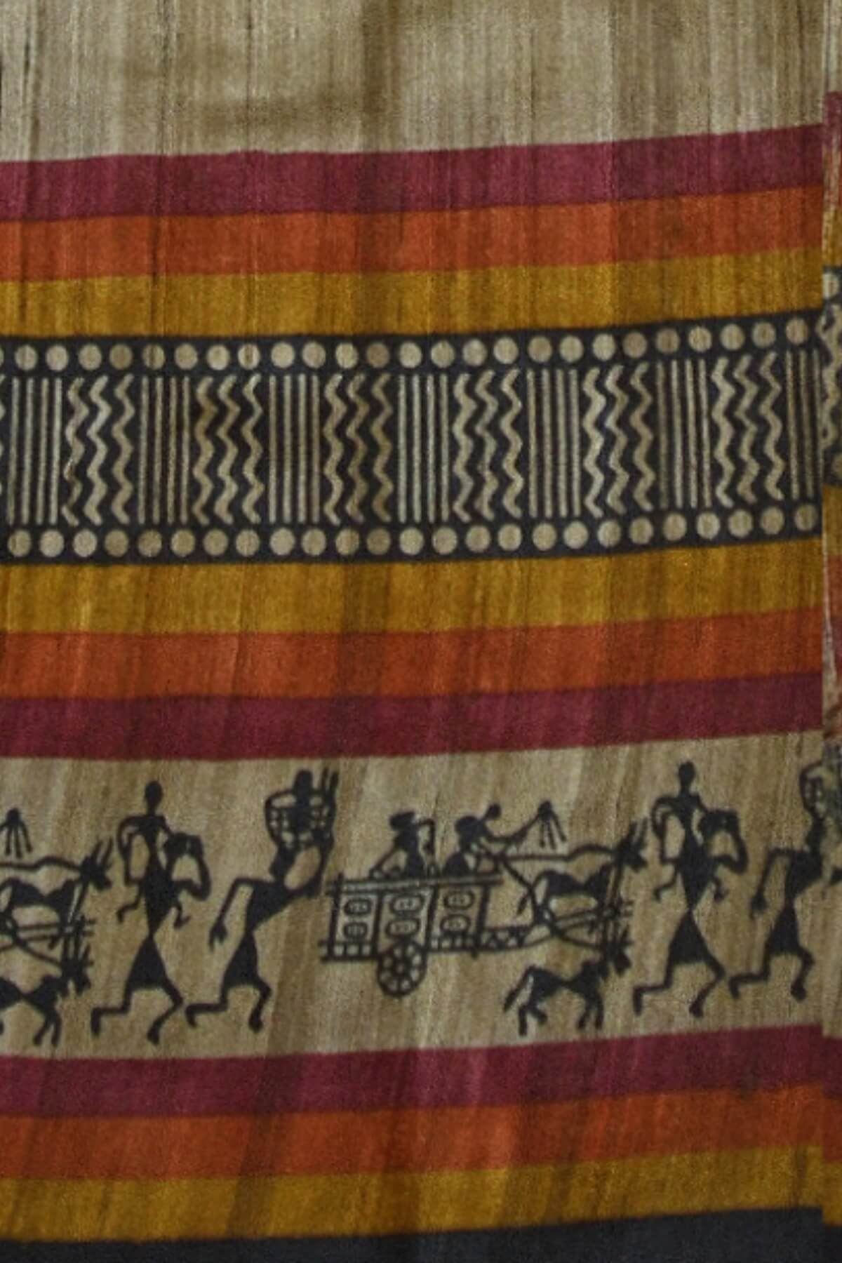 Description : Handloom desi tussar pure silk saree in tribal art pattern with multicoloured striped border