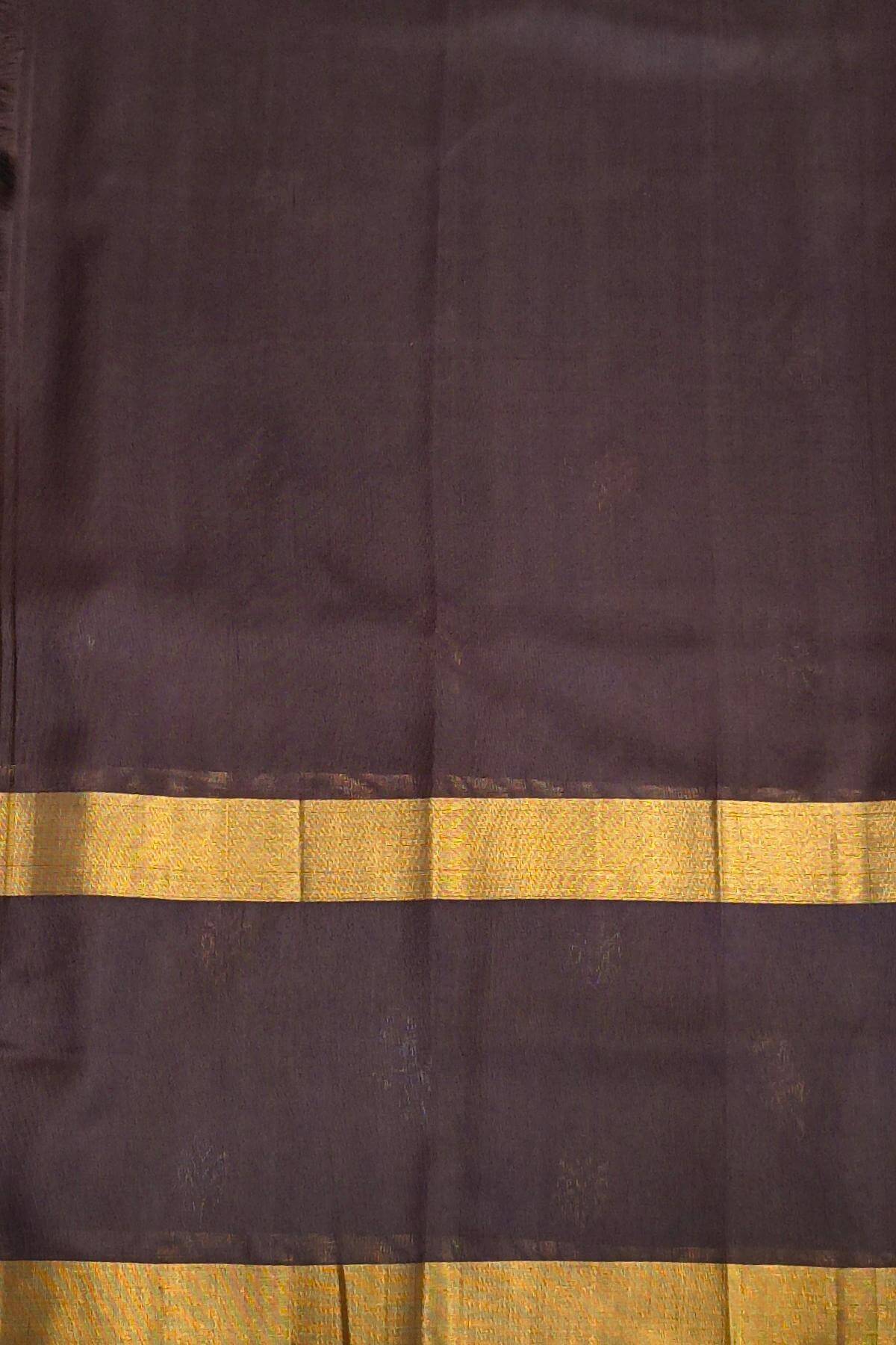 Description: Handwoven Uppada pure silk saree in olive green with gold & silver motifs with a contrast pallu and a double ( retapet) border