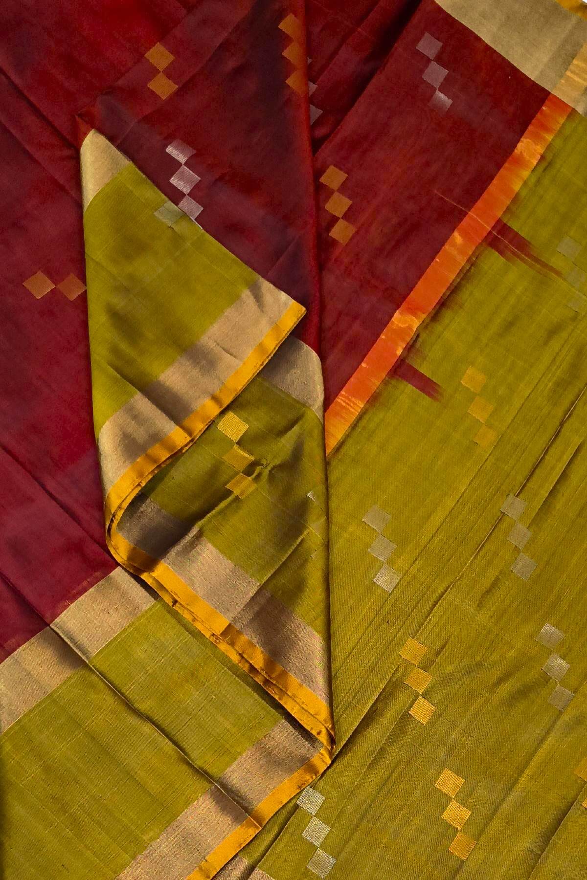 Description: Handwoven Uppada pure silk saree in rust colour with gold & silver motifs with a contrast pallu and a double ( retapet) border