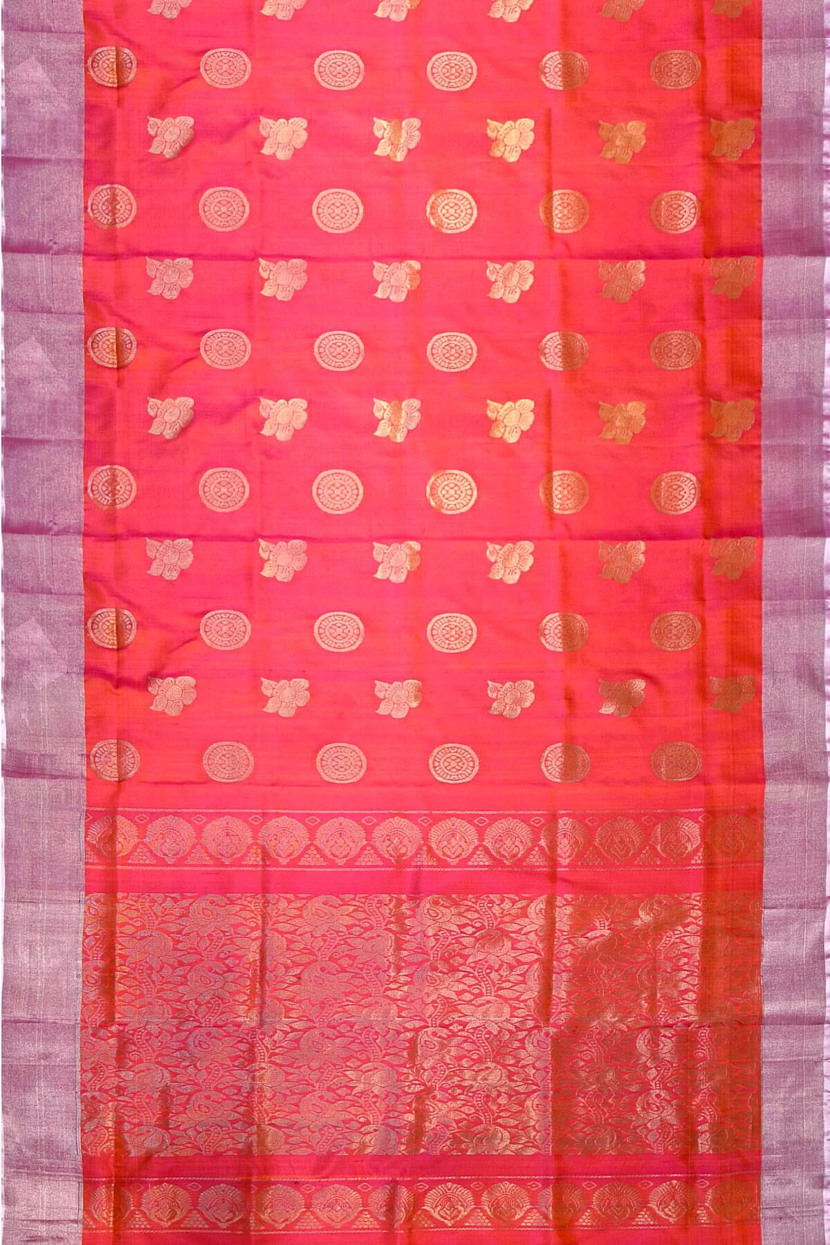 Description : Handwoven Uppada pure silk saree in two tone pink with floral motifs . This is enhanced with rich pallu & borders in silver