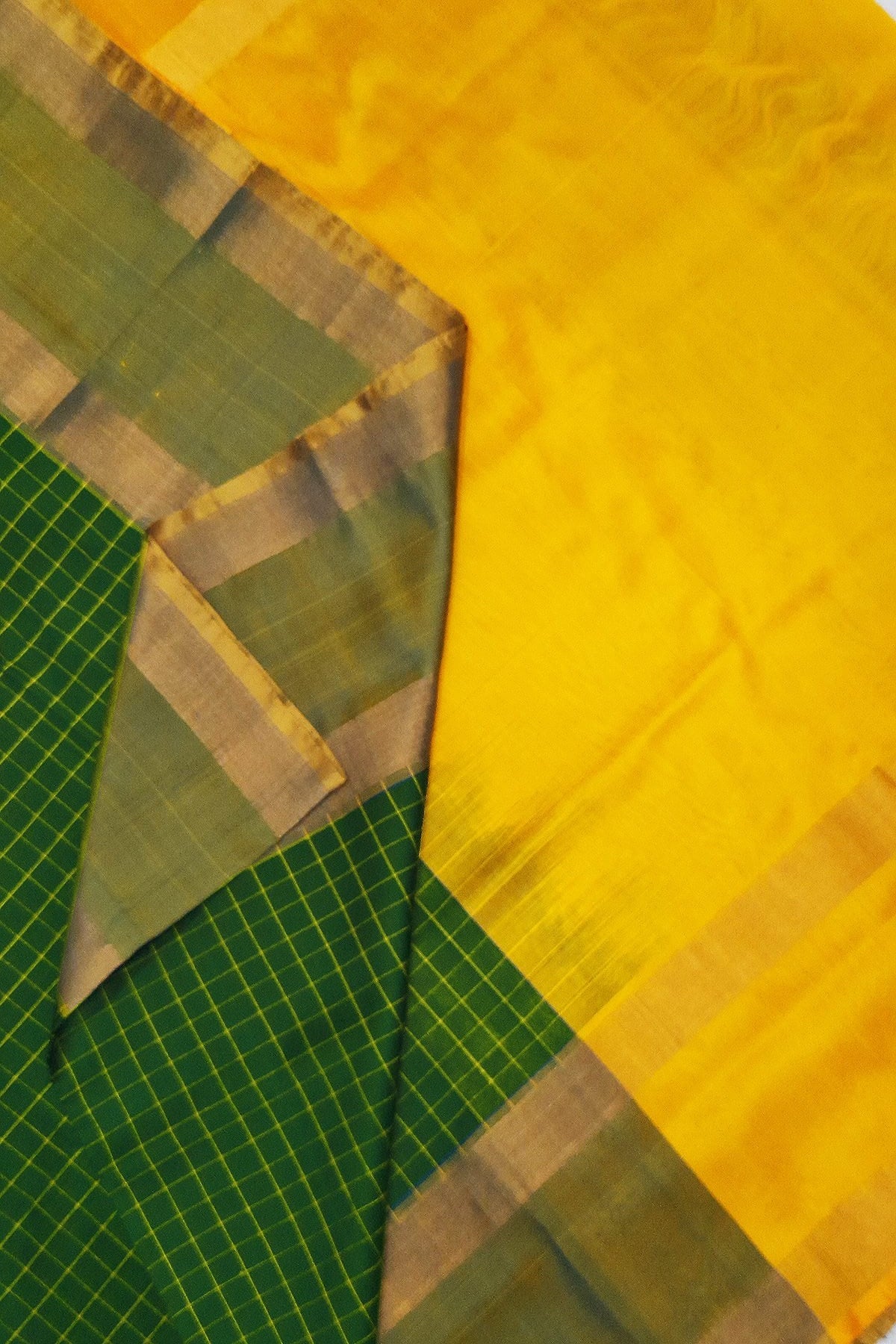 Description: Handloom Uppada pure silk saree in checks in bottle green and a contrast pallu in mustard.