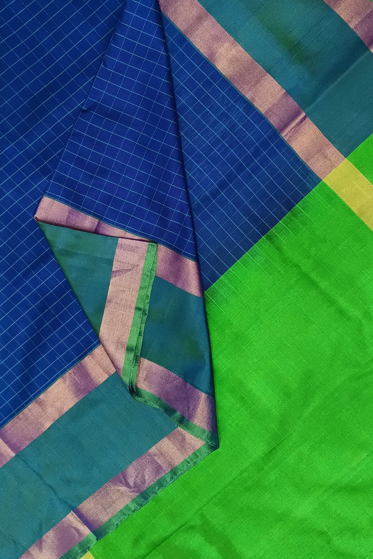 Description: Handloom Uppada pure silk saree in  checks in peacock blue  and a contrast pallu in green.