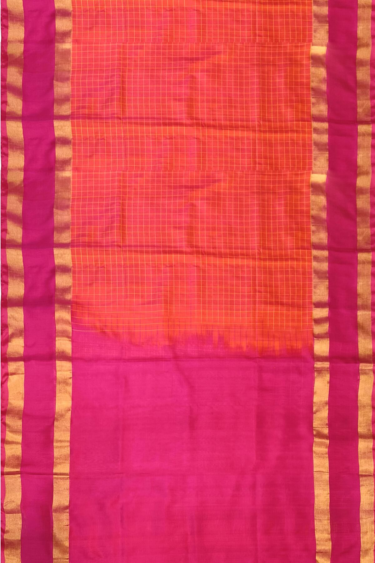 Description: Handloom Uppada pure silk saree in checks in pinkish orange and a contrast pallu in pink.