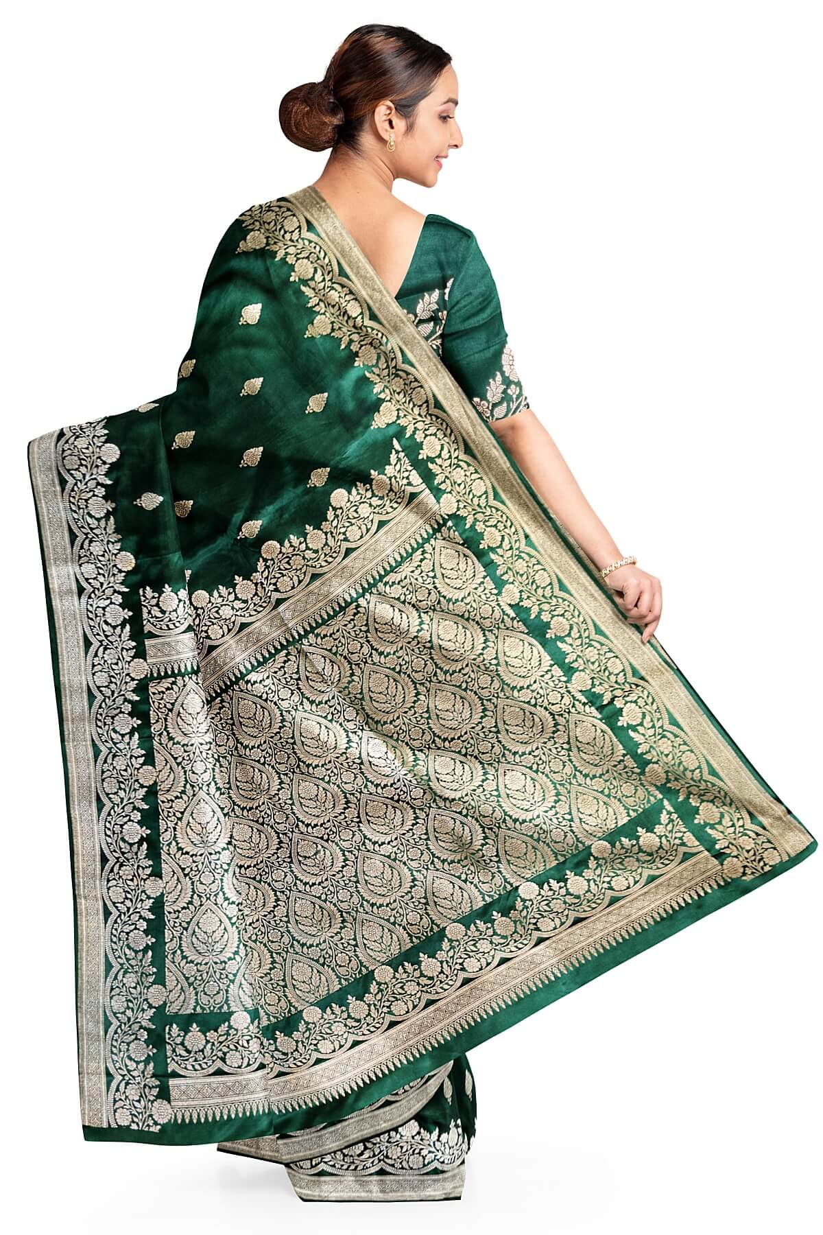 Description : Banarasi mashru silk saree in bottle green with floral motifs