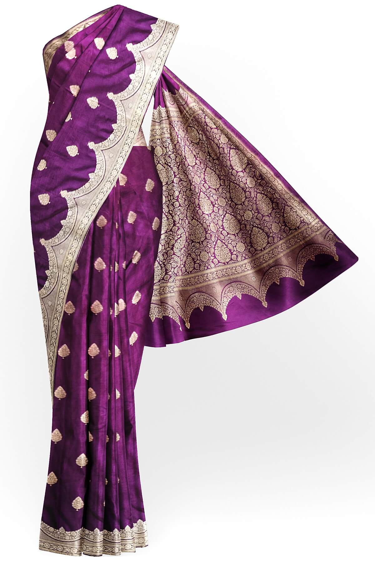 Description : Banarasi mashru silk saree in purple with floral motifs