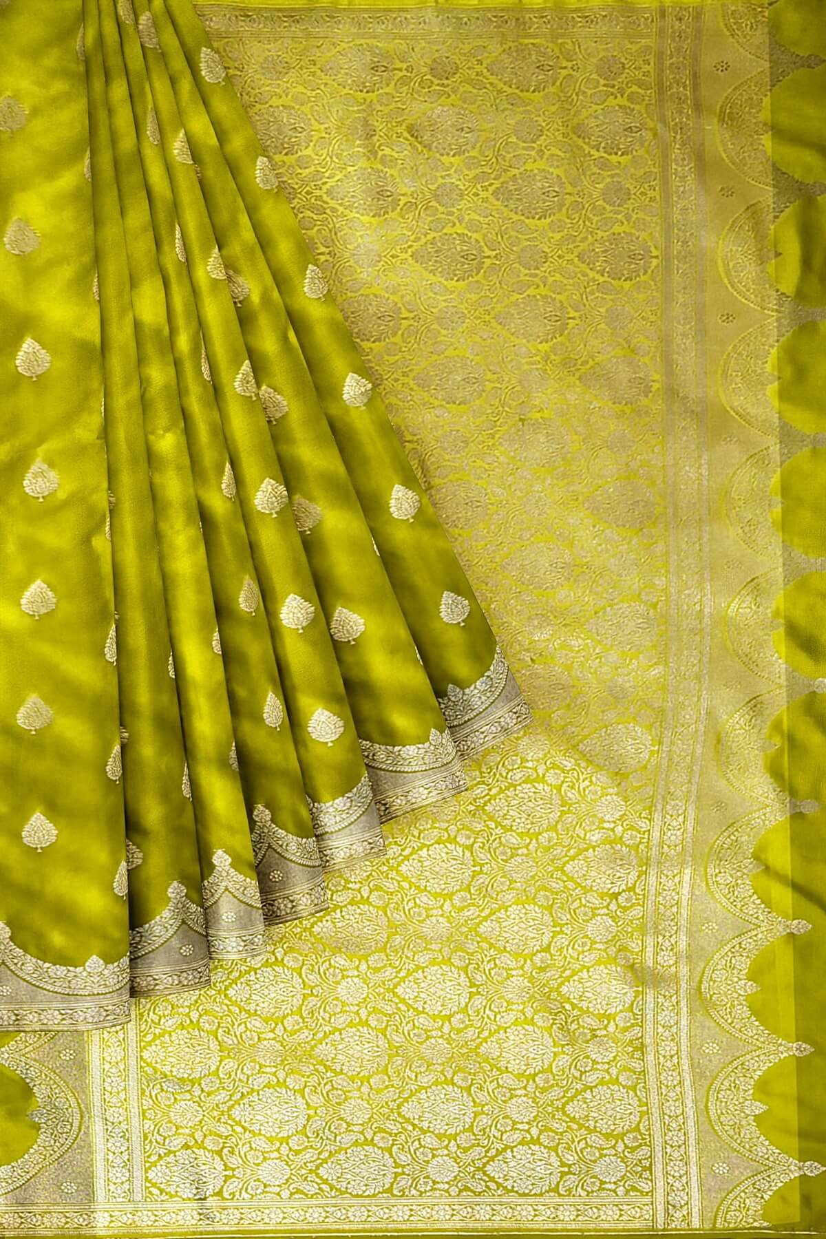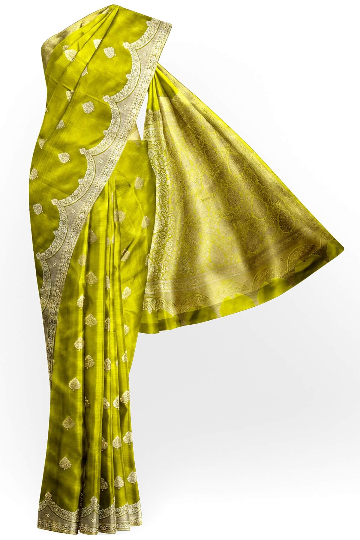 Description : Banarasi mashru silk saree in radium green with floral motifs