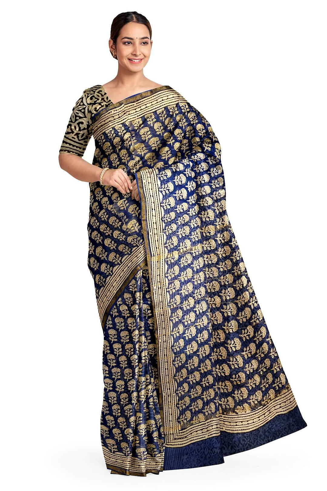Bagru hand block print on Chanderi silk cotton saree in navy blue