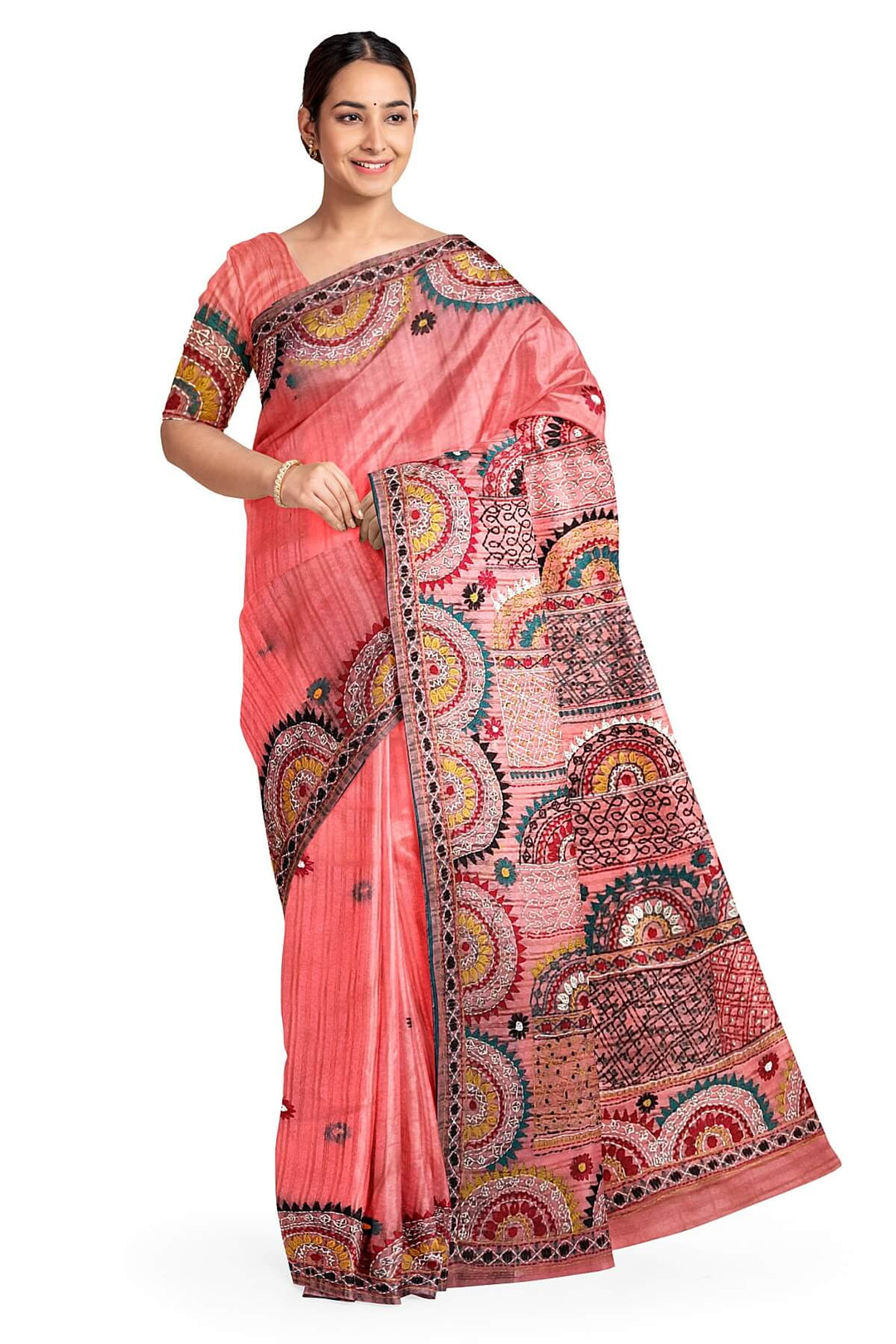 Hand block Bagru print on Chanderi silk cotton saree in red