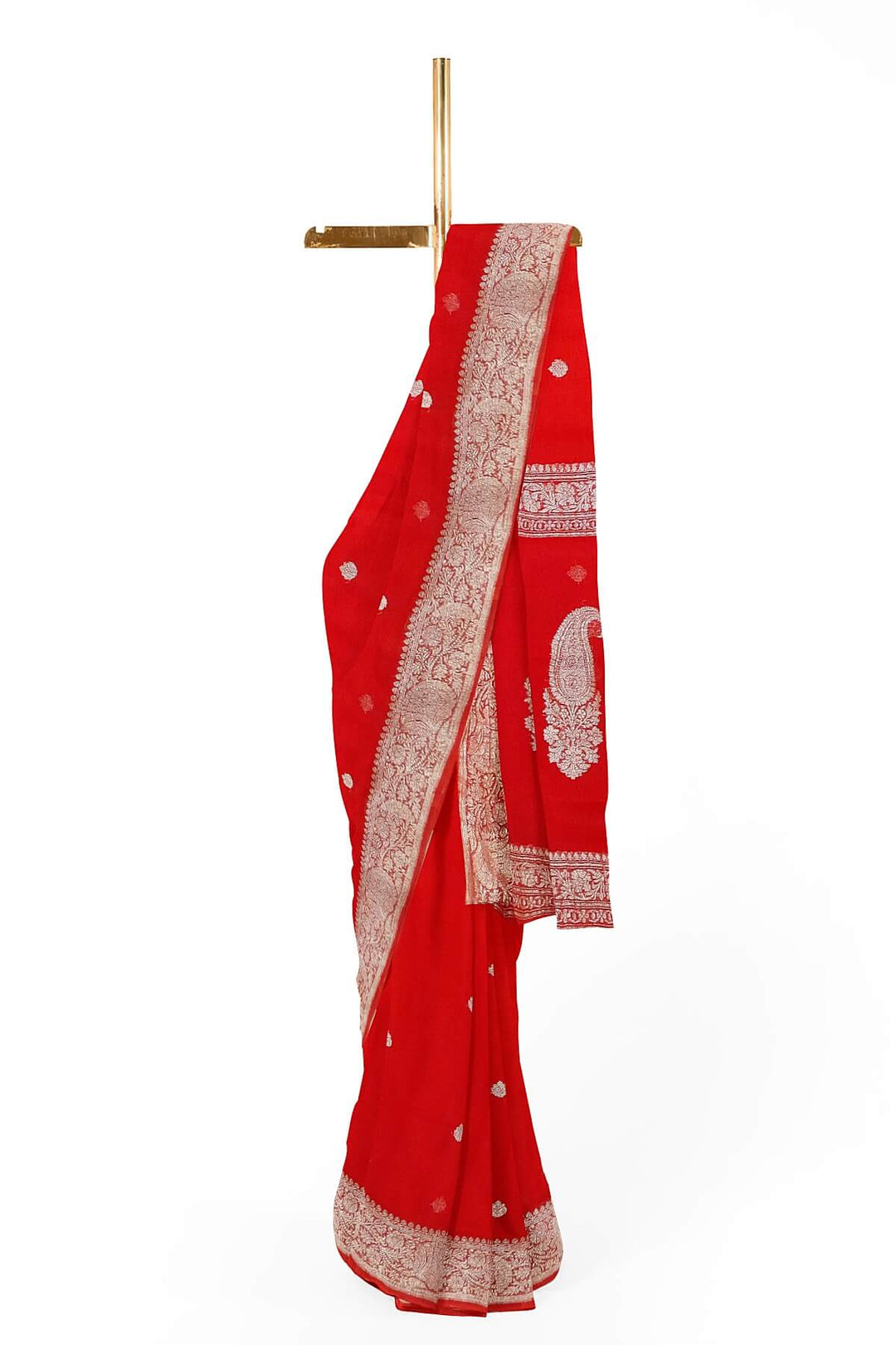 Banarasi silk chiffon saree in mustard with silver buttis & border