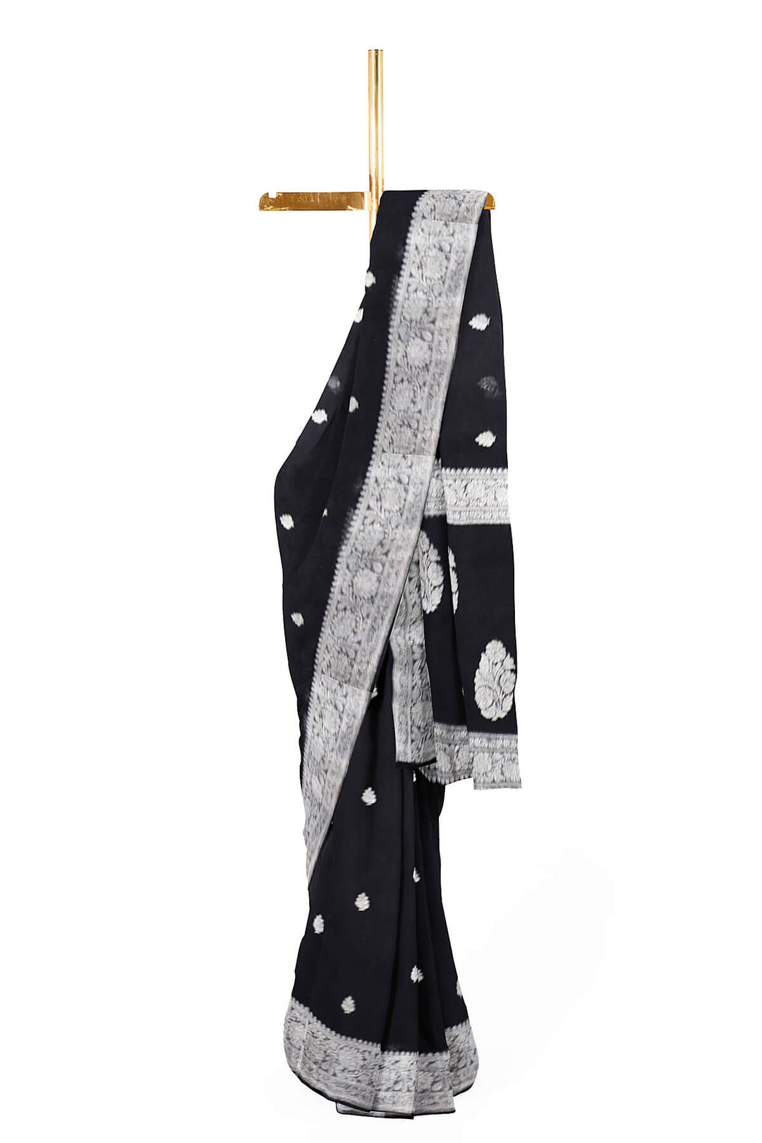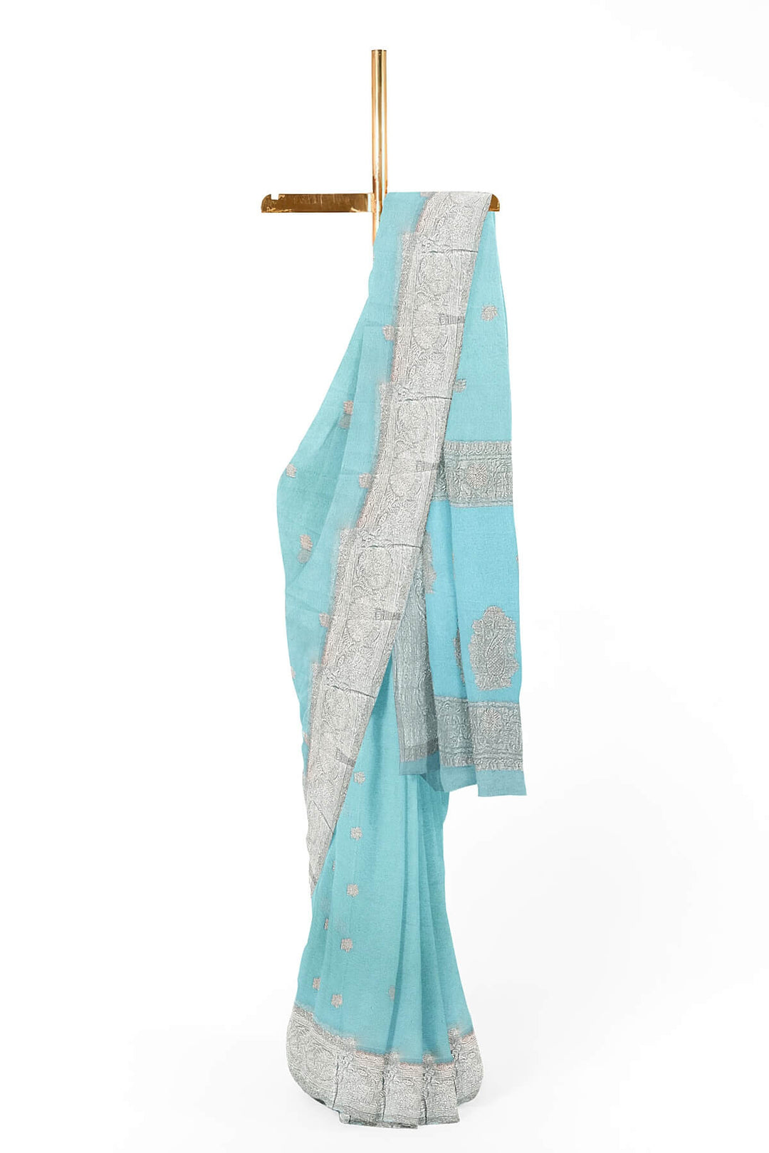 Banarasi silk chiffon saree in sea blue with silver buttis & border