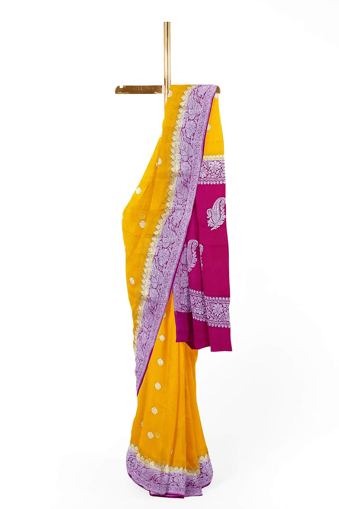 Banarasi silk chiffon saree in yellow with silver buttis & border
