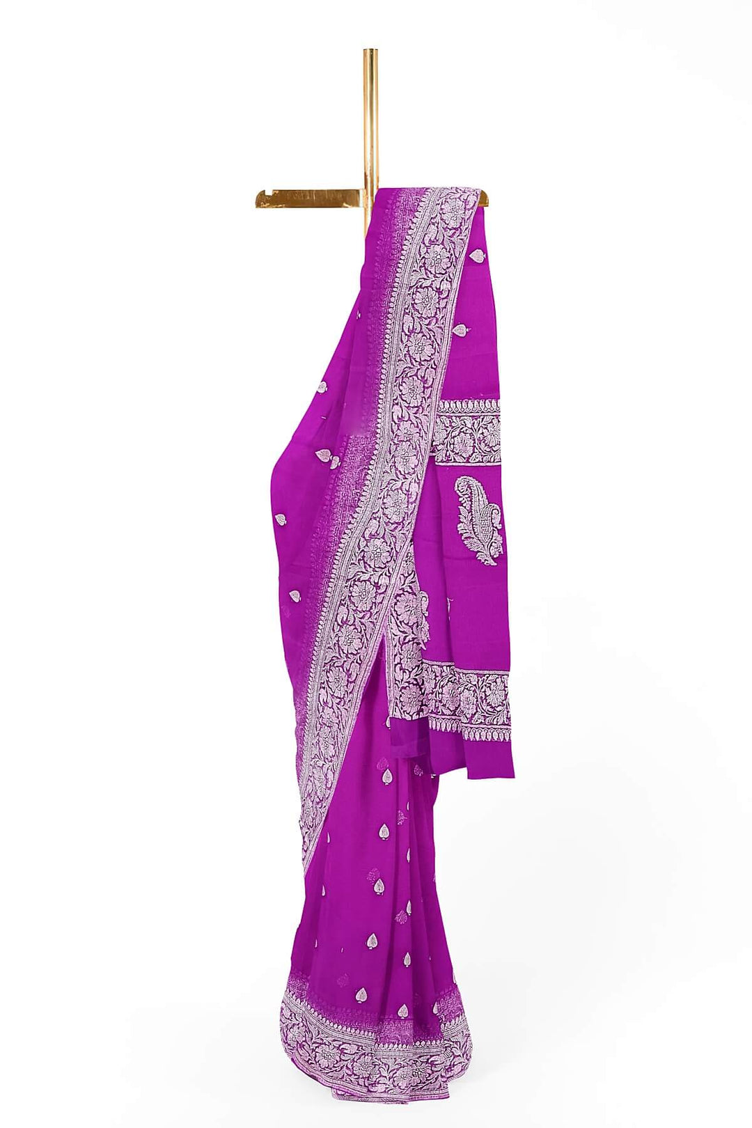 Banarasi silk chiffon saree in purple with silver buttis & border