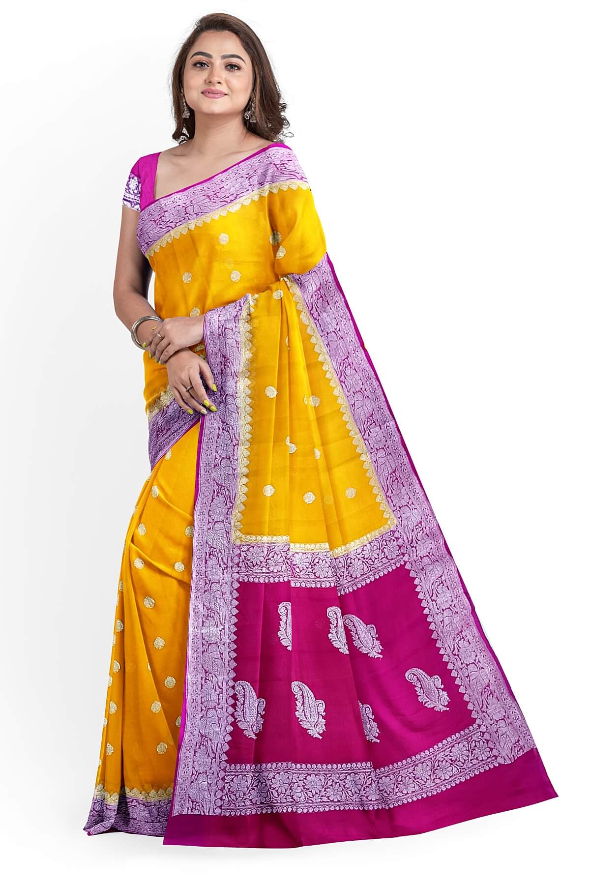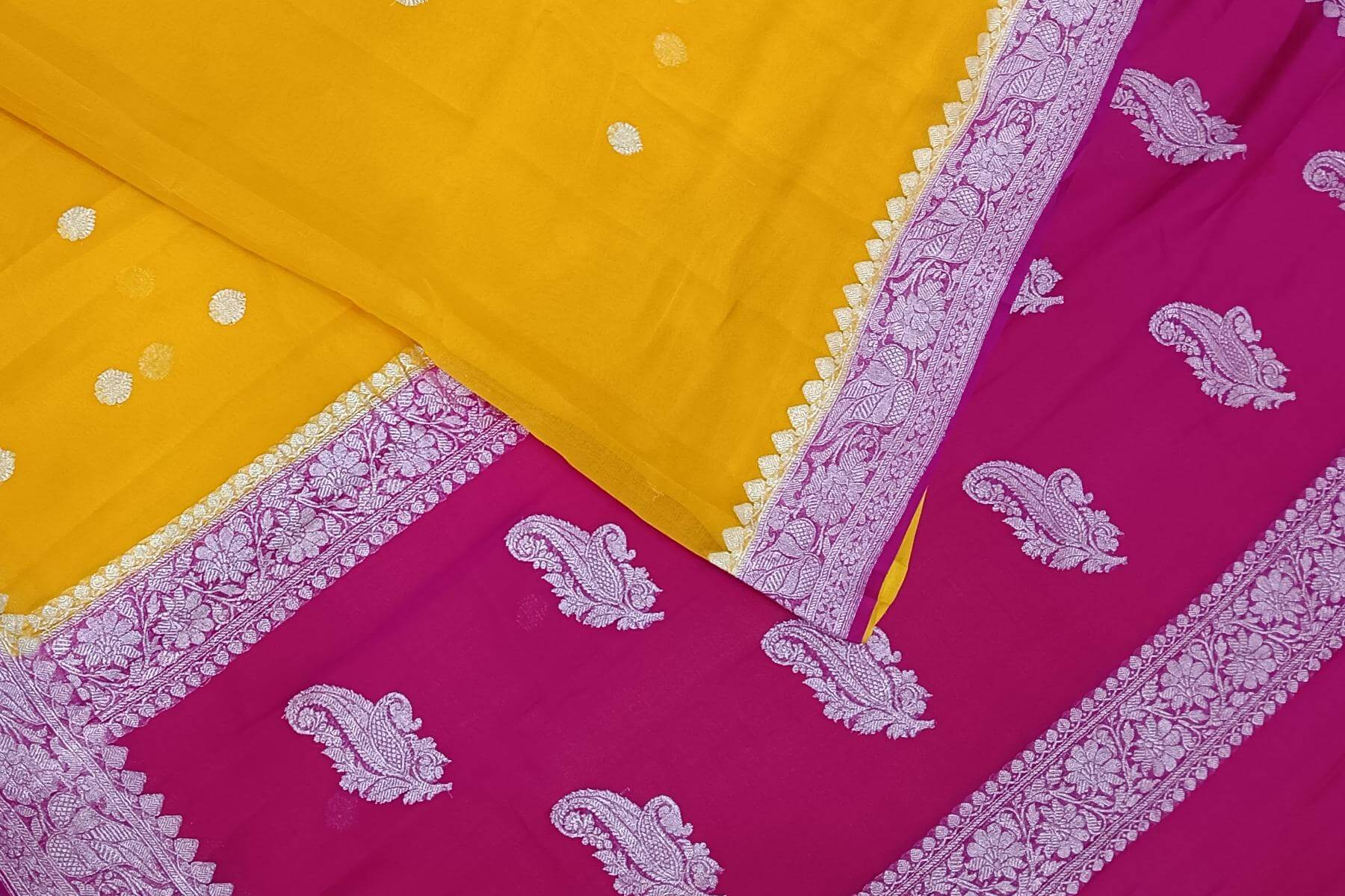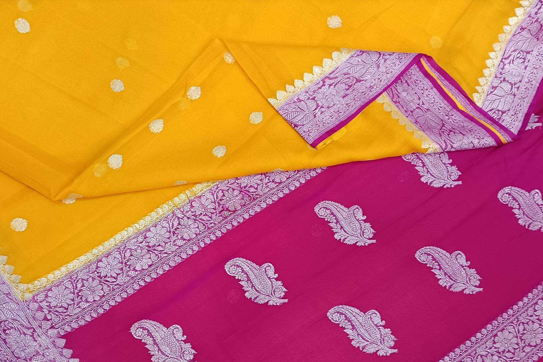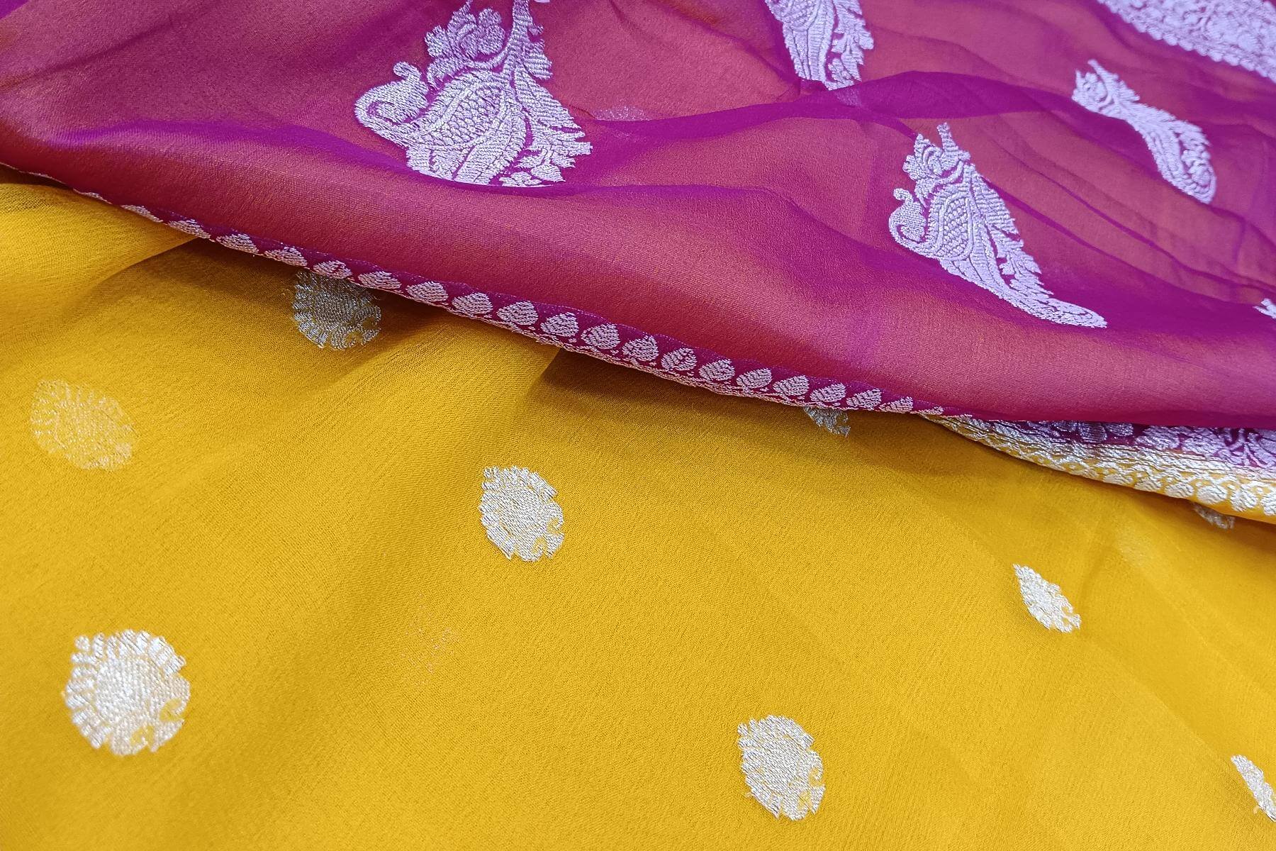 Description: Banarasi silk chiffon saree in mustard with silver buttis & border and a contrast pallu in pink