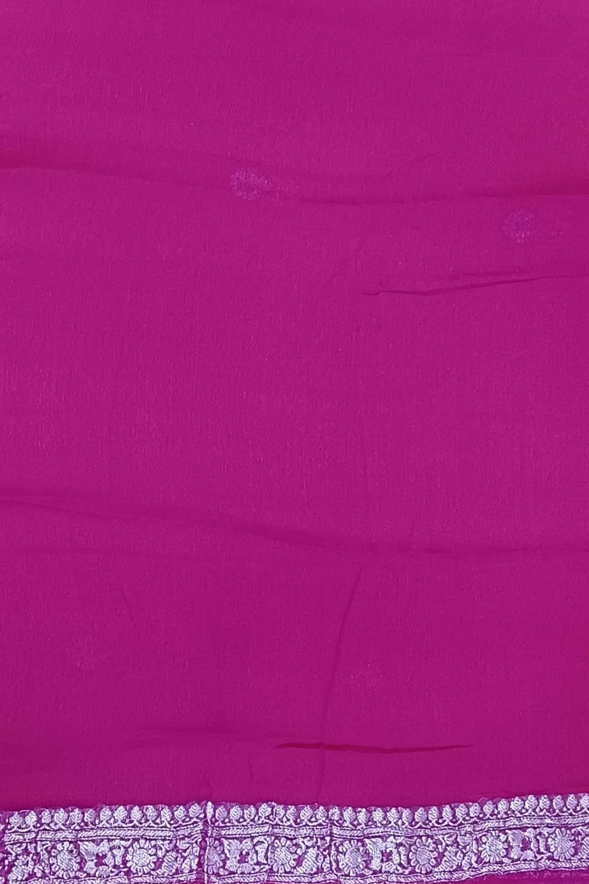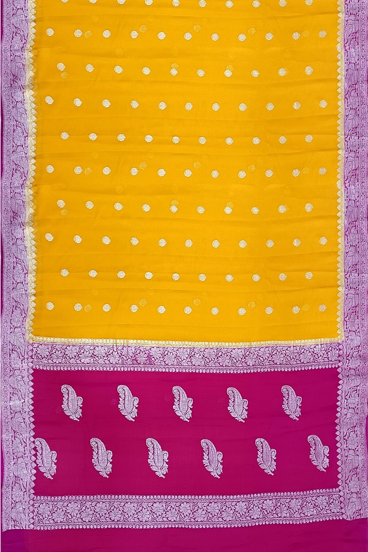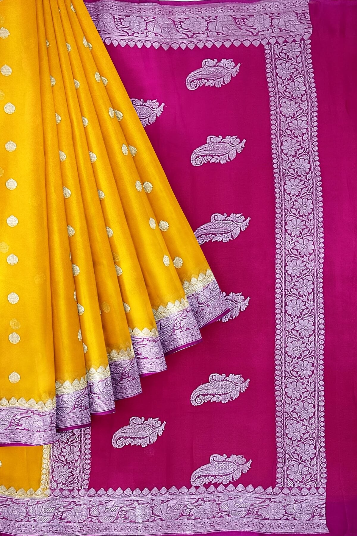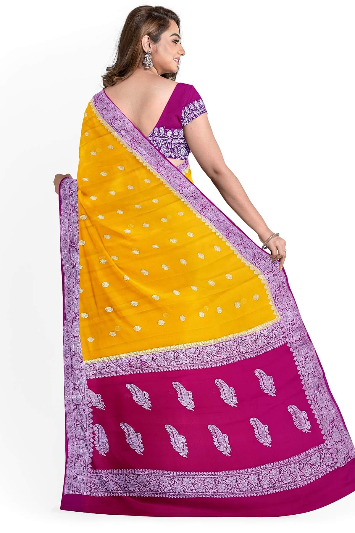 Description: Banarasi silk chiffon saree in mustard with silver buttis & border and a contrast pallu in pink