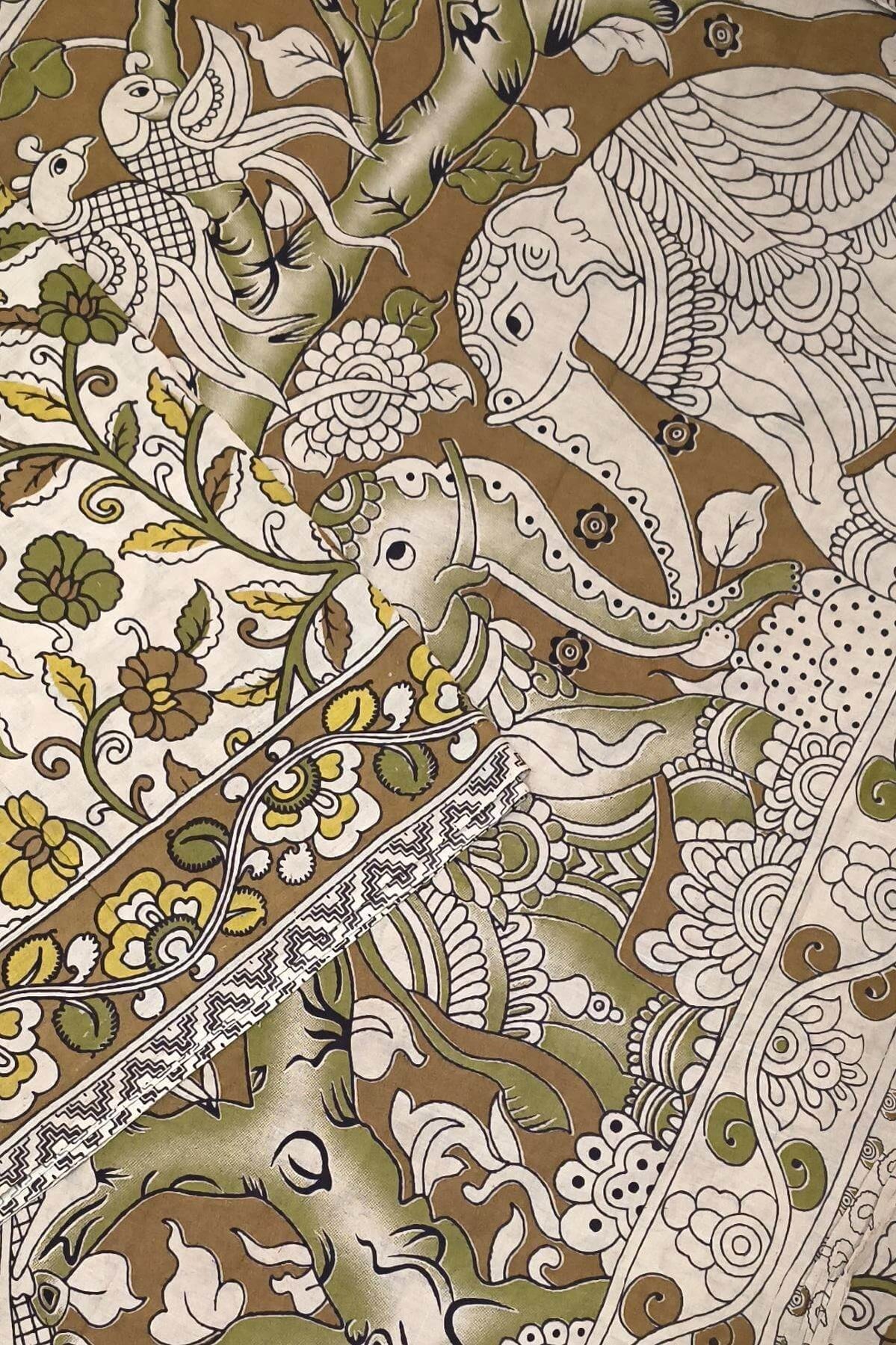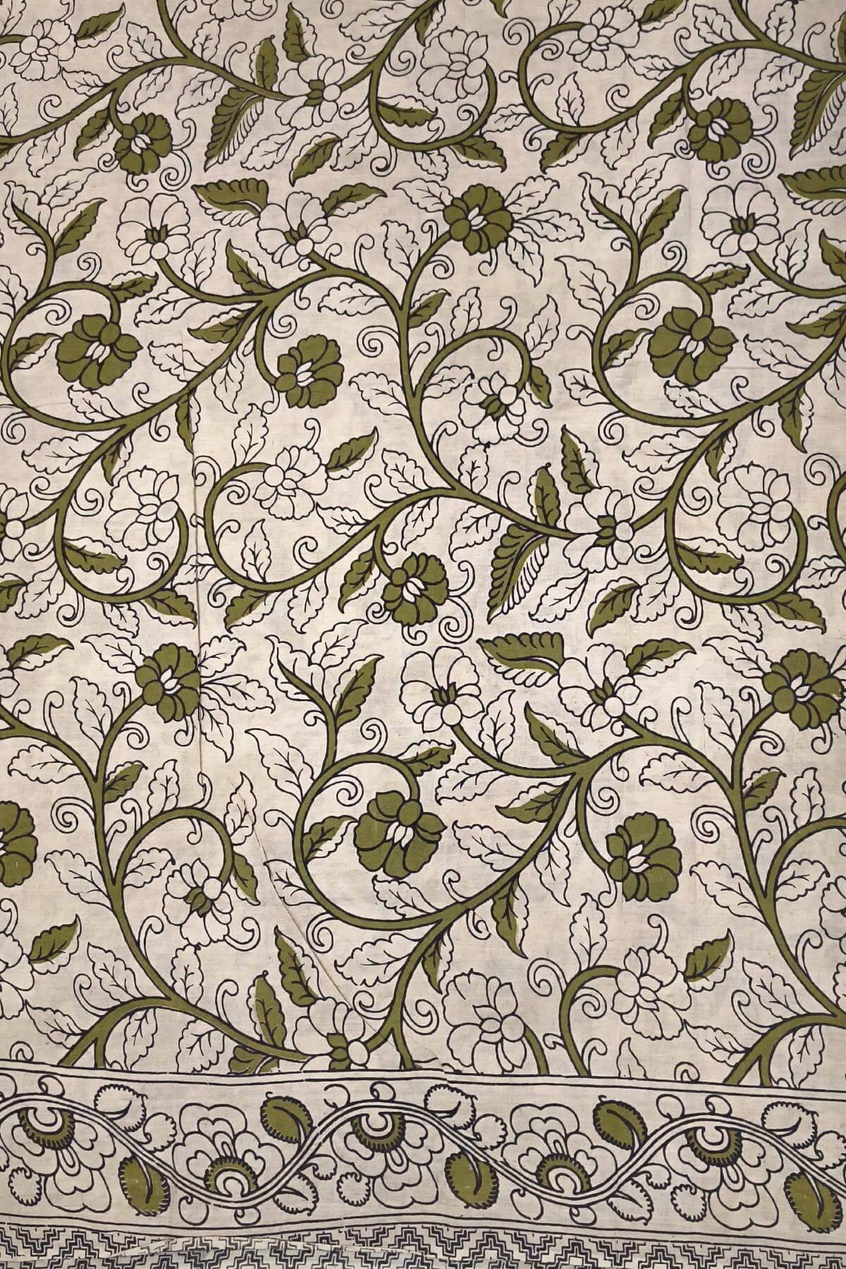 Description : Printed kalamkari pure cotton saree in beige & mehndi green