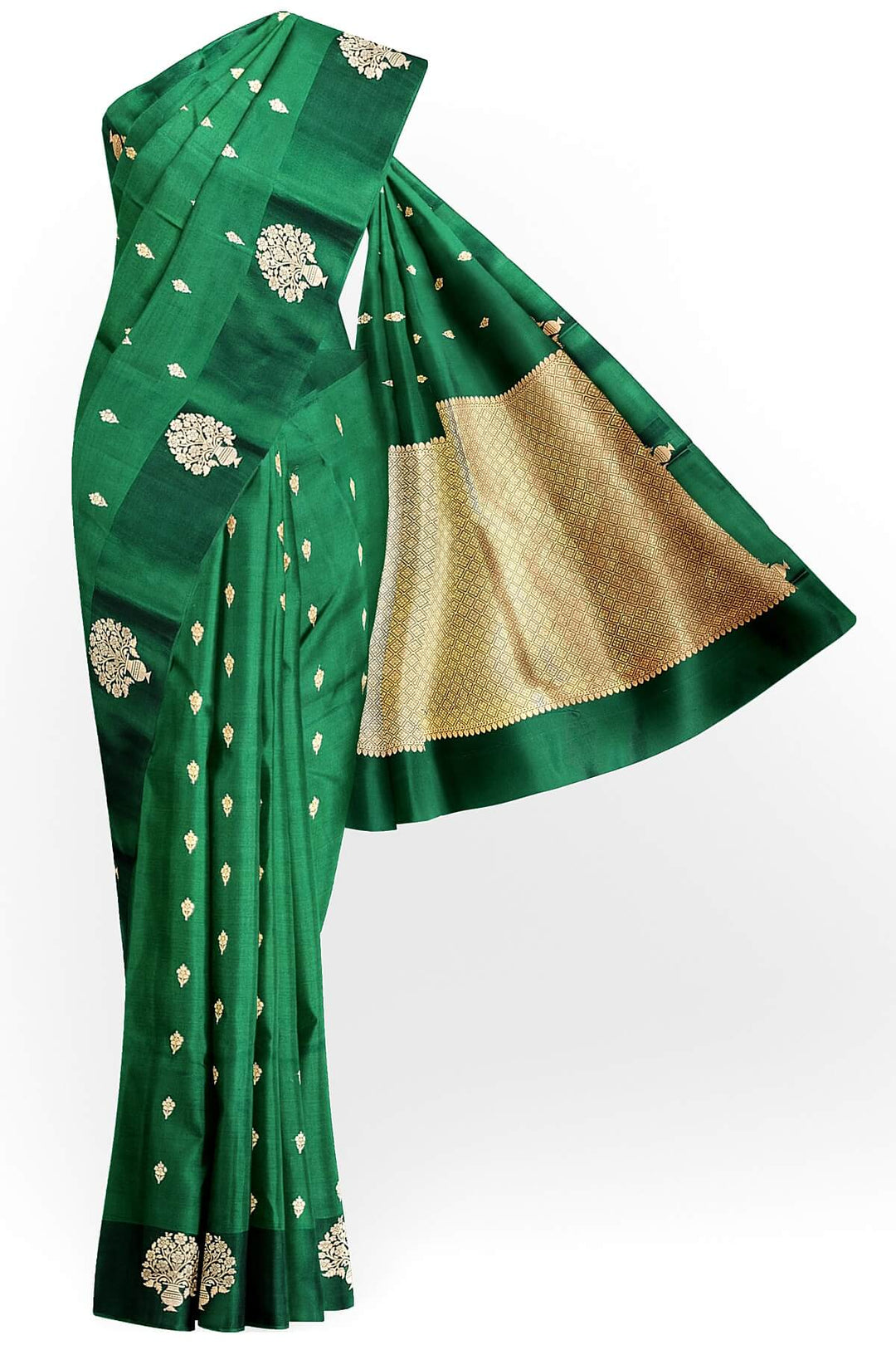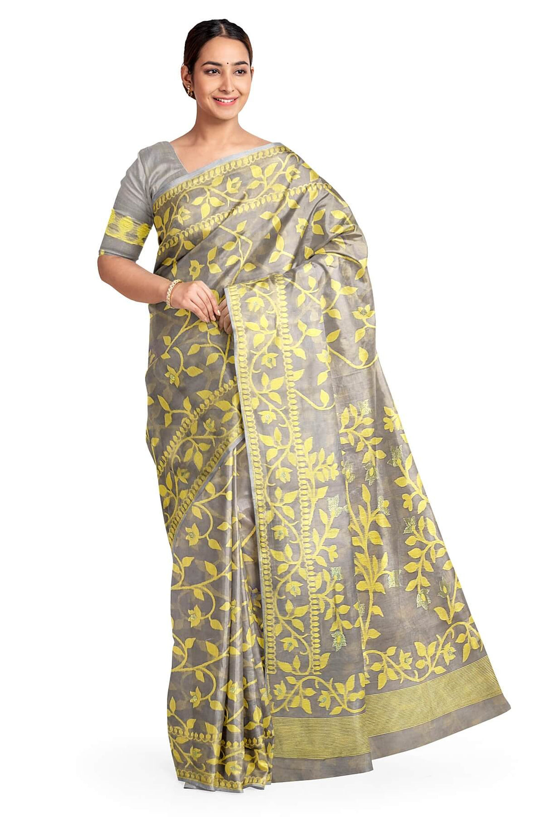 Handloom silk cotton saree in olive green in floral jamdani weave