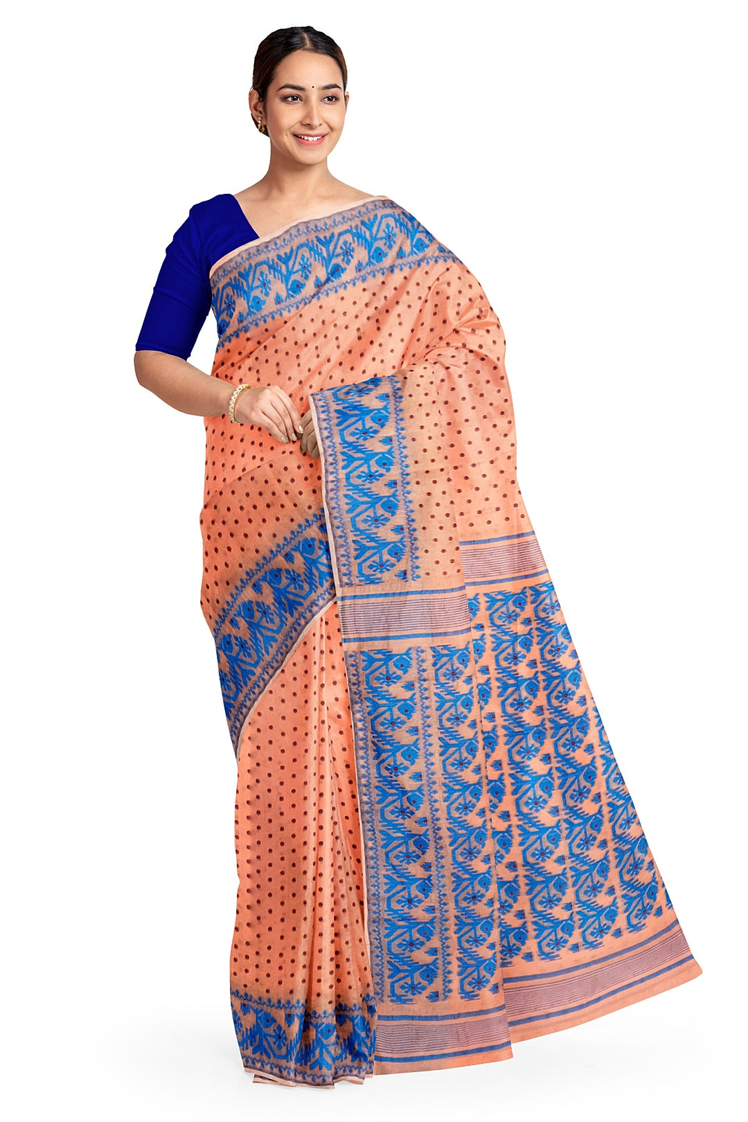 Handwoven silk cotton saree peach in jamdani weave with contrast border & 1000 buttis