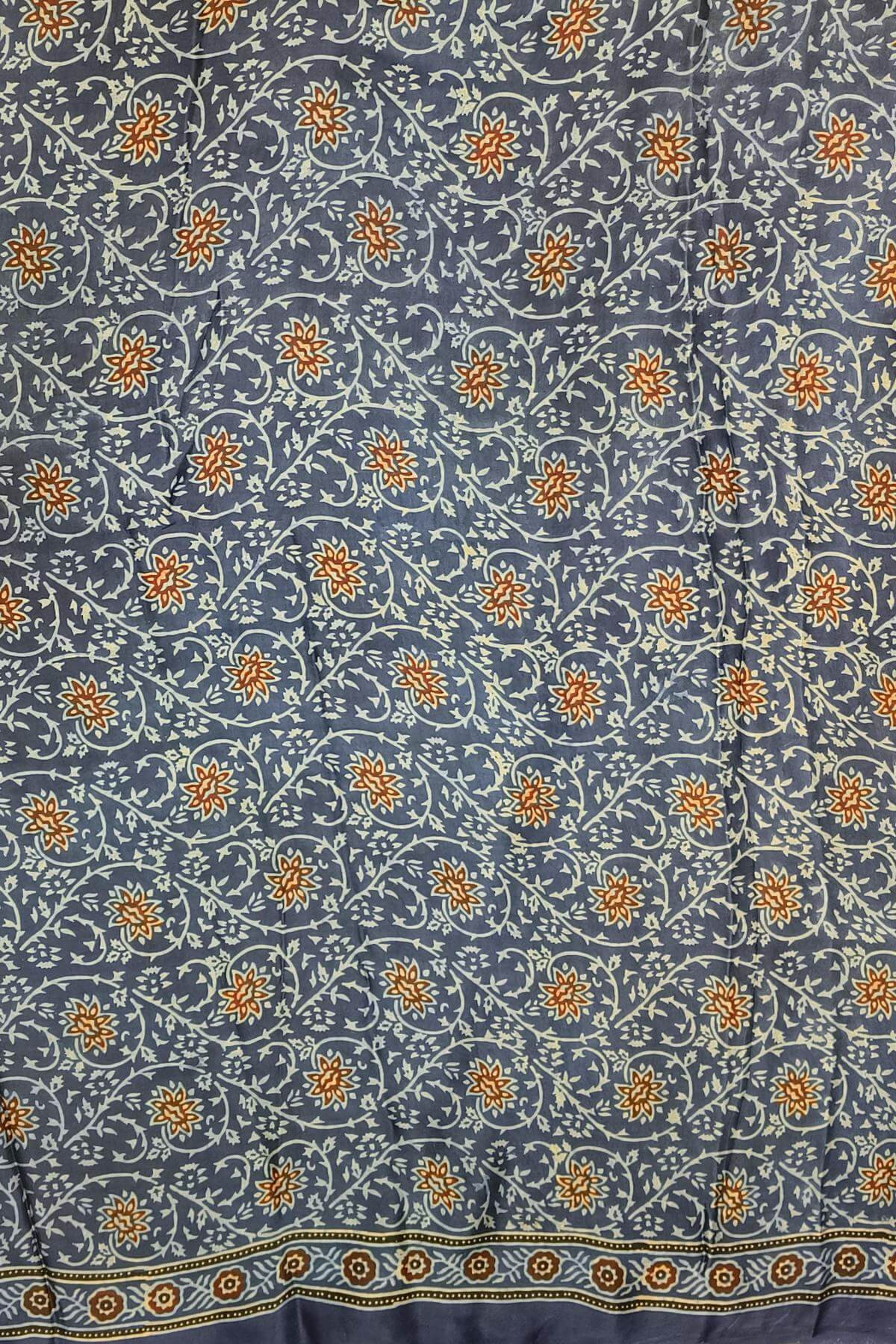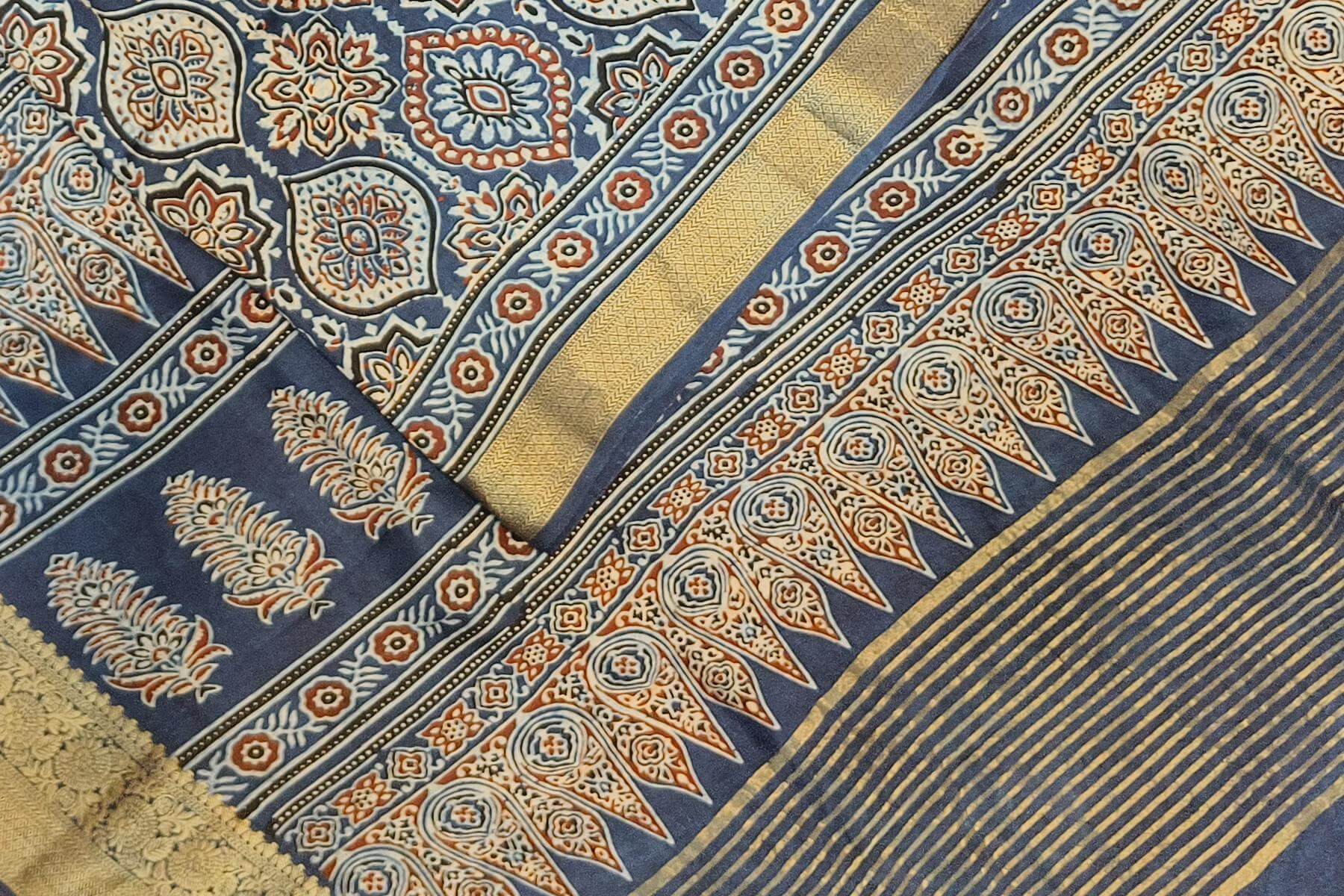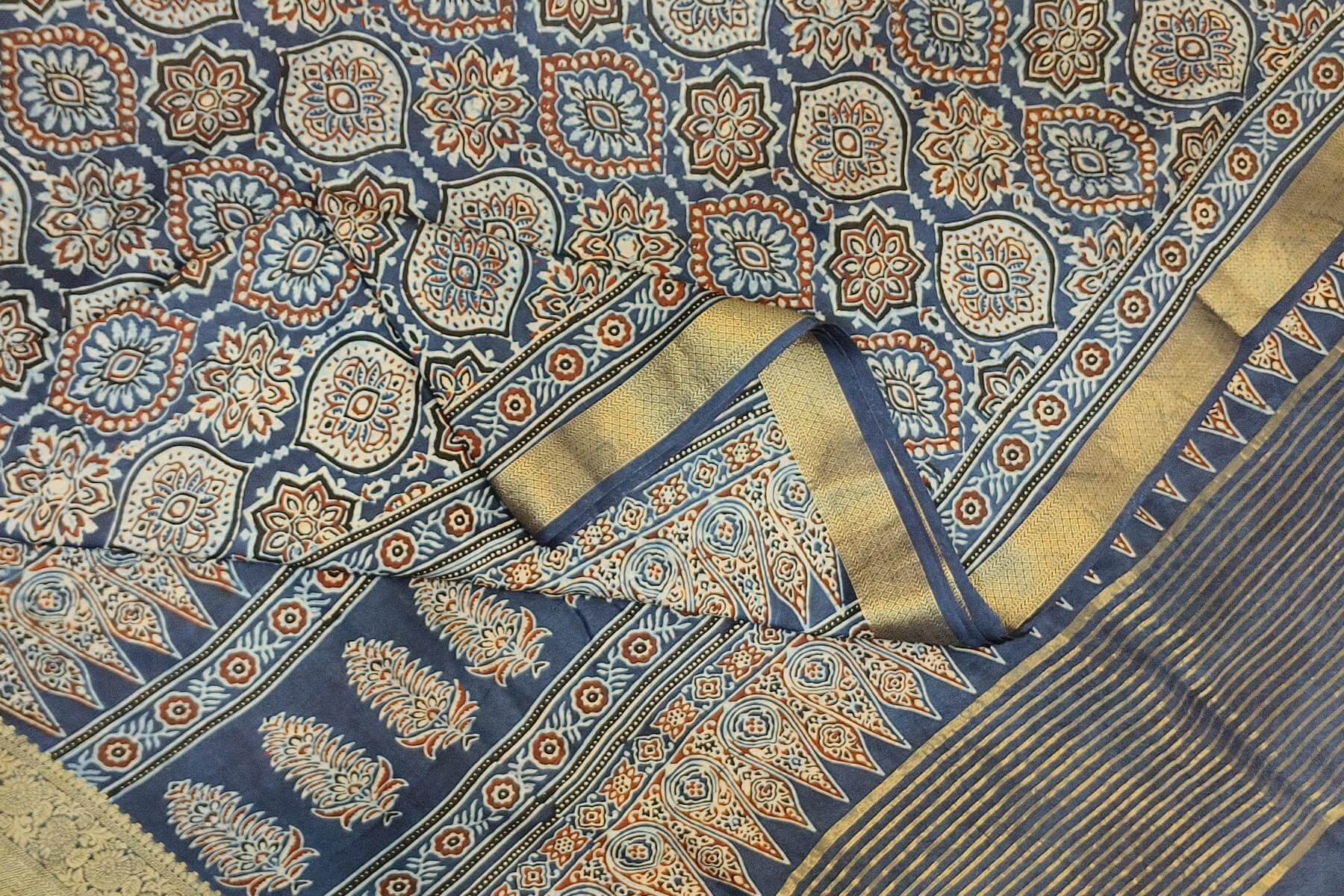 Description : Dola silk saree in blue with floral motifs in hand block Ajrakh print .