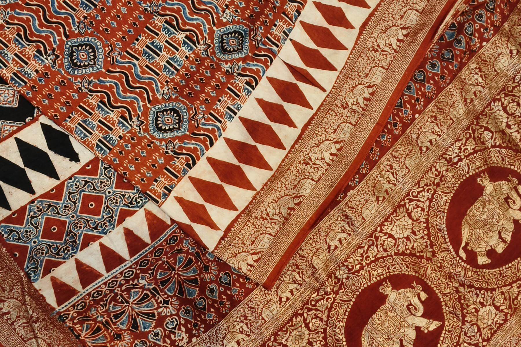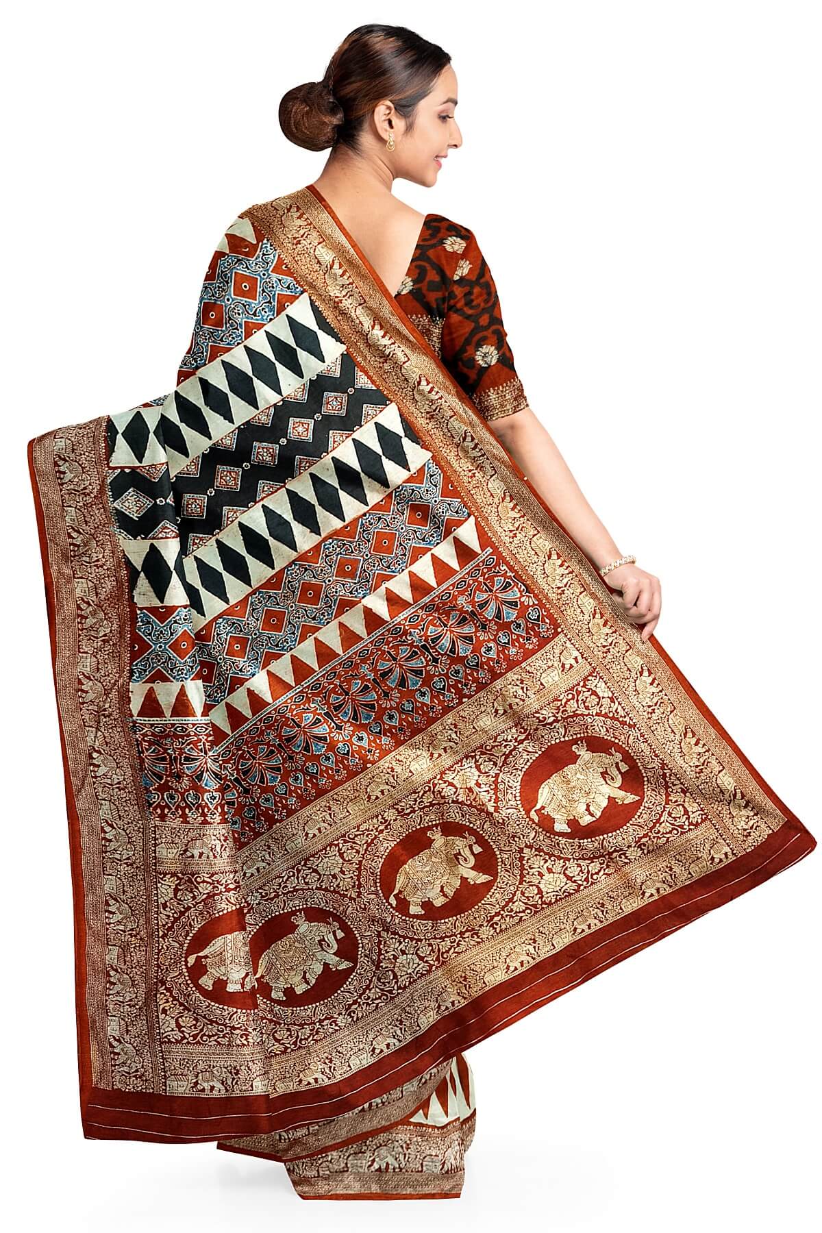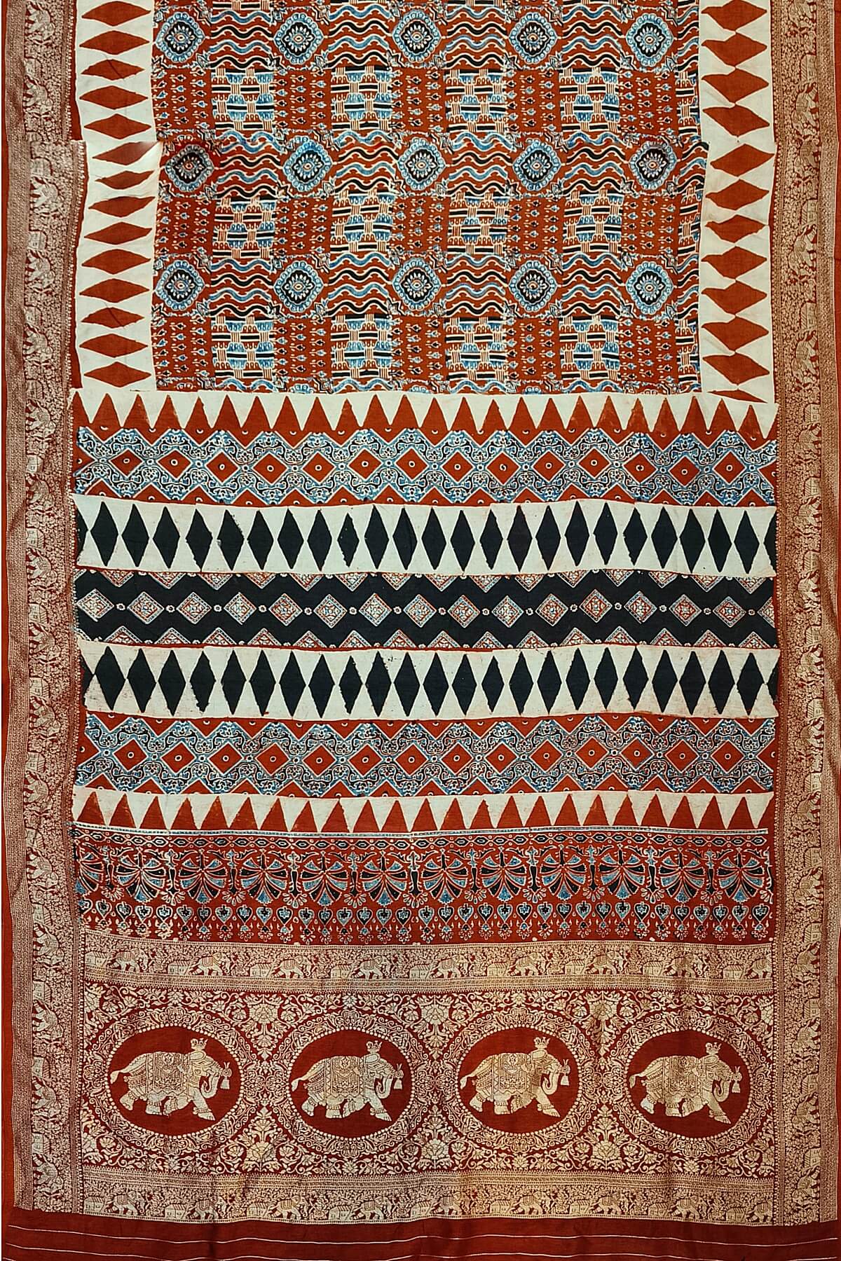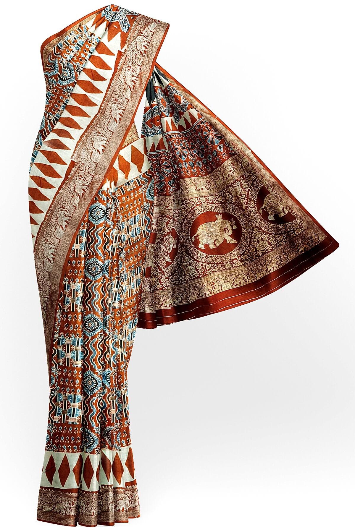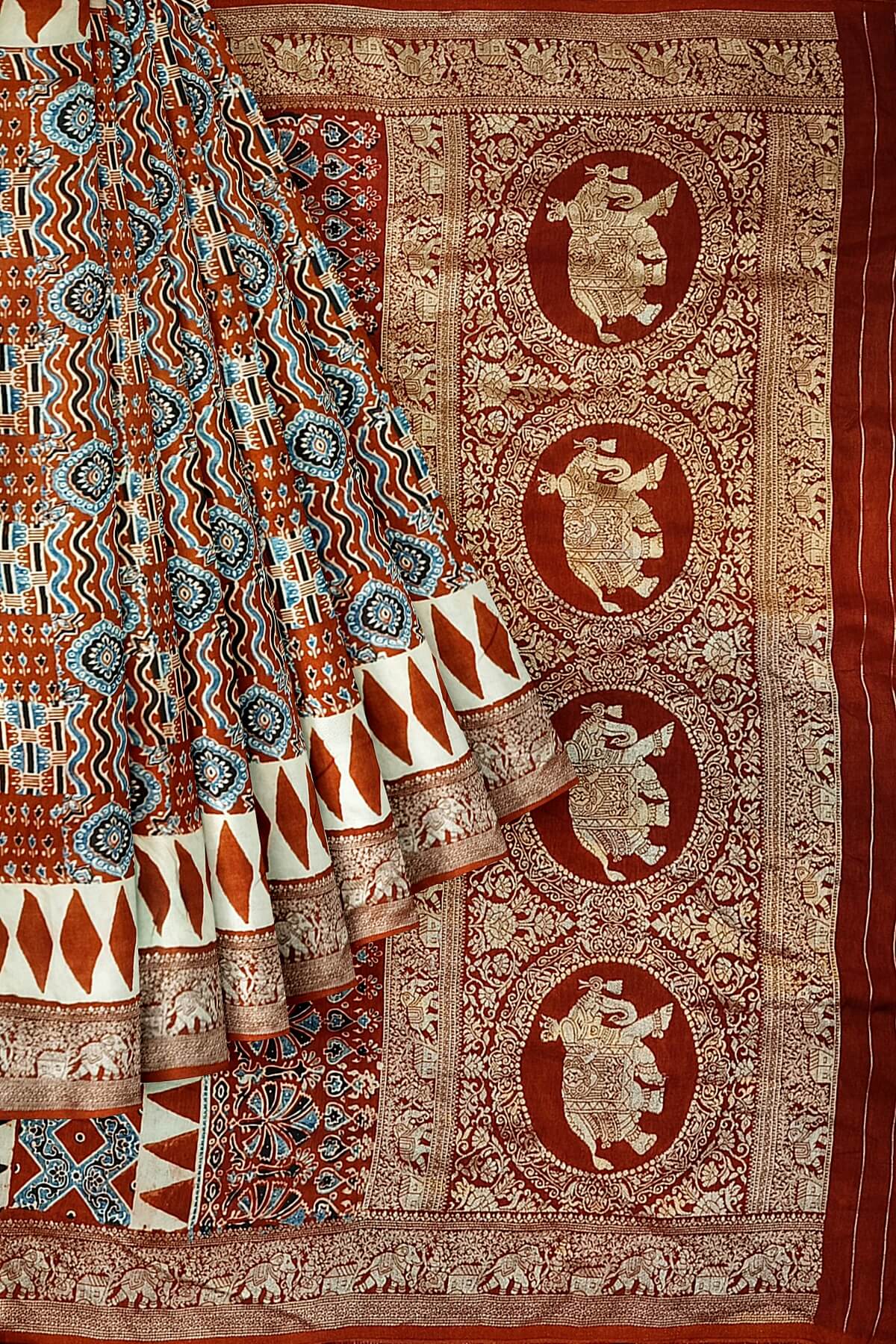 Description : Dola silk saree in red with hand block Ajrakh print with elephant motifs in rich tissue pallu