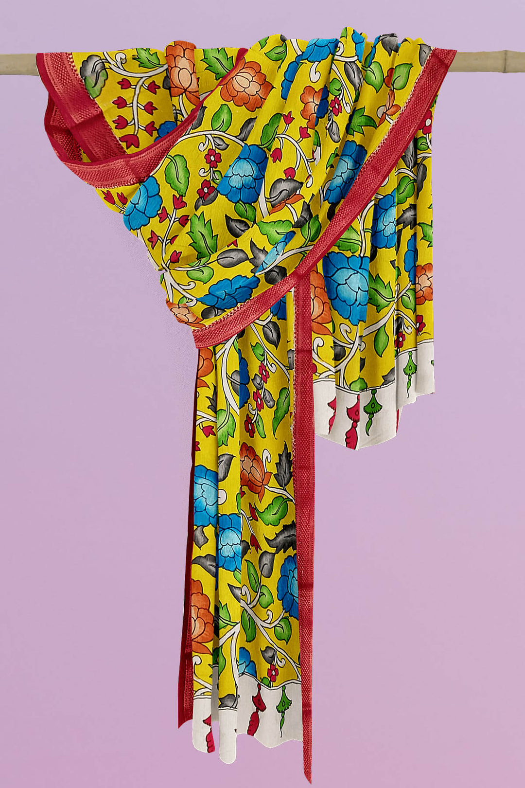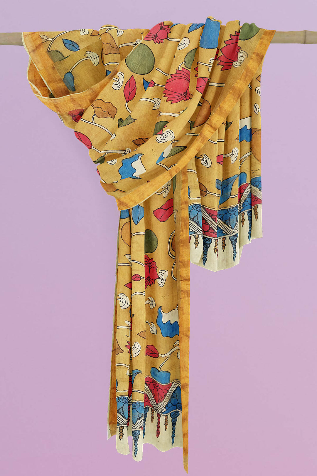 Hand painted Kalamkari pure cotton dupatta in yellow with floral vines