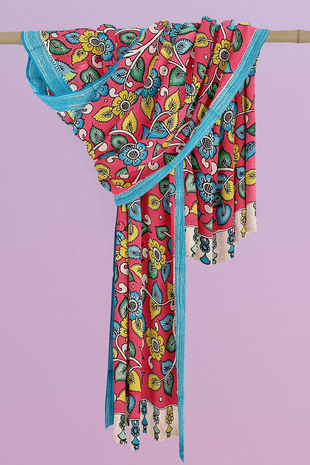 Hand painted Kalamkari pure cotton dupatta in pink with floral vines