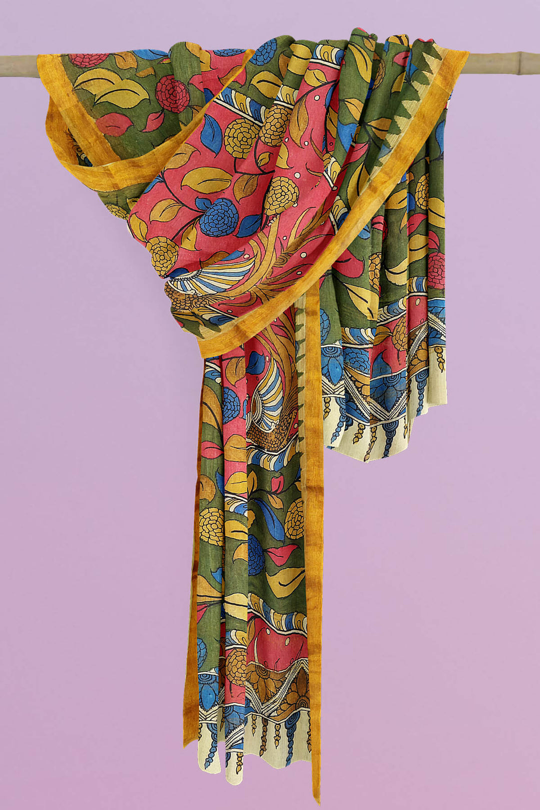 Ponduri cotton dupatta in hand painted kalamkari in green