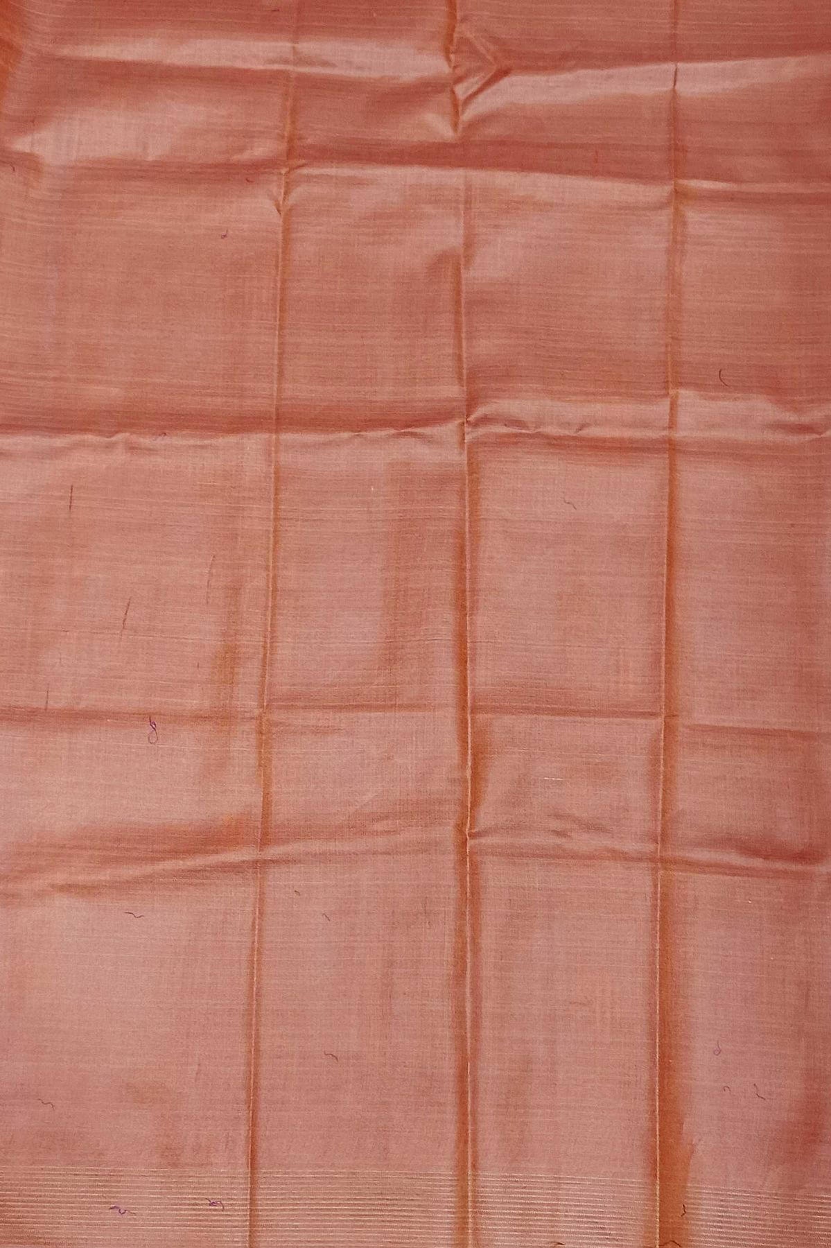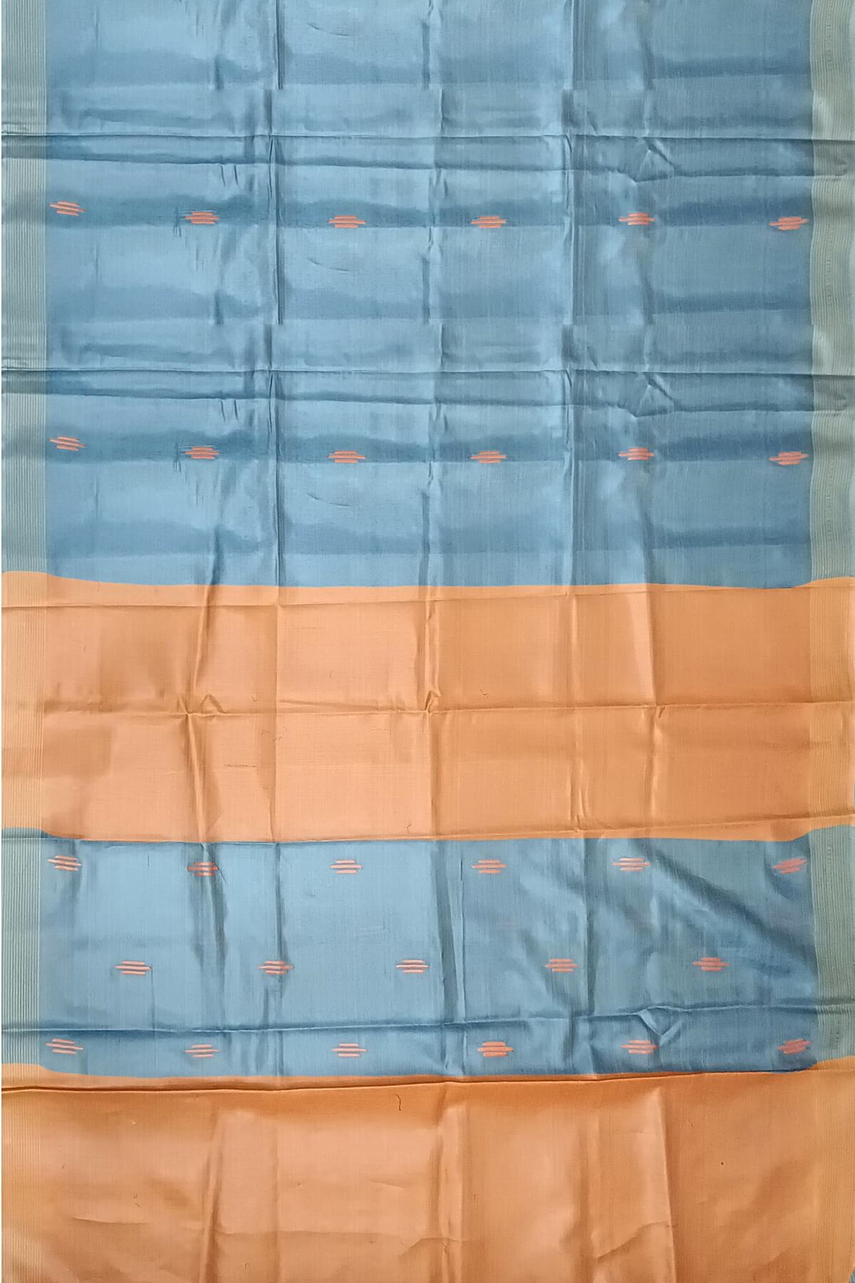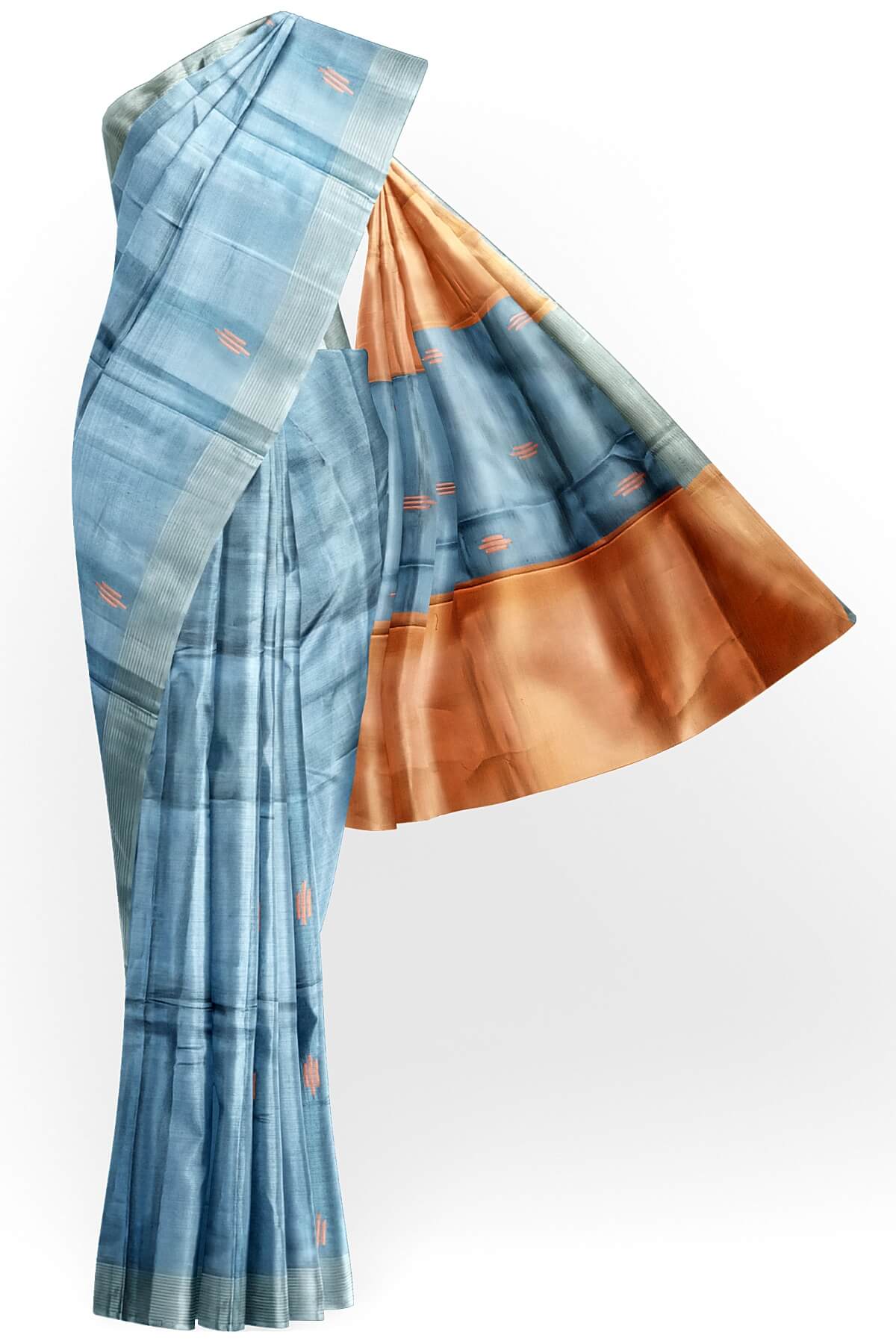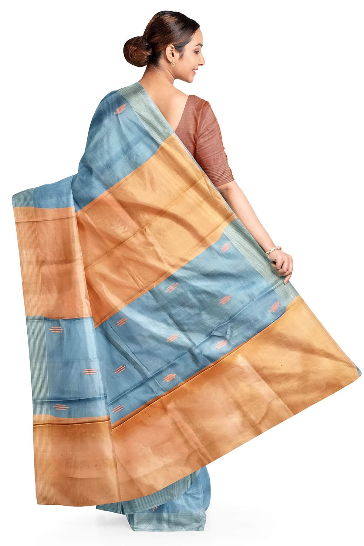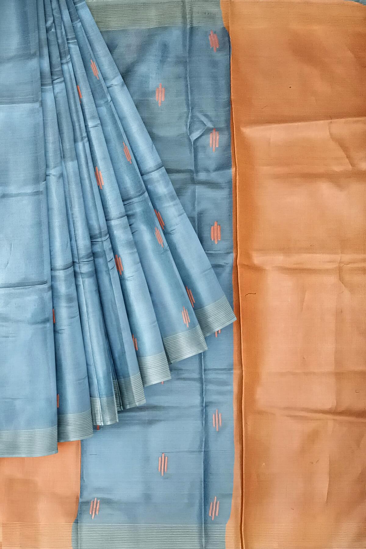 Description : Handwoven Eri silk saree in bluish grey with striped pallu and a contrast blouse