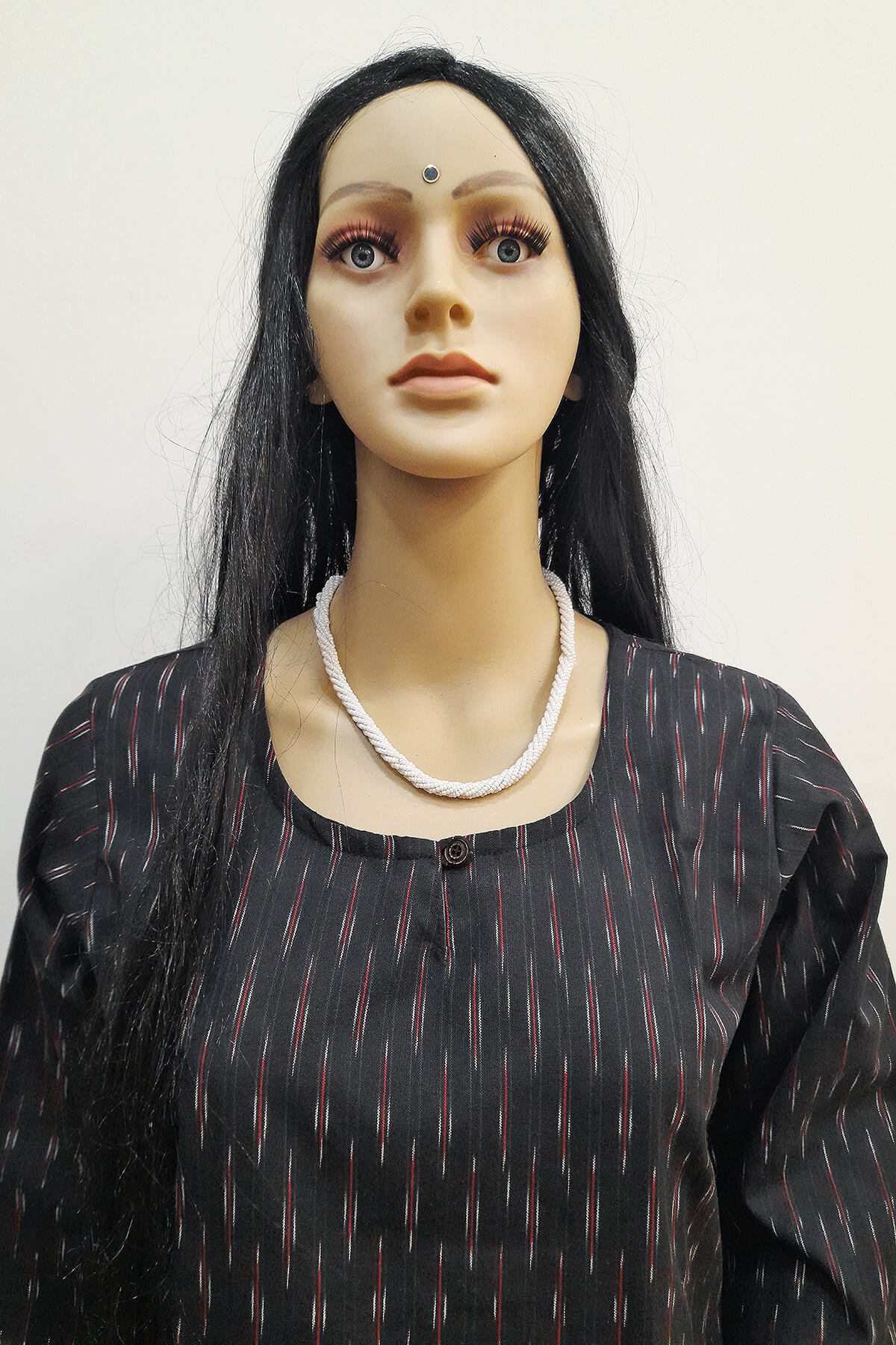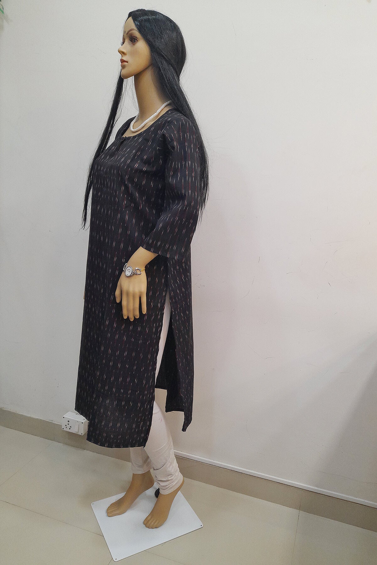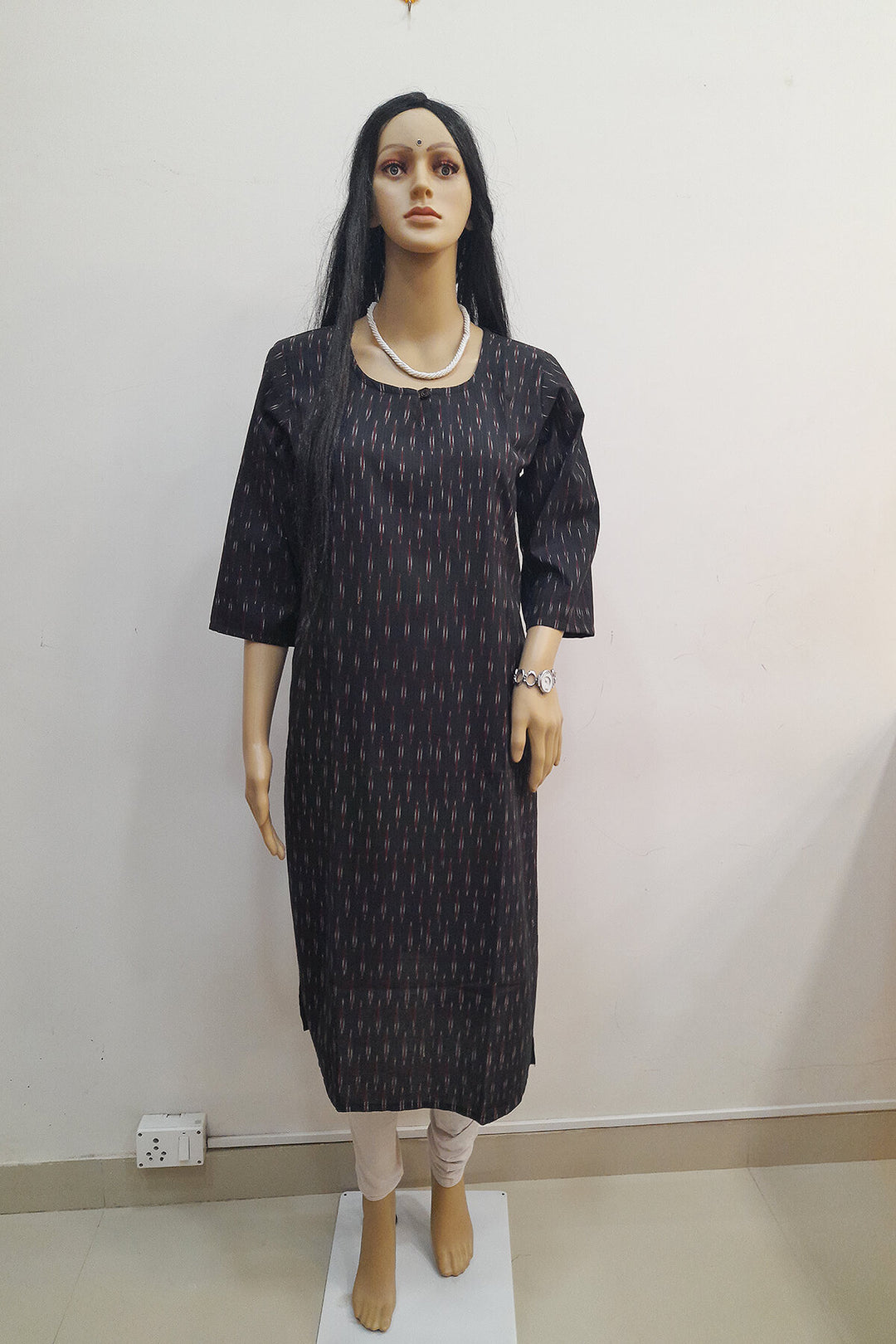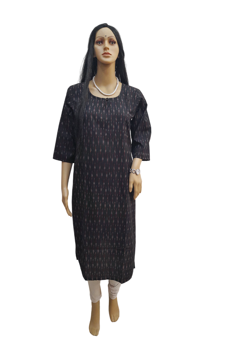 Description : Handwoven ikat cotton kurti in straight cut in black