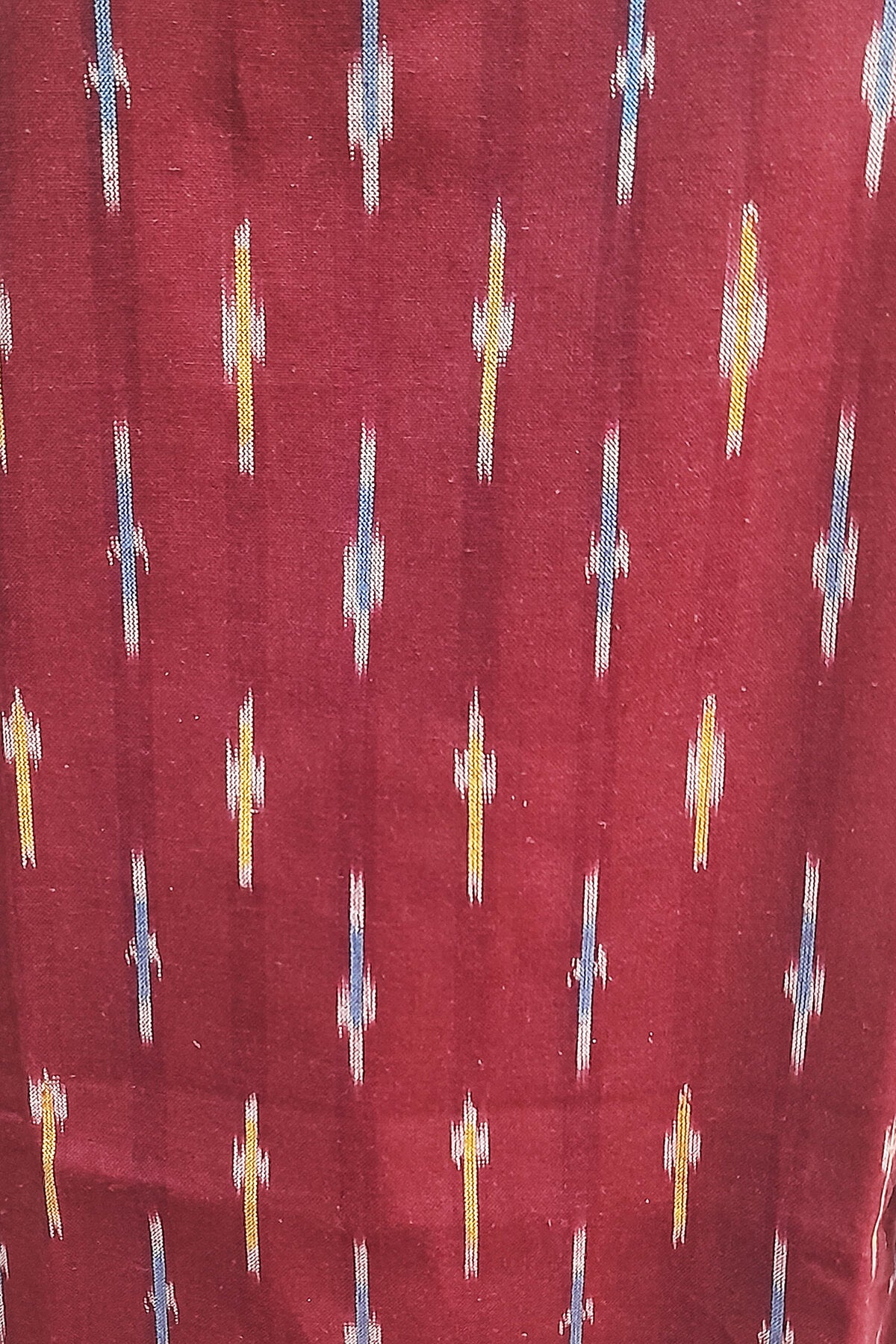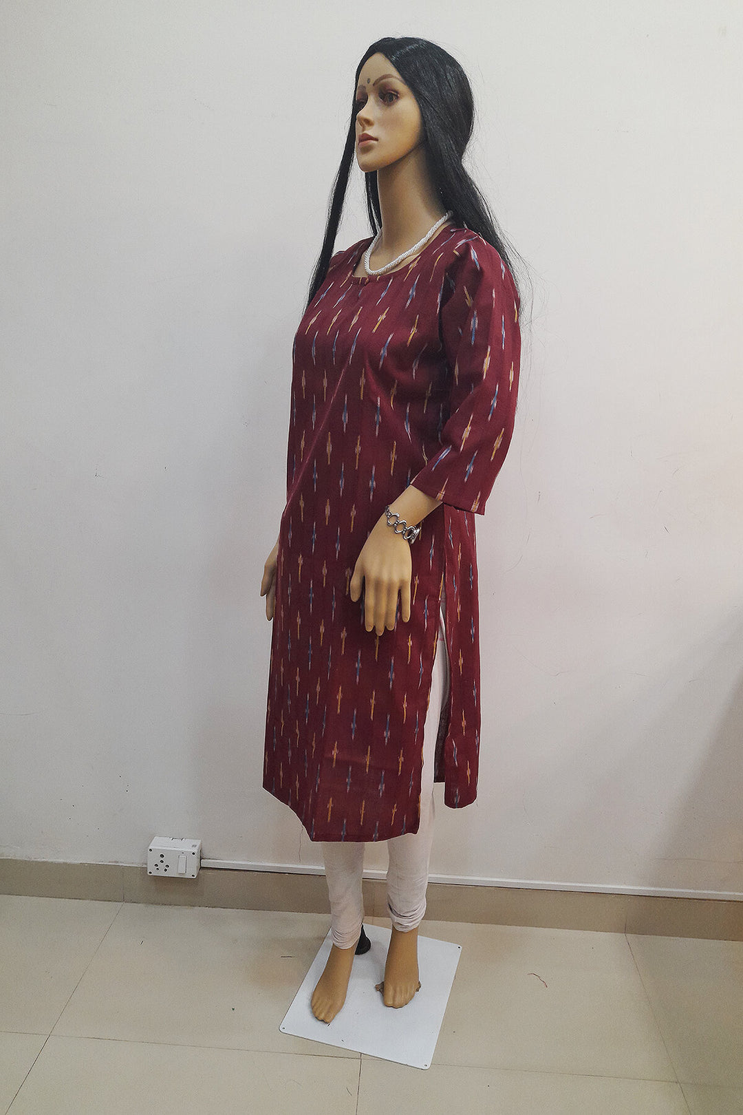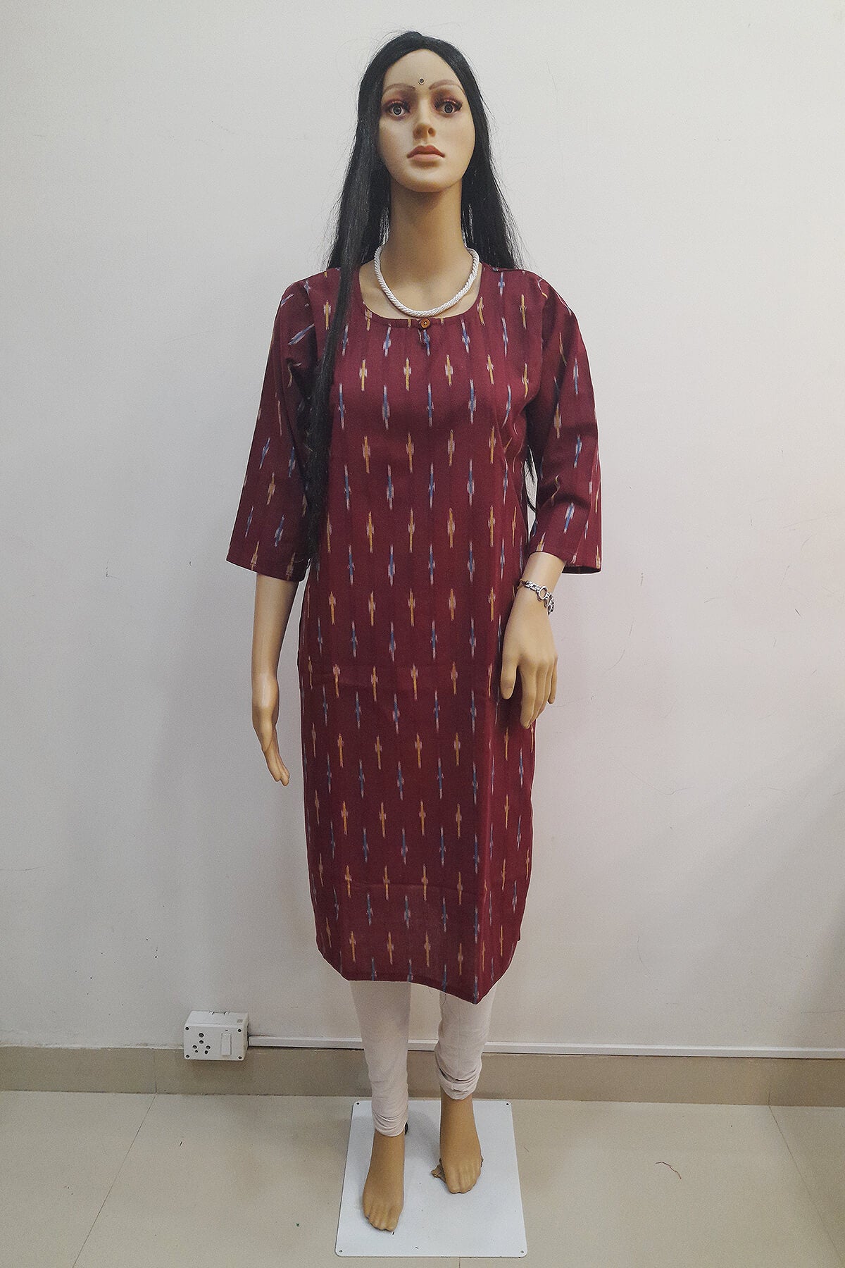 Description : Handwoven ikat cotton kurti in straight cut in maroon
