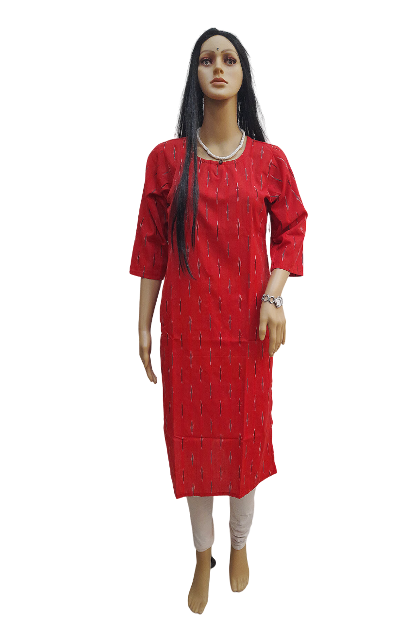 Description : Handwoven ikat cotton kurti in straight cut in red.