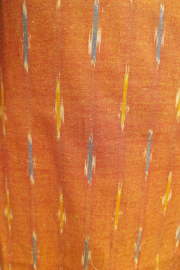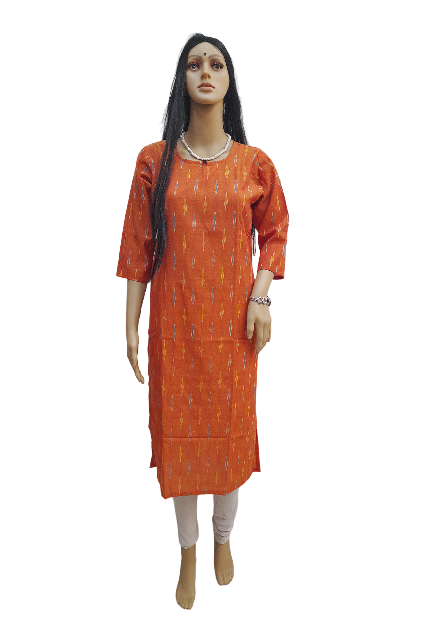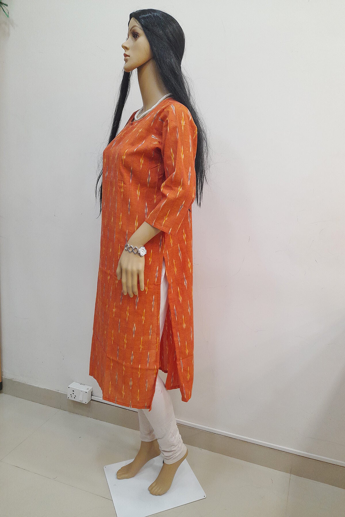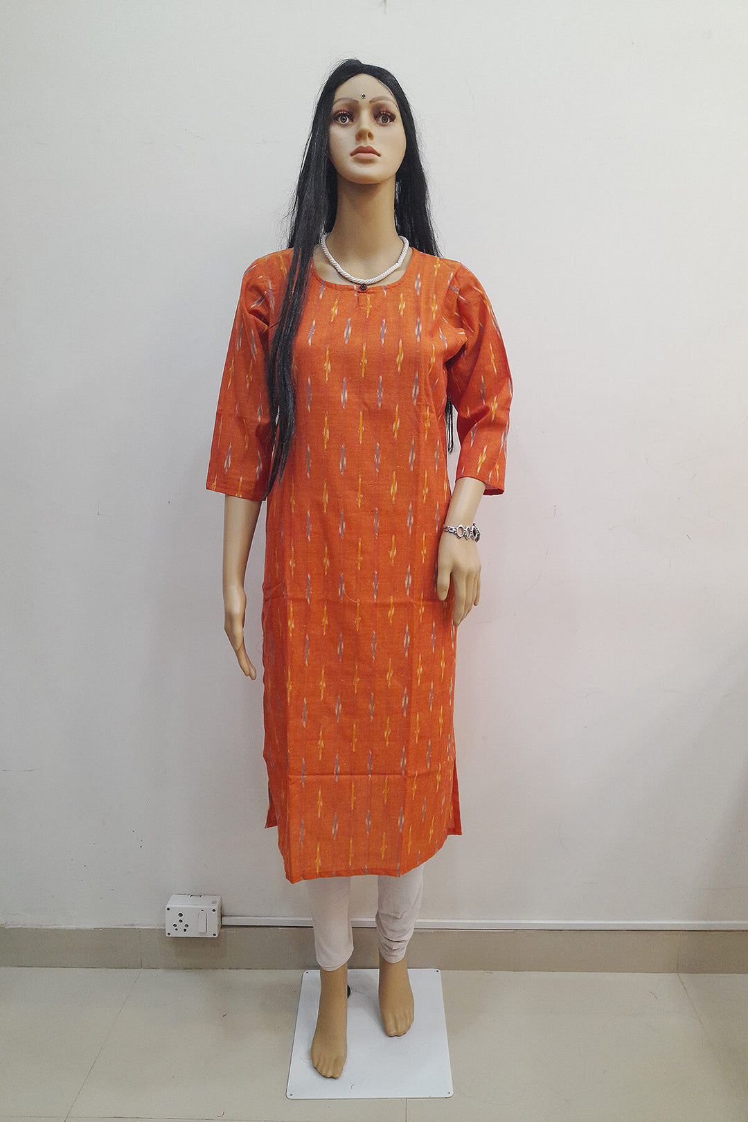 Description : Handwoven ikat cotton kurti in straight cut in rust.