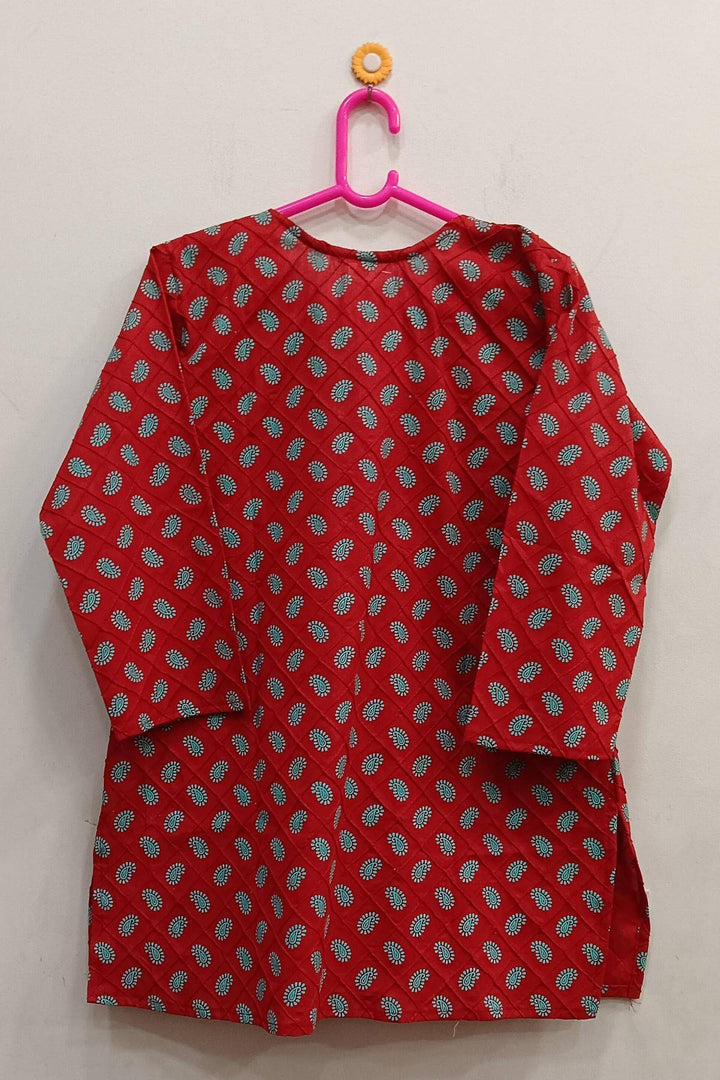 Description : Pin tuck pure cotton tunic in red with paisley motifs in green