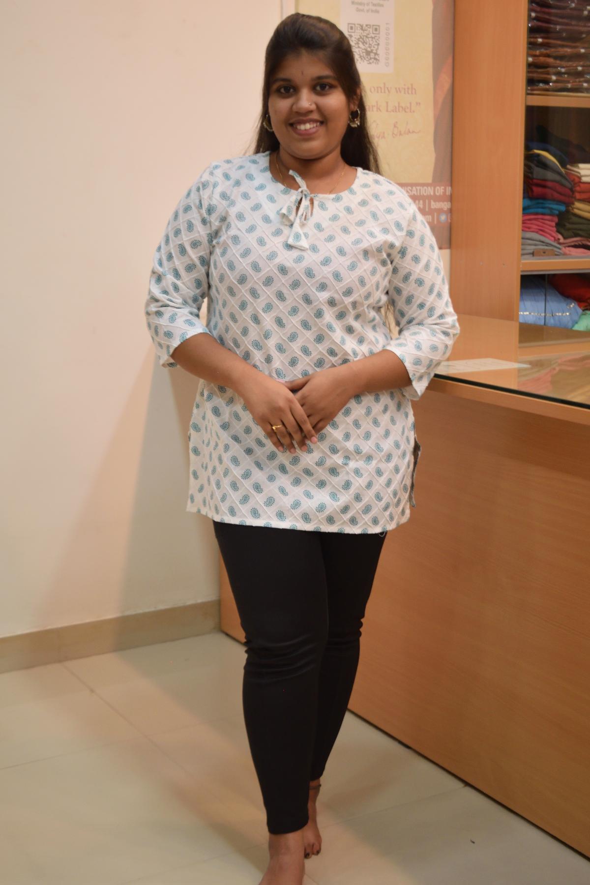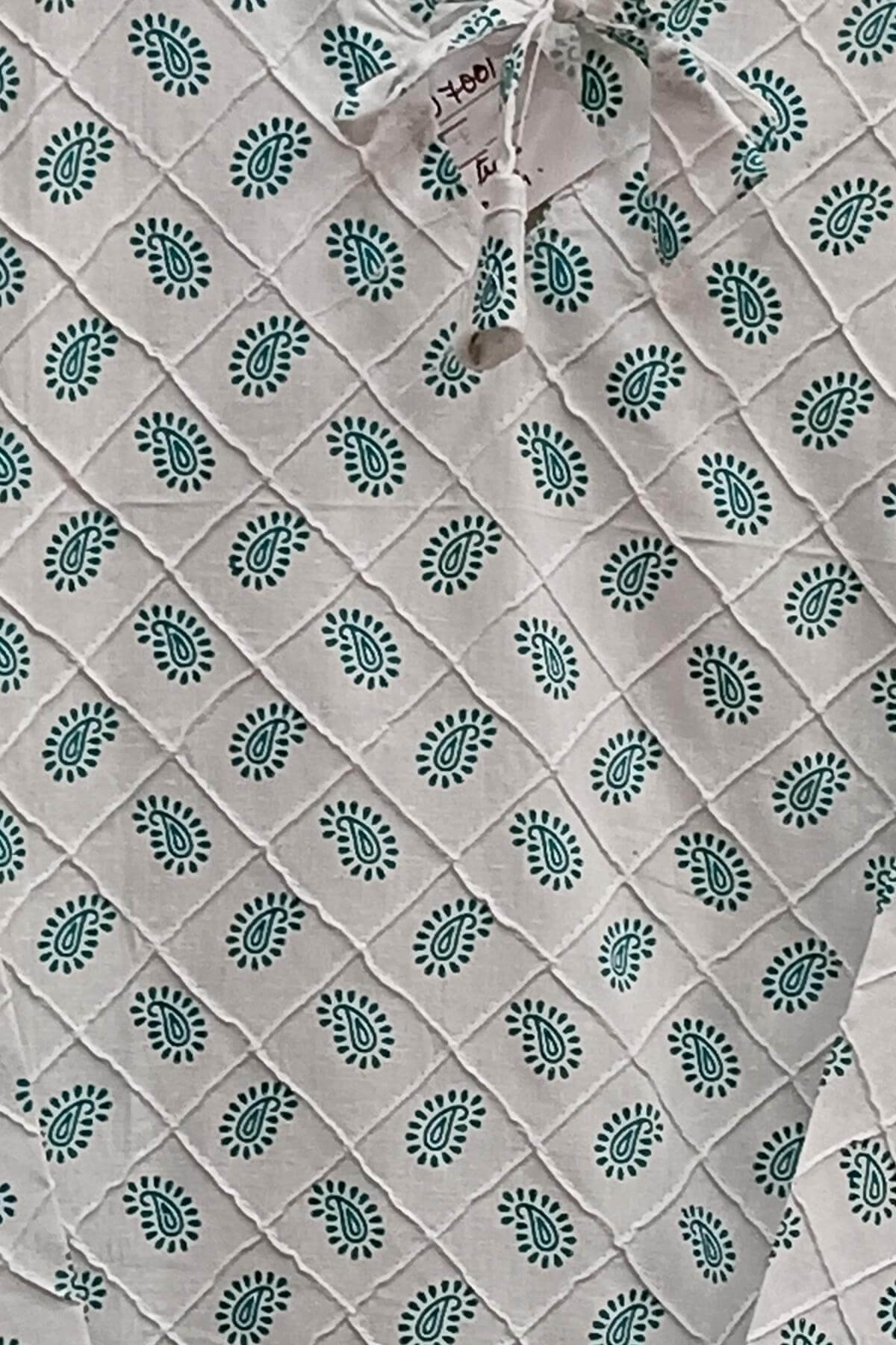 Pin tuck pure cotton tunic in white with paisley motifs in green