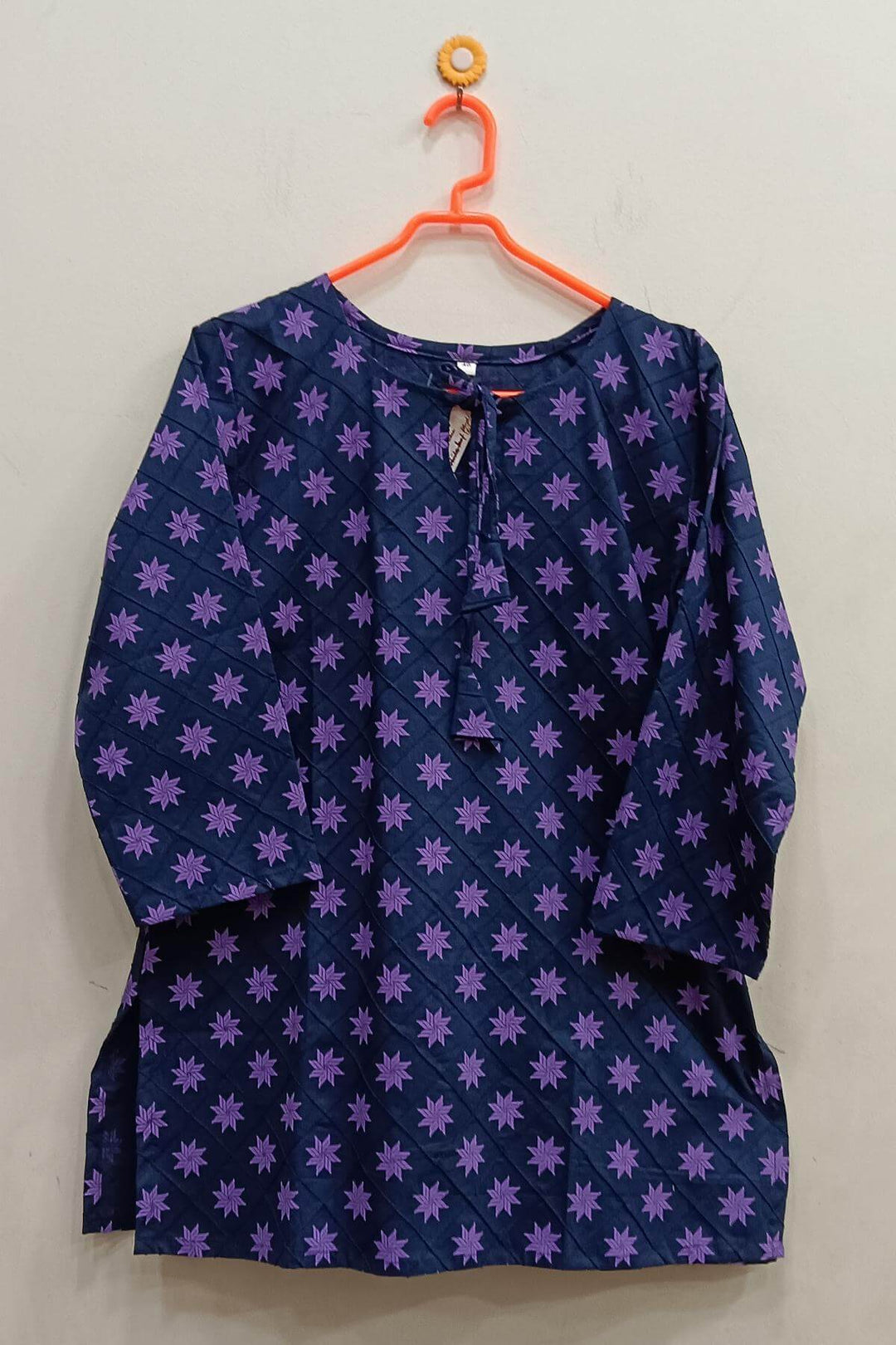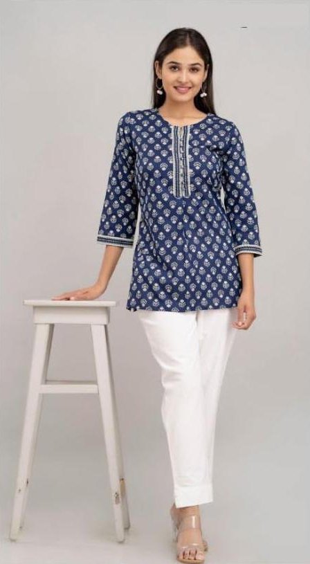 Pin tuck pure cotton tunic in navy blue with floral motifs