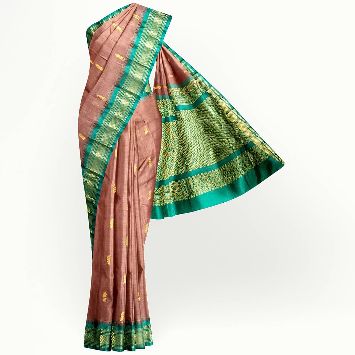 Description : Gadwal cotton silk saree in brown & green with butis & temple border