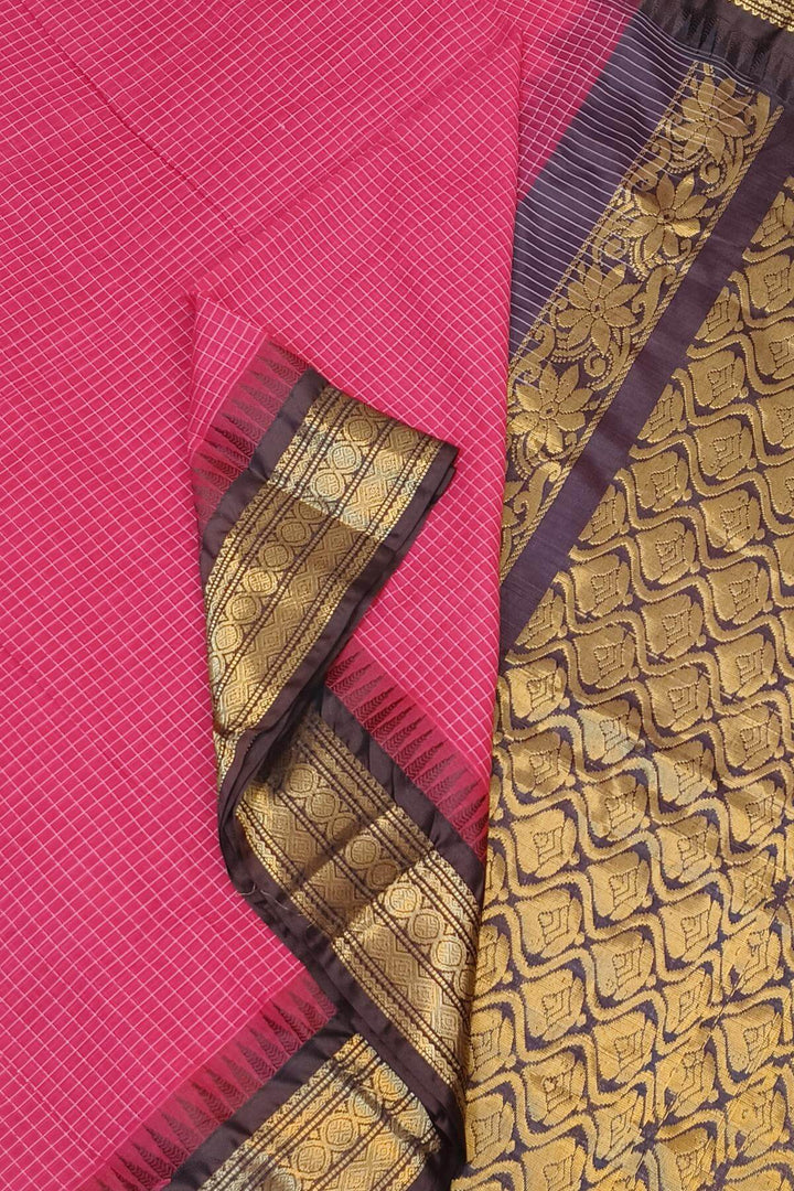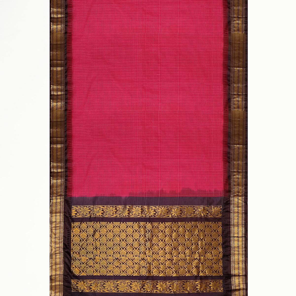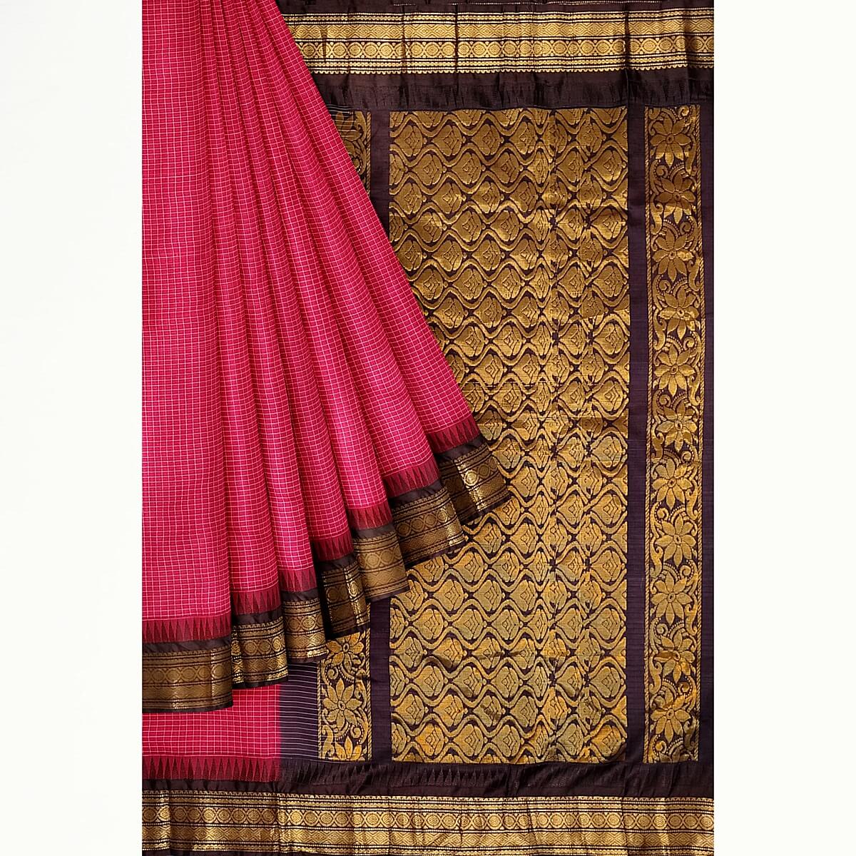 Description : Gadwal cotton silk saree in dark pink & brown in checks with temple border