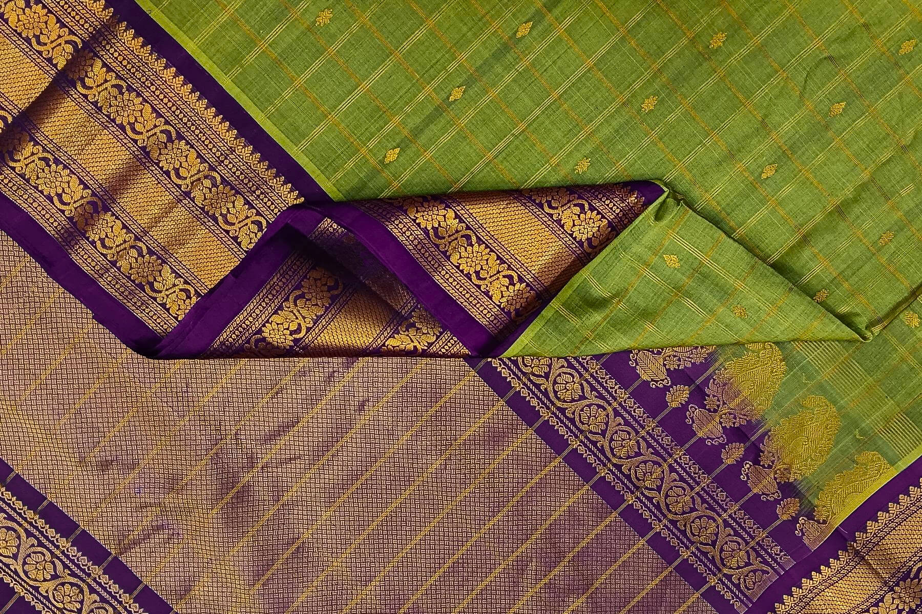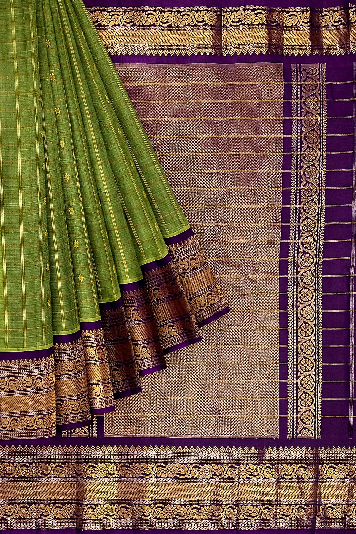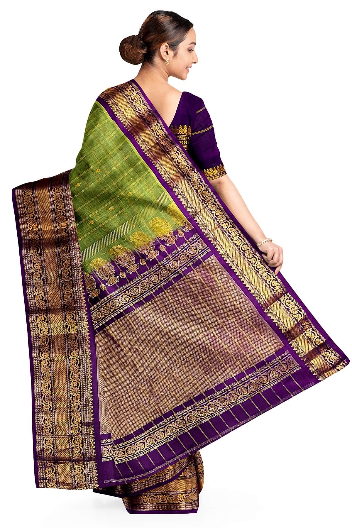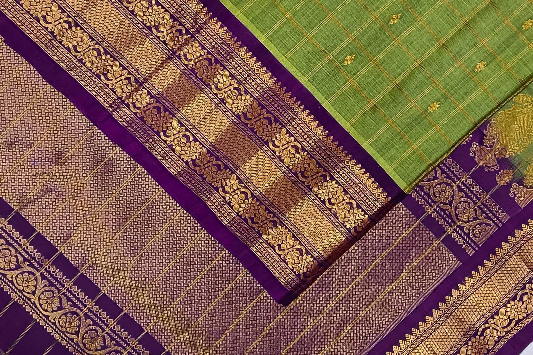 Description : Handloom Gadwal SICO ( silk cotton) saree in mehndi green & purple with checks & buttis