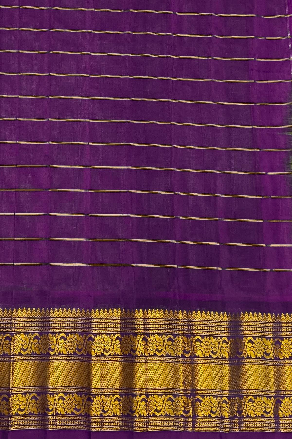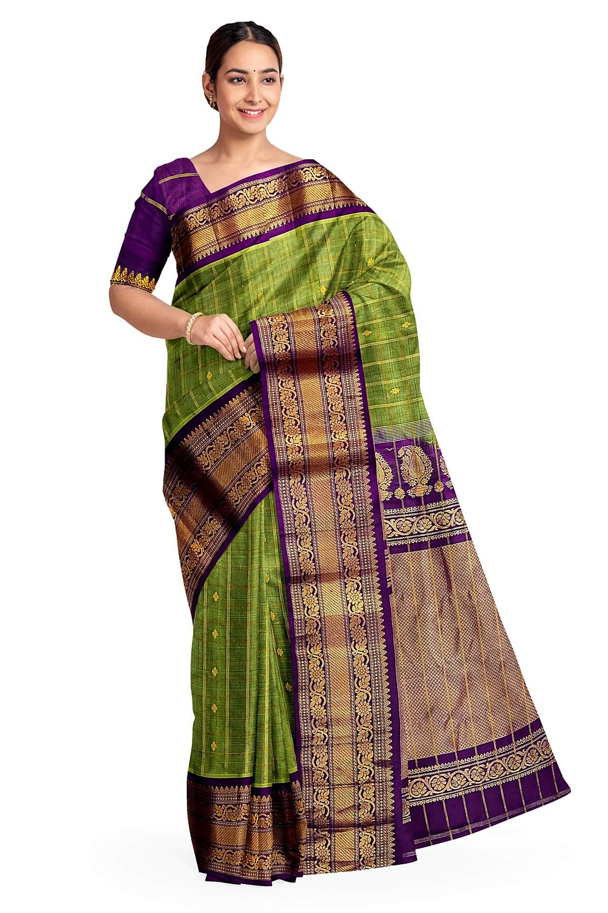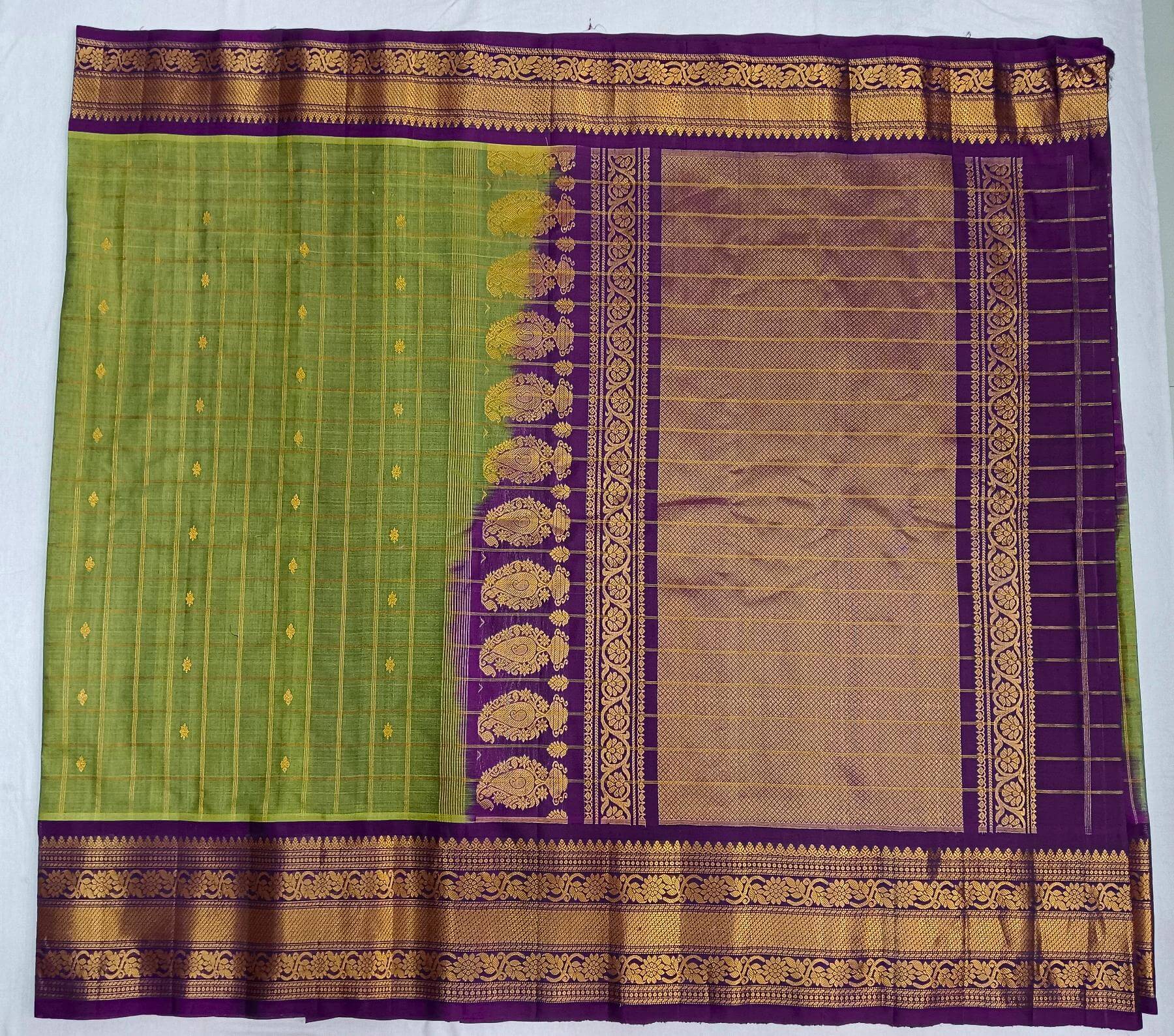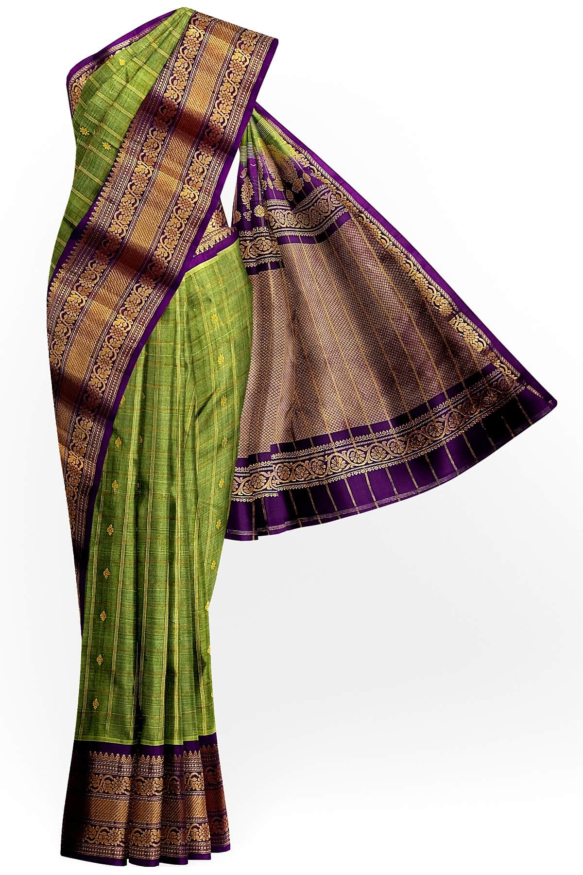 Description : Handloom Gadwal SICO ( silk cotton) saree in mehndi green & purple with checks & buttis
