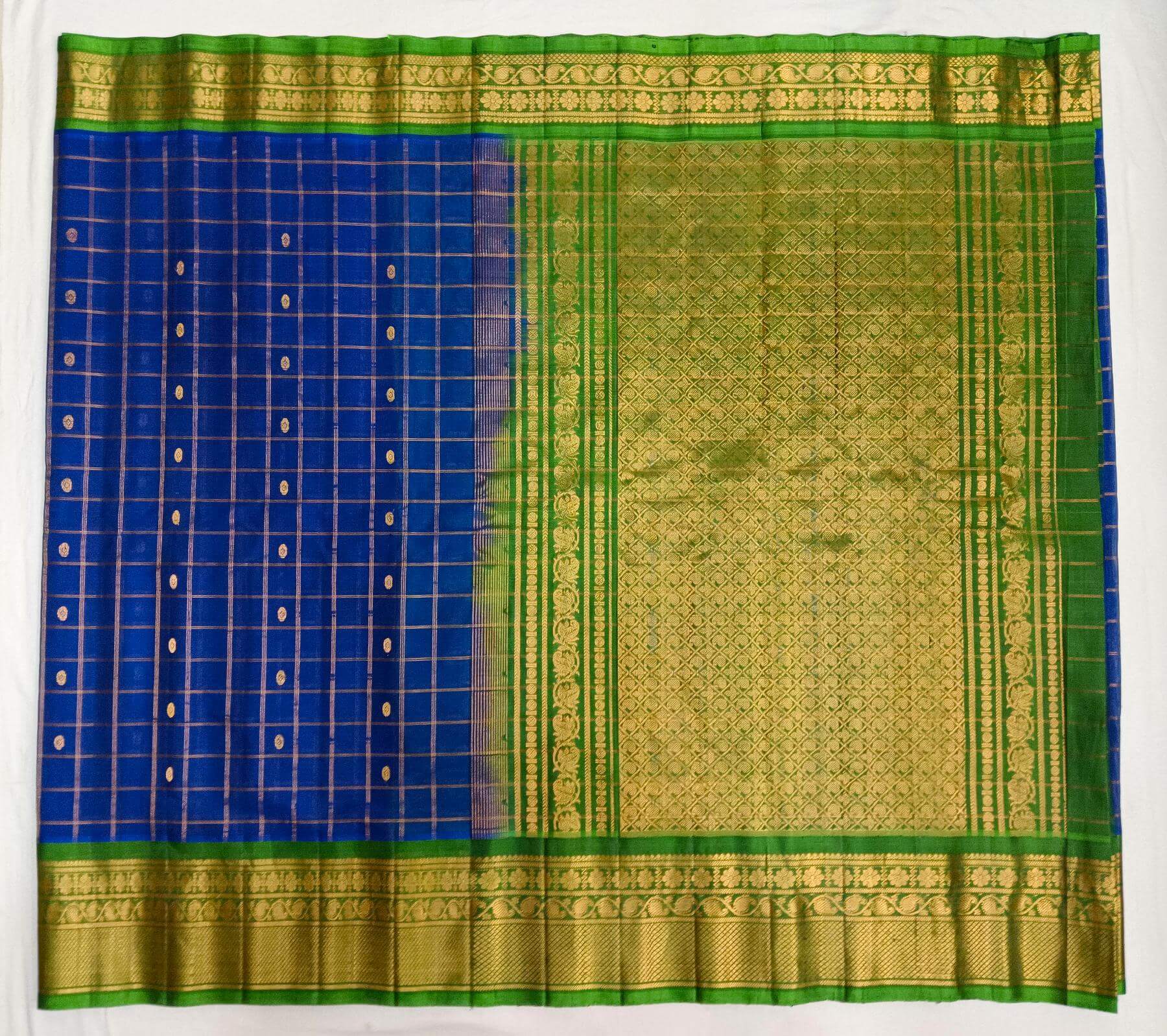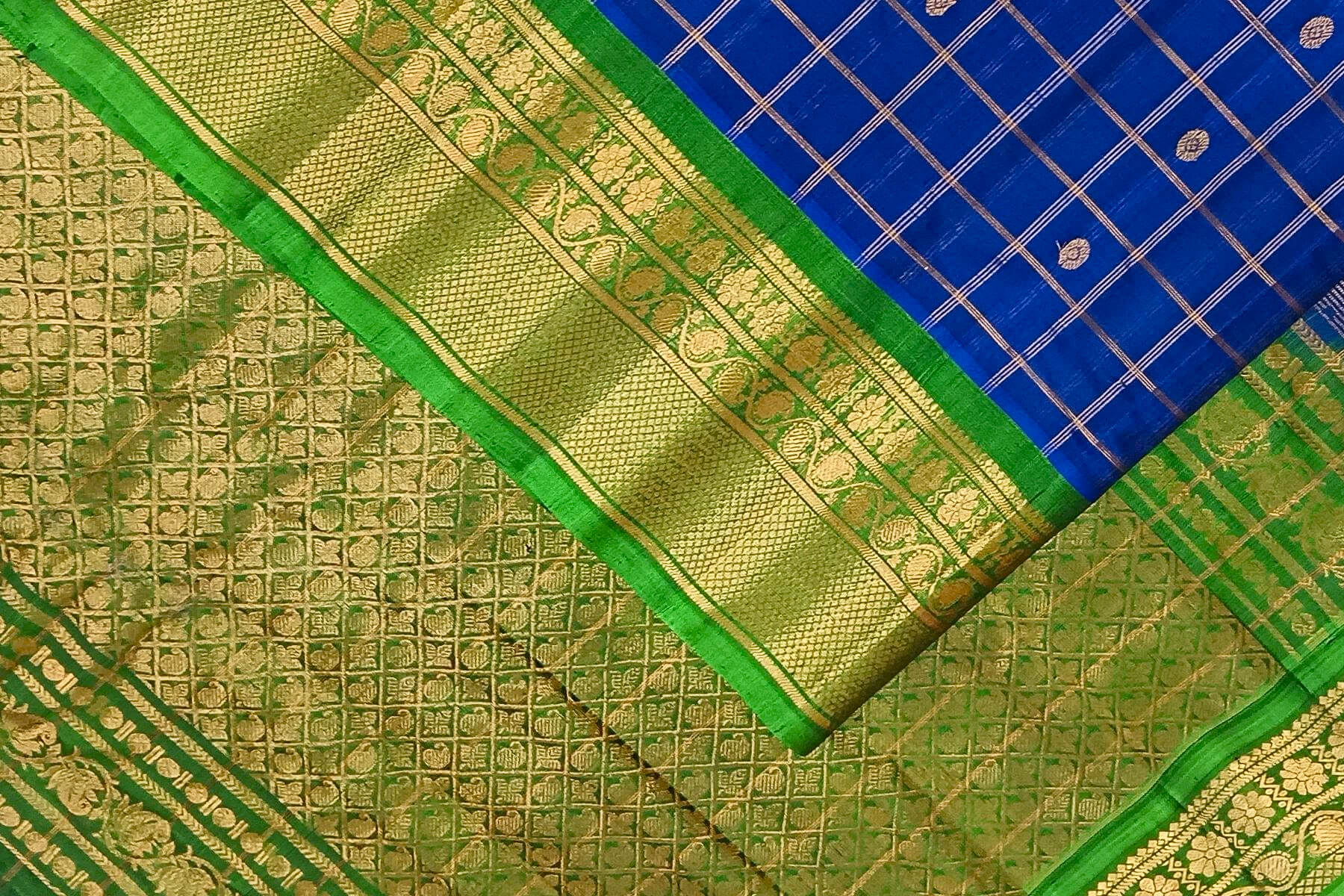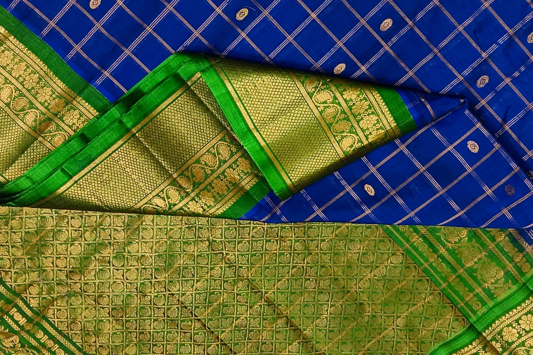 Description : Handloom Gadwal SICO ( silk cotton) saree in royal blue  & green with checks & buttis