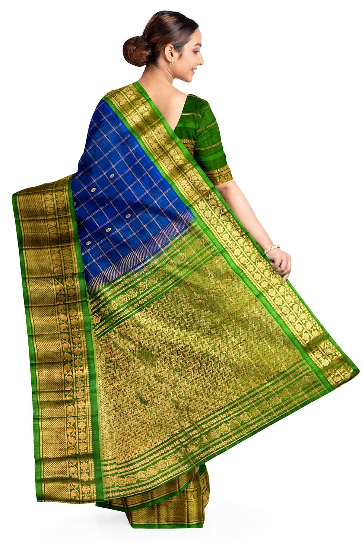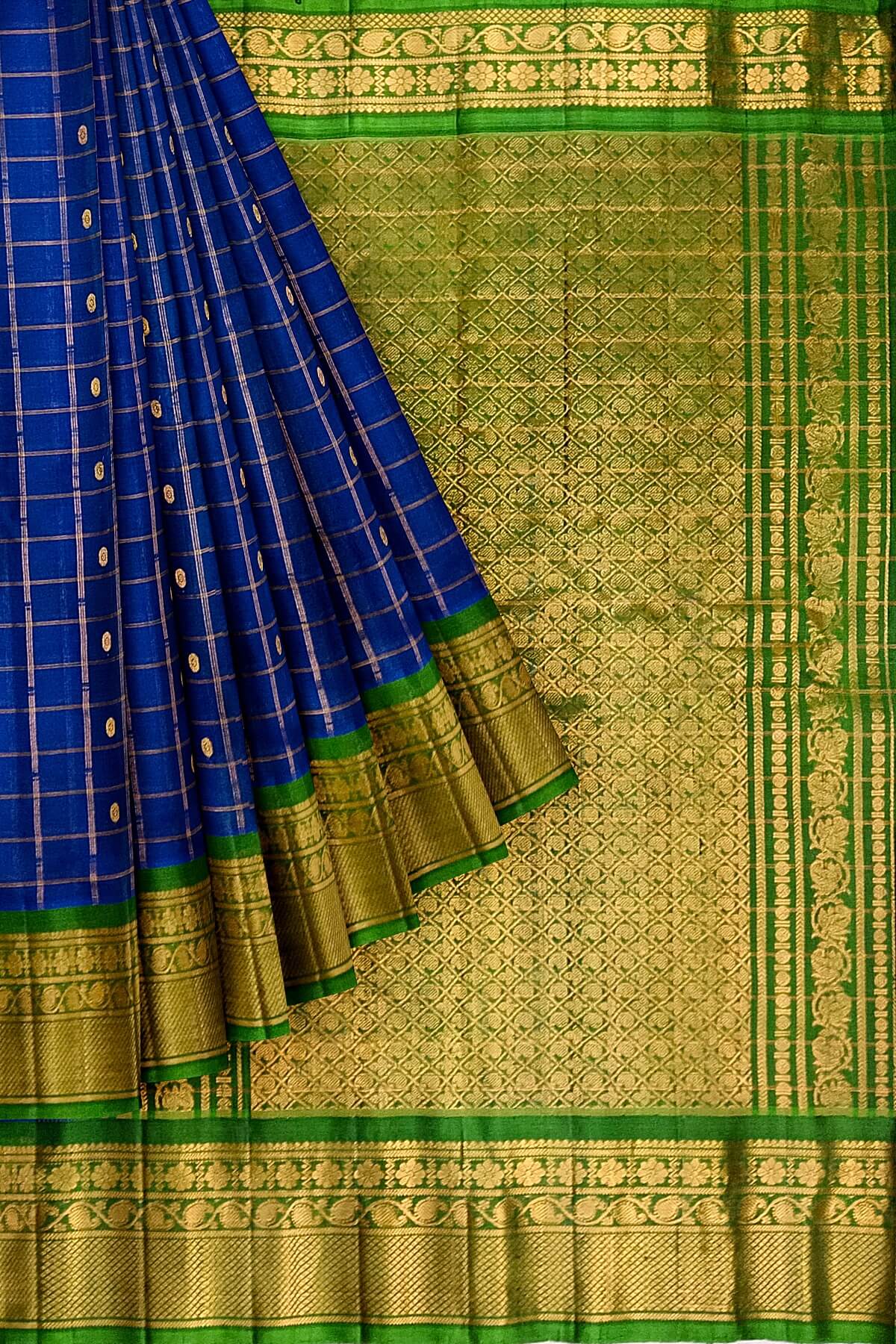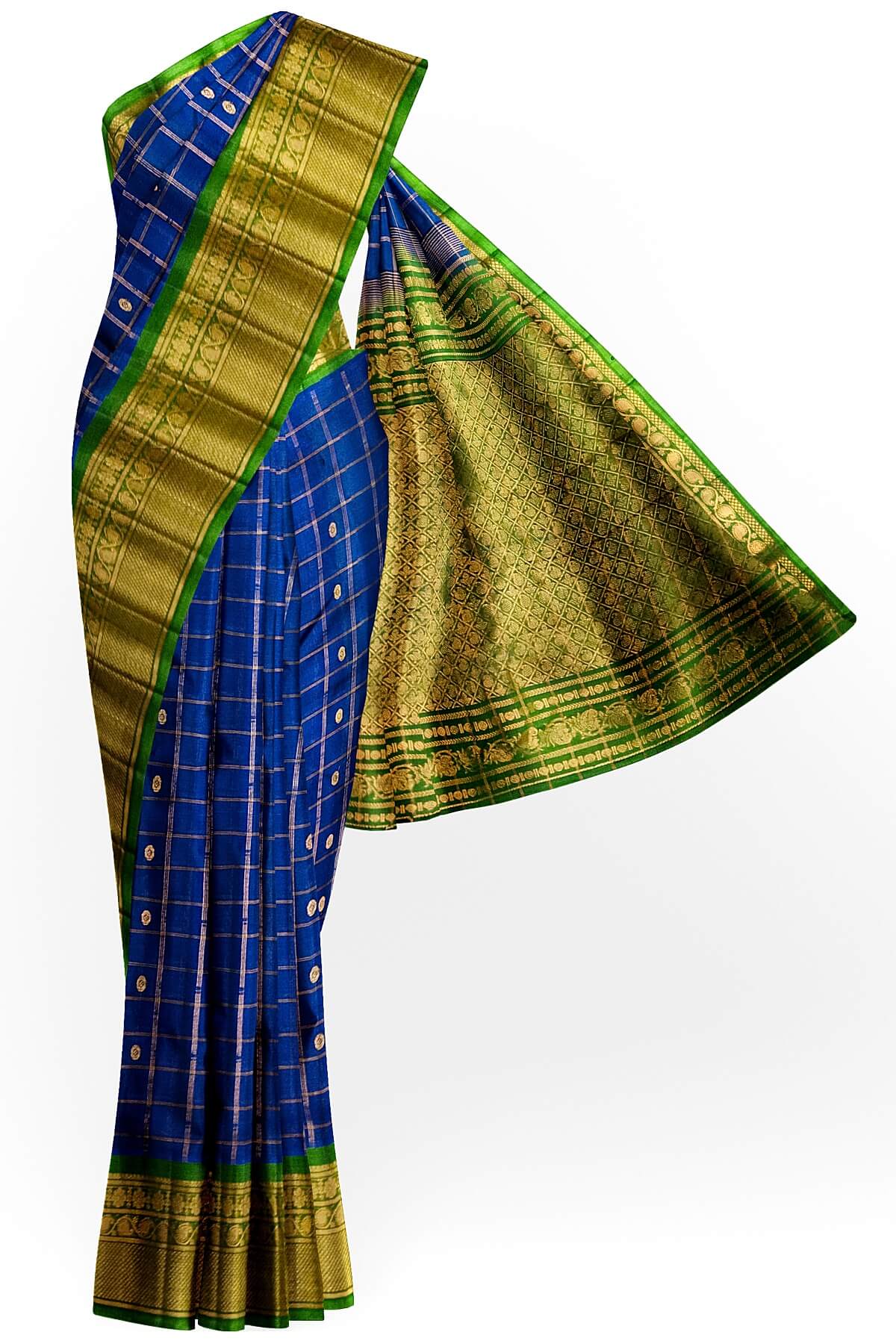 Description : Handloom Gadwal SICO ( silk cotton) saree in royal blue  & green with checks & buttis